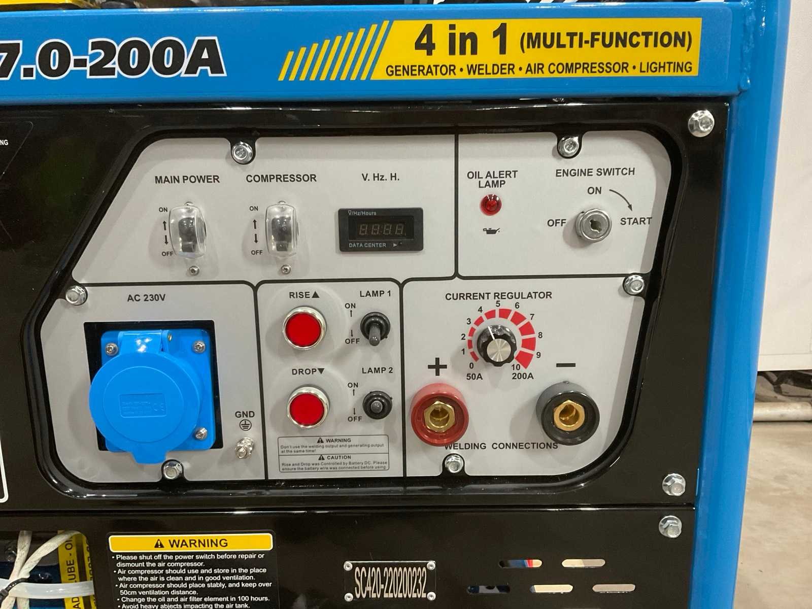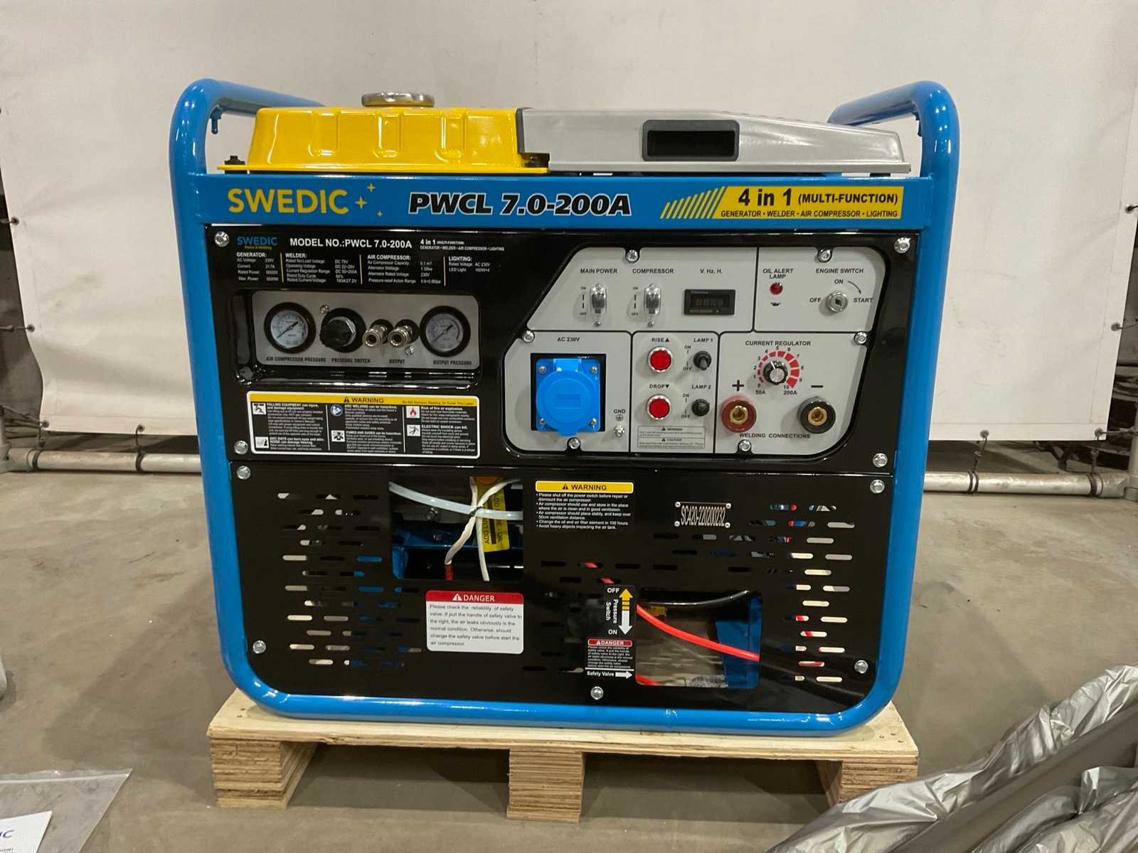 Ongebruikt; zonder lampen Generator, lassen, luchtcompressor. 3 functies op één machine. Breed scala aan toepassingen. Voor DC-lassen en AC-generatoruitgang en luchtcompressor kan AC 5,0 kW gestaag worden afgegeven. MDS-gelijkrichterstructuur, eenvoudig onderhoud en hoog rendement. AVR voor stuurspanning. Gemakkelijke start en laag brandstofverbruik. Compacte structuur voor eenvoudig transport. Tweetraps luchtcompressor voor hoog pneumatisch gereedschap. 20L grote tank voor een hoger rendement van de luchtcompressor. Het kan een 4,0 mm elektrode langdurig lassen. Specificatiesgenerator Nominale spanning: AC 230V Nominaal vermogen: 5000 W Maximaal vermogen: 5500 W Nominale stroom: 21,7A Frequentie: 50 Hz Vermogensfactor: 1,0 Specificaties Lasser Niet-belaste spanning: 75 Lasspanning: 22-28V Stroombereik: 50-200A Nominale inschakelduur: 50% Specificaties Luchtcompressor Capaciteit luchtcompressor: 0,1 m³ Dynamovermogen: 1,35 kW Druk: 115PSI Drukontlastingsactiebereik: 0,6 ~ 0,8 MPa Specificaties Motor Koelsysteem: luchtkoeling Luchtventiel: OHV Ontstekingssysteem: CDI Inhoud brandstoftank: 30 Oliewaarschuwingssysteem: JA Brandstofverbruik: 374 (g/pk.uur) Startmodus: elektrisch/terugslag Merk: Swedic Type: PWCL 7.0-200A Benzine: true Afgelezen urenstand: 0 Machinegewicht: 153kg Totale afmeting L: 850mm Totale afmeting Breedte: 600mm Totale afmeting Hoogte: 780mm