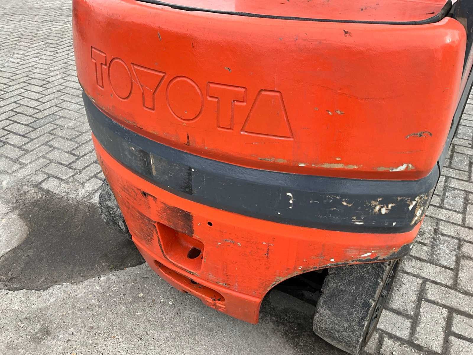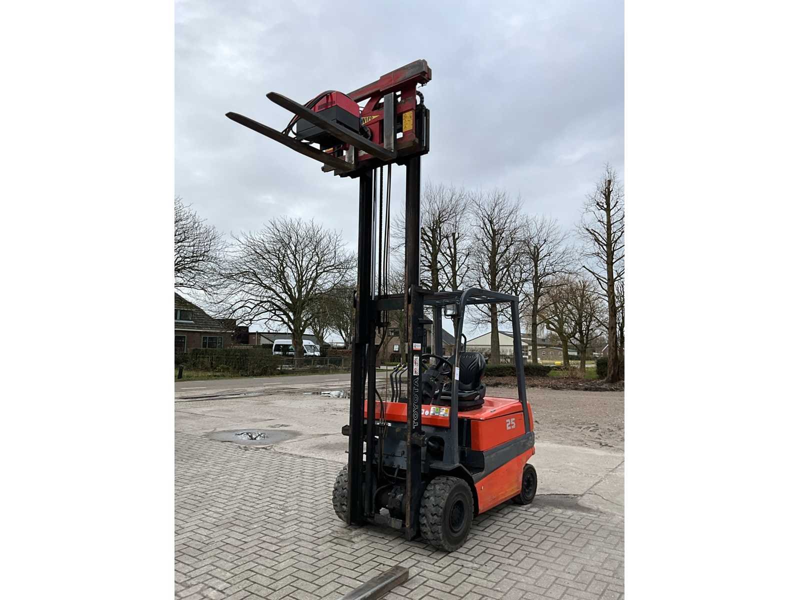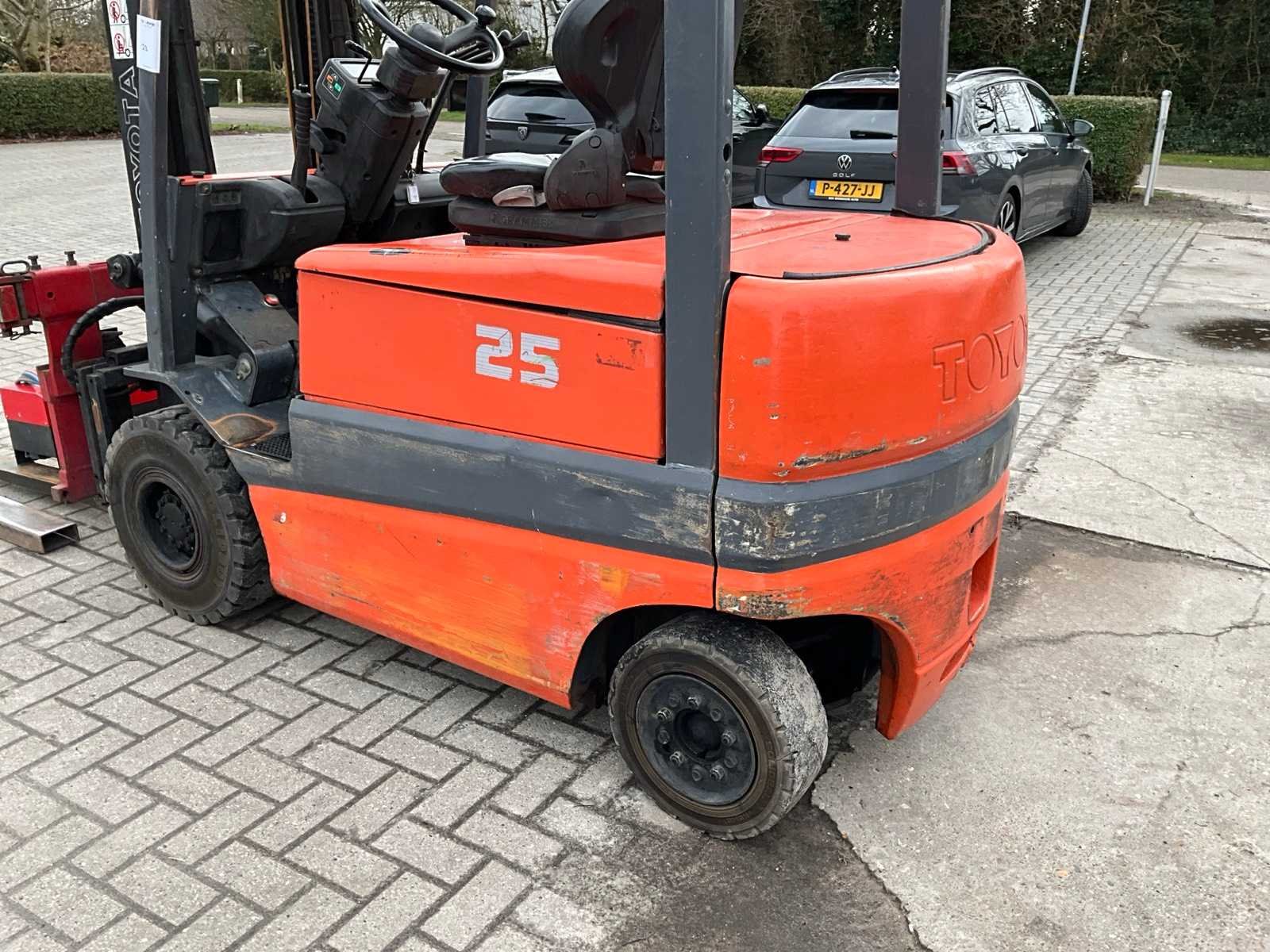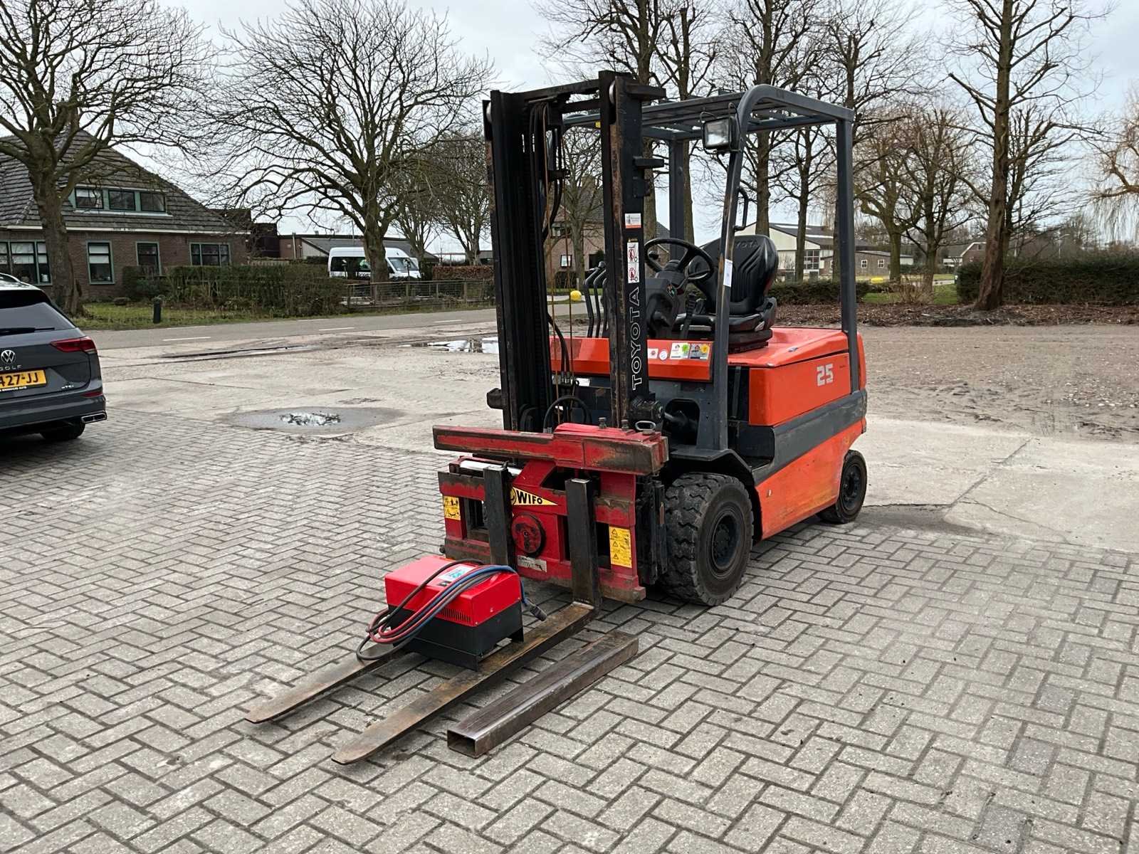 Voorzien van WIFO roterend vorkenbord, Merk: Toyota Type: FBMF25 Bouwjaar: 1998 Serienummer: FBMF25-10958 Brandstof: Elektrisch Mast: Duplex Soort band: Volrubber banden Aantal wielen: 4 Afgelezen urenstand: 15223 Accu lader: true Side-shift: true Roterend vorkenbord: true Duplex mast: true Hefvermogen: 2325kg Lepellengte: 1200mm Hefhoogte: 3300mm Vol rubber banden: true Minimale doorrijhoogte: 2160mm Totale afmeting L: 3900mm Totale afmeting Breedte: 1150mm