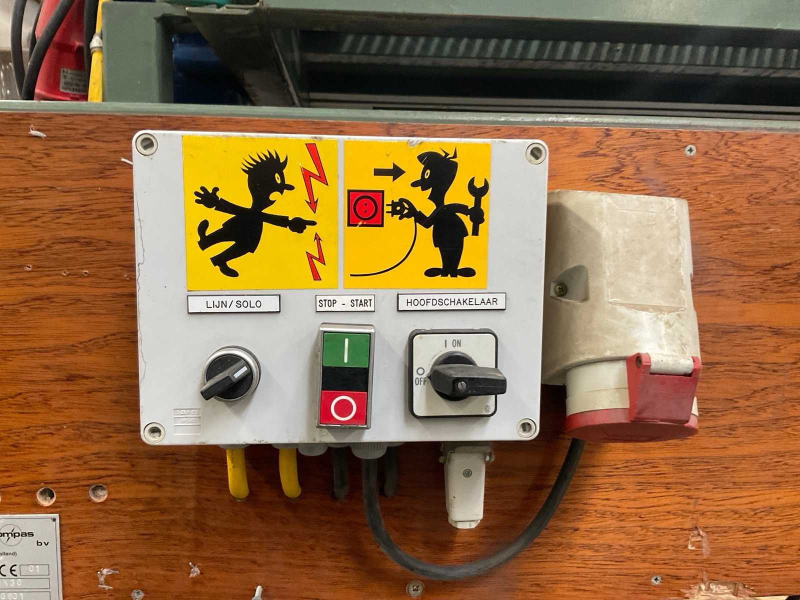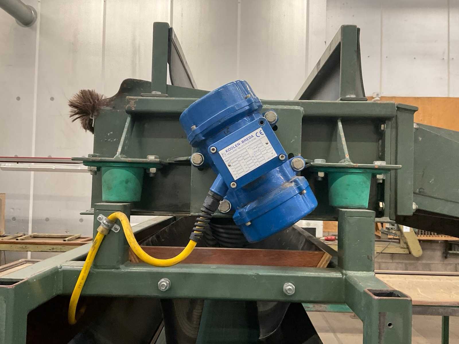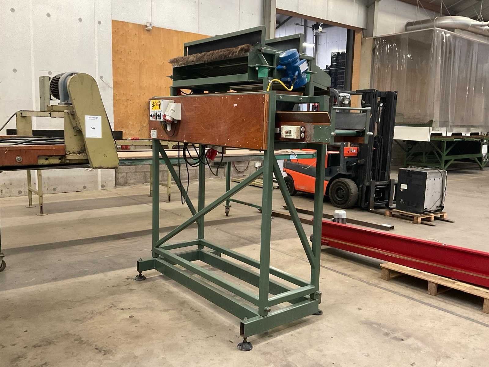 Werkbreedte 1000 mm; v.v. dwarsgelegen uitvoer transportband; band afm. ca. 1600x300 mm; 400V Merk: Compas Type: TZ 100x30 Bouwjaar: 2001 Totale afmeting L: 2000mm Totale afmeting Breedte: 1200mm Totale afmeting Hoogte: 2200mm