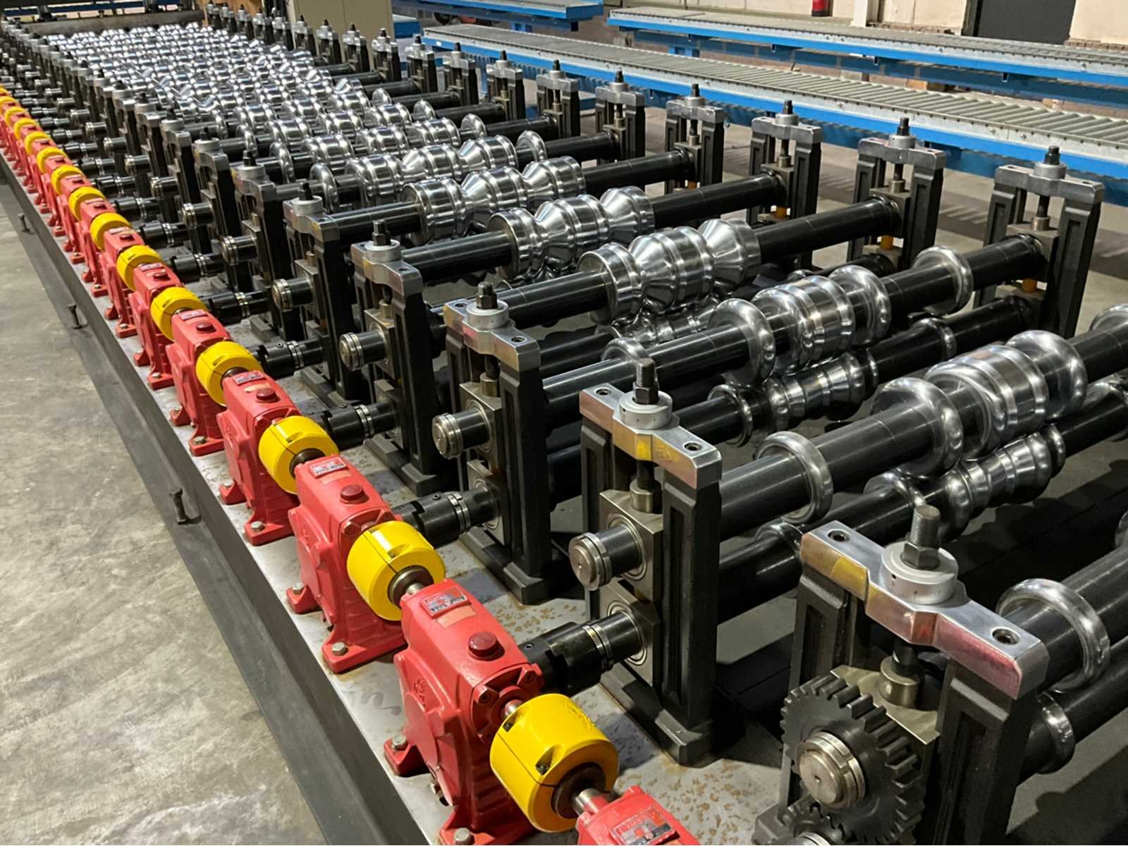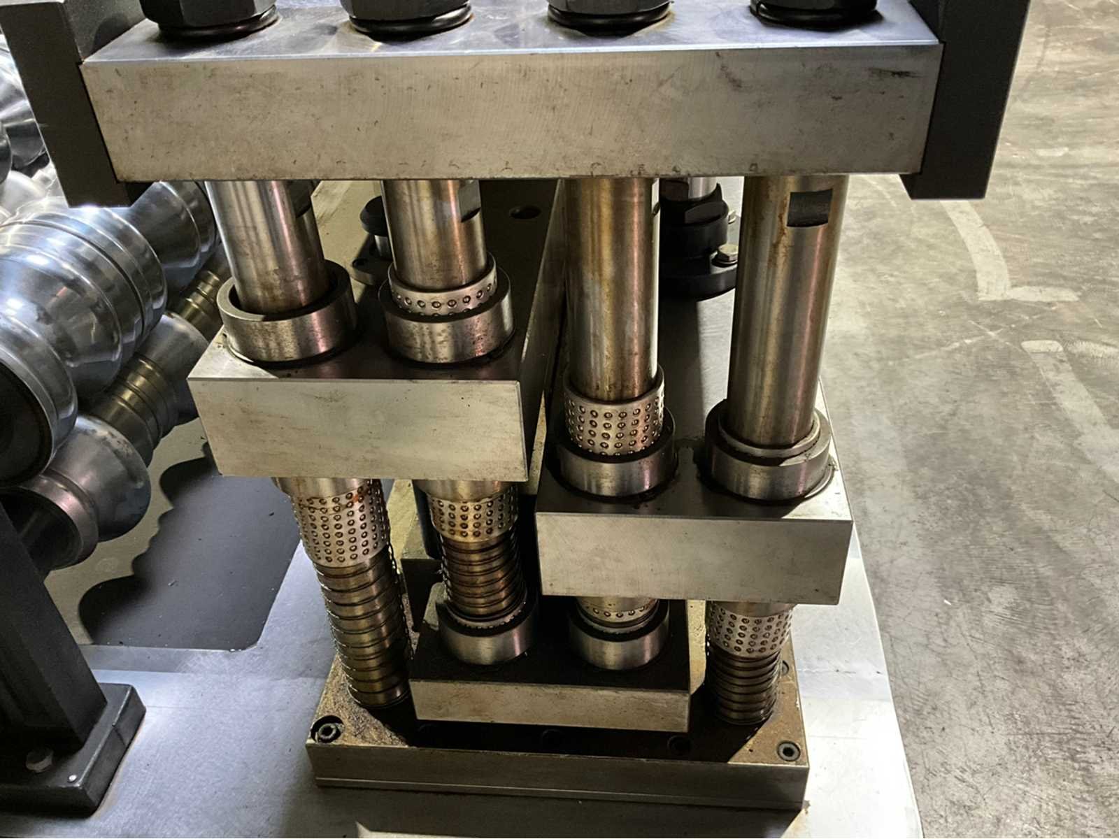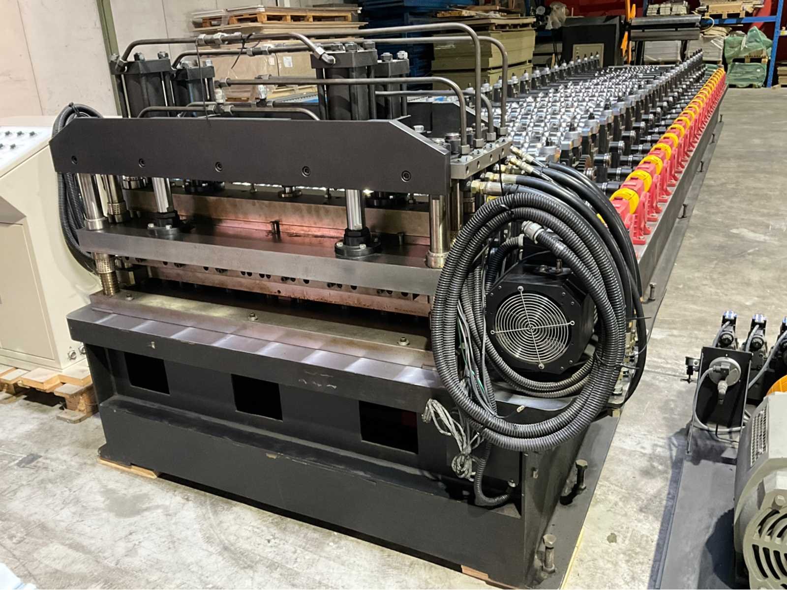 Verstelbaar aanvoerstation met 5 rollen (1500x600x250) Werkbreedte 1200 mm. 22 rolstations met dubbele horizontale assen. Verstelbare geleidingen. Precisie lagers per station. Cardan aangedreven rollen Hydraulische aggregaat (1520x1400x800 mm) met Tatung 22 kW FBDP-HD aandrijving. Hydraulische knipunit met dubbele stans voorzien van Leedan LDSM230D-II 15 kW servomotor. Voorzien van hydraulische decoiler (2500x1400x2000 mm, capaciteit 5000 kg. Inclusief rollenbaan (3000x1020x760 mm) Merk: Pinnacle Type: RD 1200 - ROOFDECK Productgrootte b: 1200mm Motorvermogen (kW): 22kW Aansluiting: 380V Machinegewicht: 14000kg Afmeting l: 11130mm Afmeting b: 1850mm Afmeting h: 1570mm