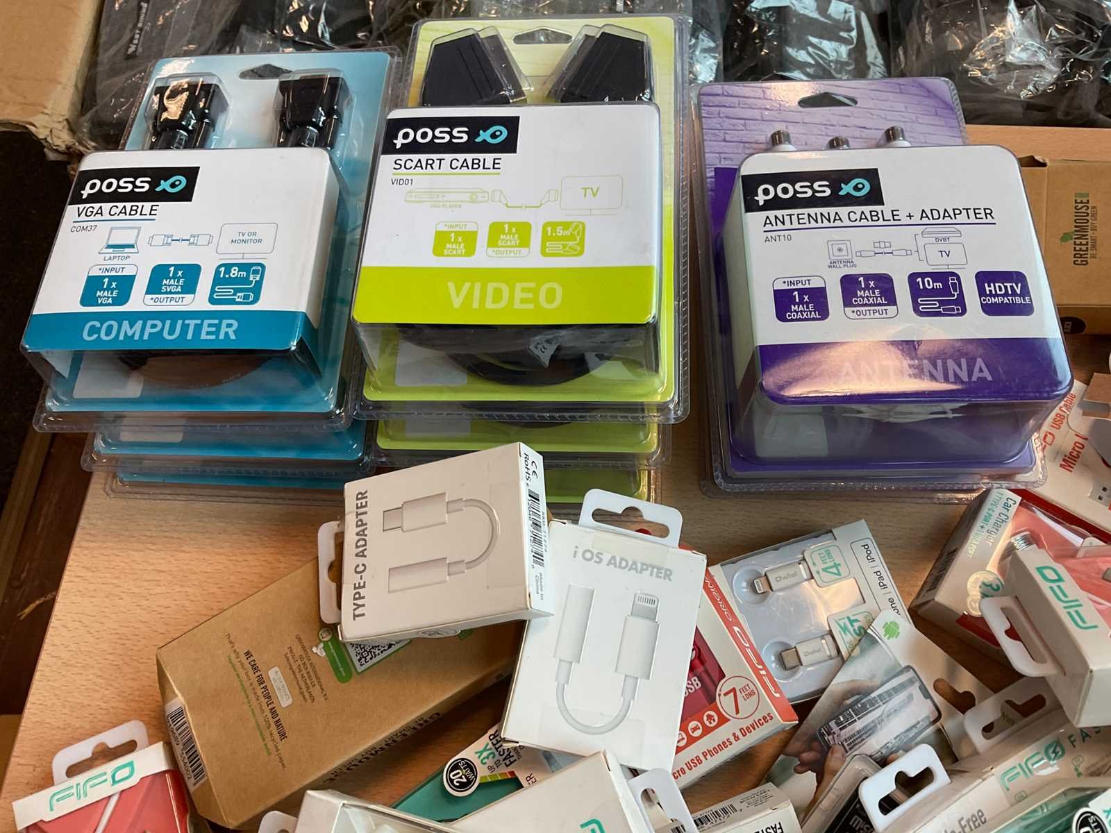 Fifo en poss en green mouse - oortje, lader, laadkabel, optical kabel, vga (100x)