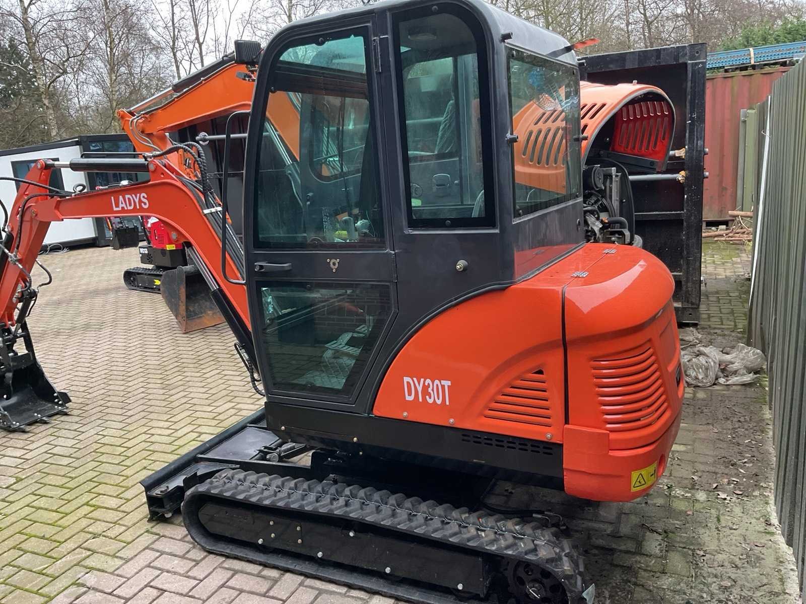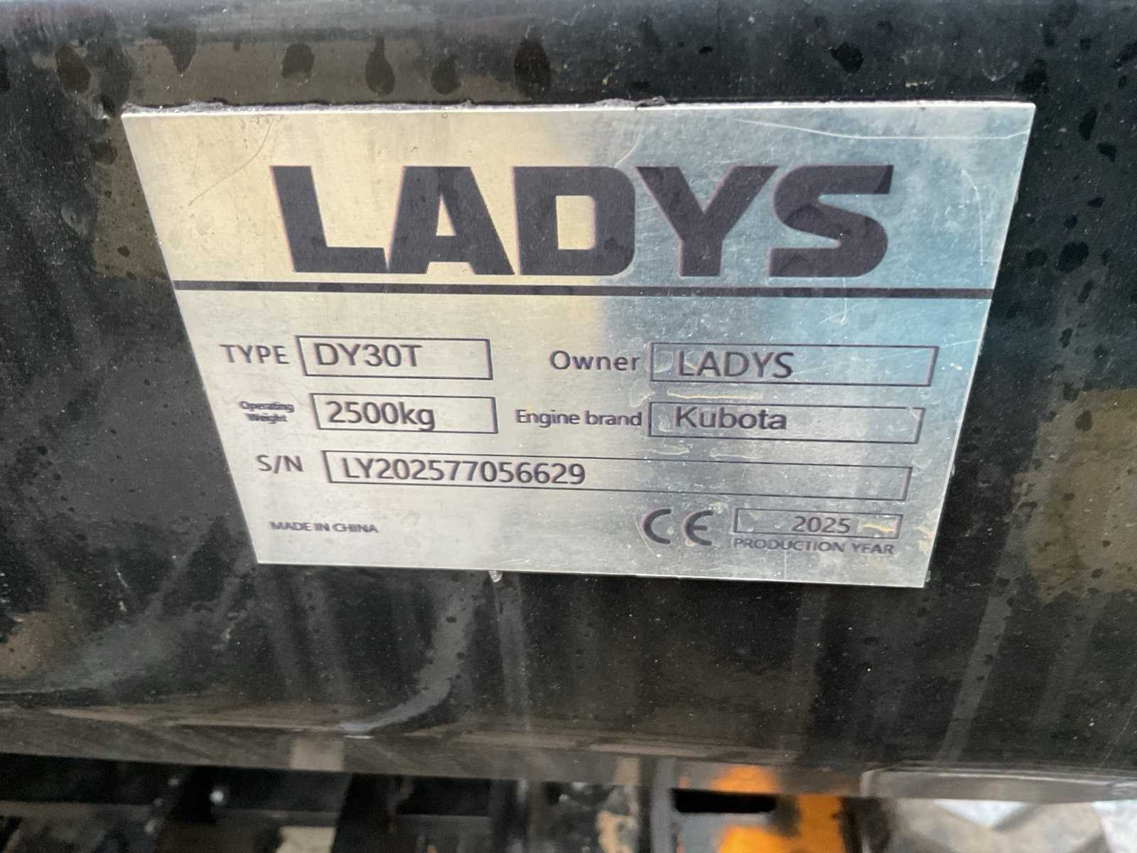 Voorzien van Kubota motor; vermogen: 14,6 kW; Machinegewicht: 3400 kg; Max. graafhoogte: 4390 mm; Max. graafradius: 4800 mm; Max. graafdiepte: 2800 mm Merk: Ladys Type: DY30T Bouwjaar: 2025 Merk motor: Kubota Motorvermogen (kW): 14.6kW Brandstof: Diesel