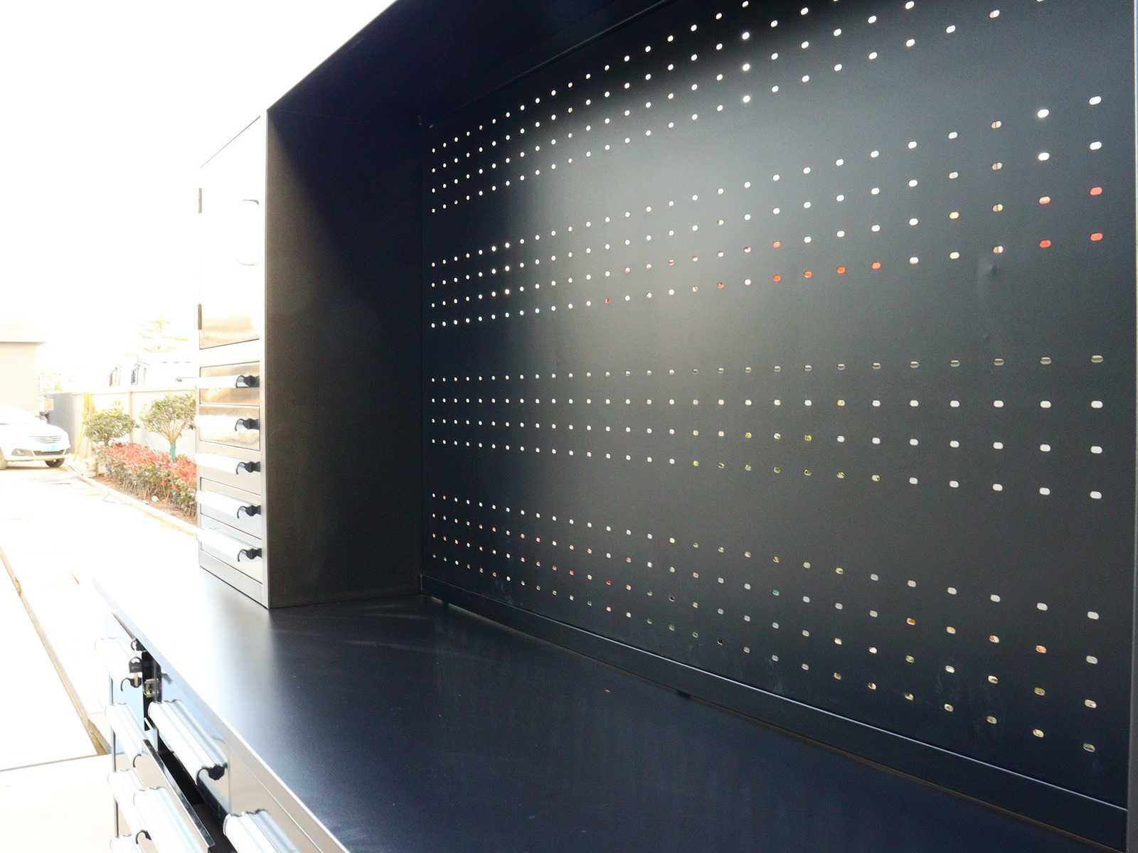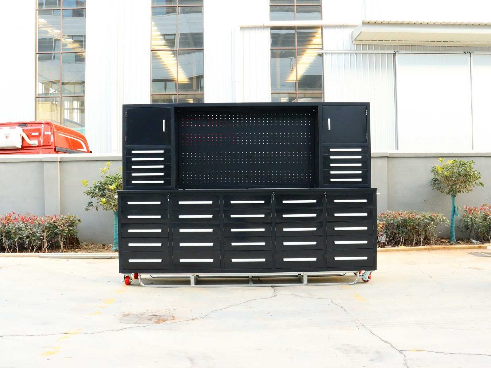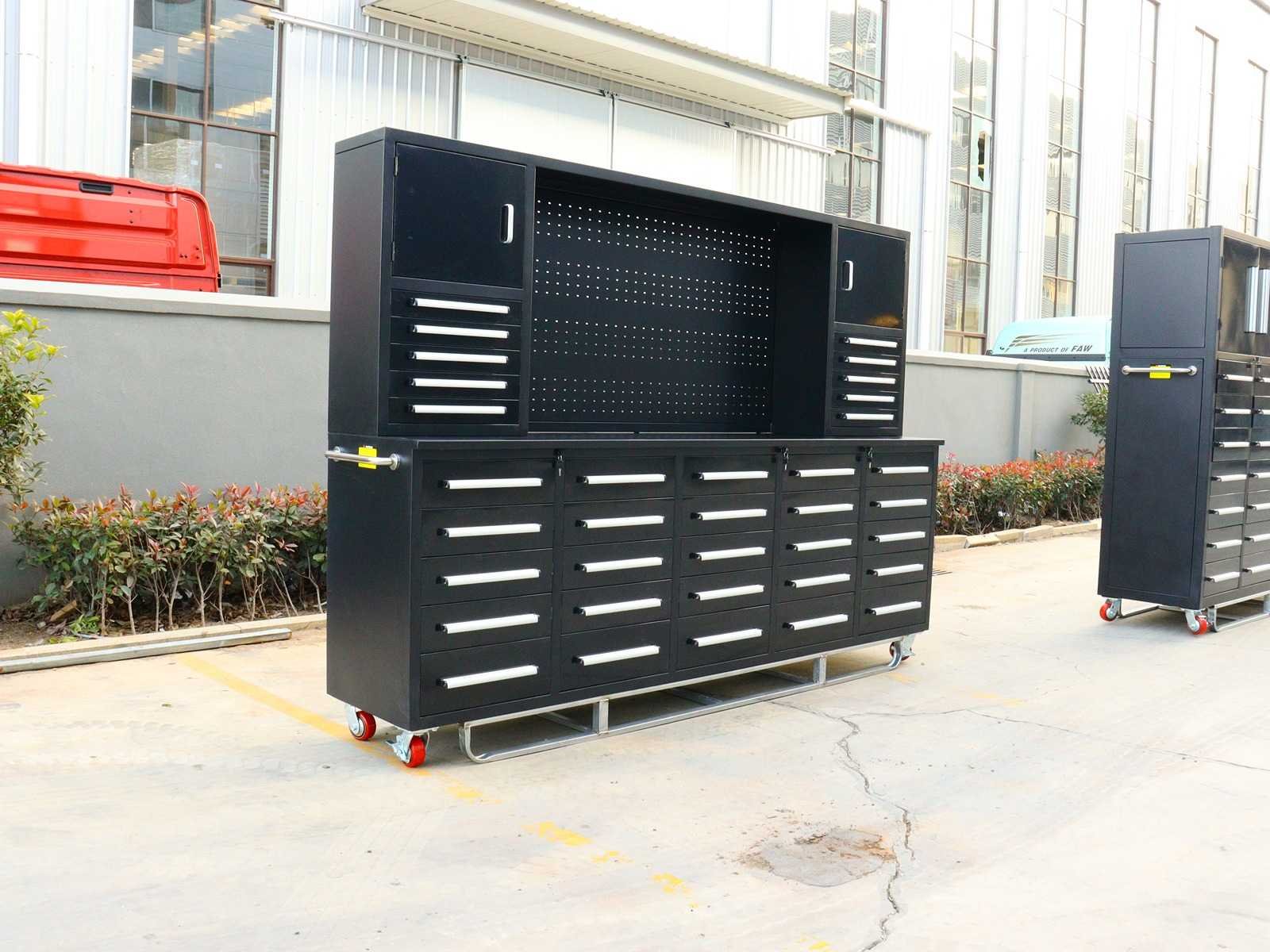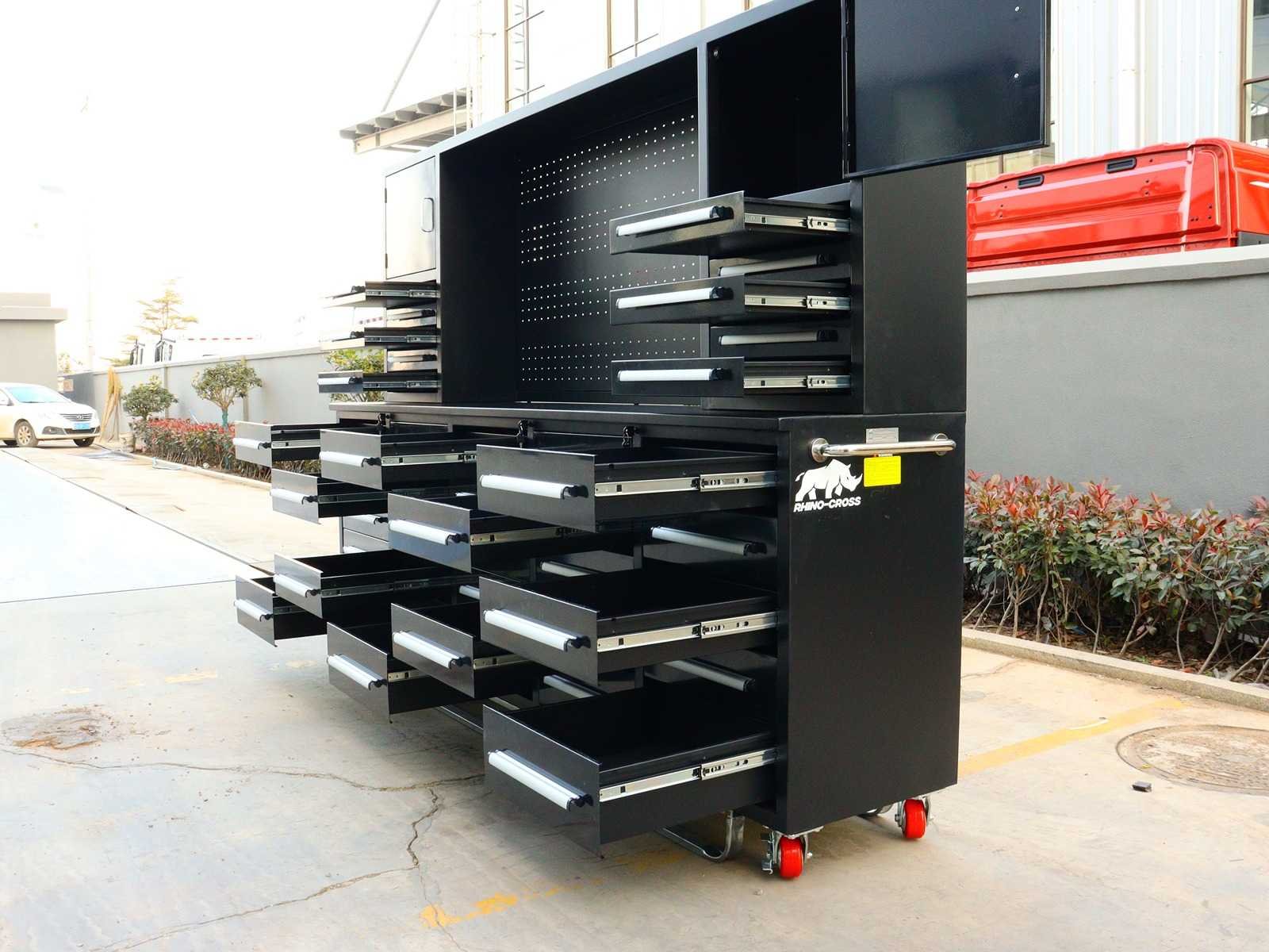 Voorzien van Gepoedercoat staal; 35 lades 2 kastdeuren; Ongebruikt (Transport afmetingen 2870x585x2050mm) Merk: Rhino-Cross-Workbench Product type: H10ft-35D-01C Zwart