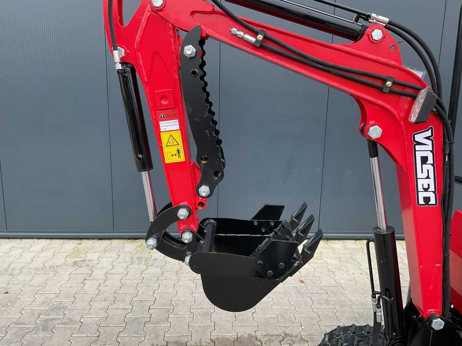 Voorzien van 2 cillinder benzine motor; 800 mm giek; extra hydraulische leidingen; aanvulblad; 180 mm rubberen rupsbanden; 400 mm graafbak; handmatige duim; ongebruikt Merk: VICSEC Type: VC13-R Aantal cilinders: 2 Brandstof: benzine