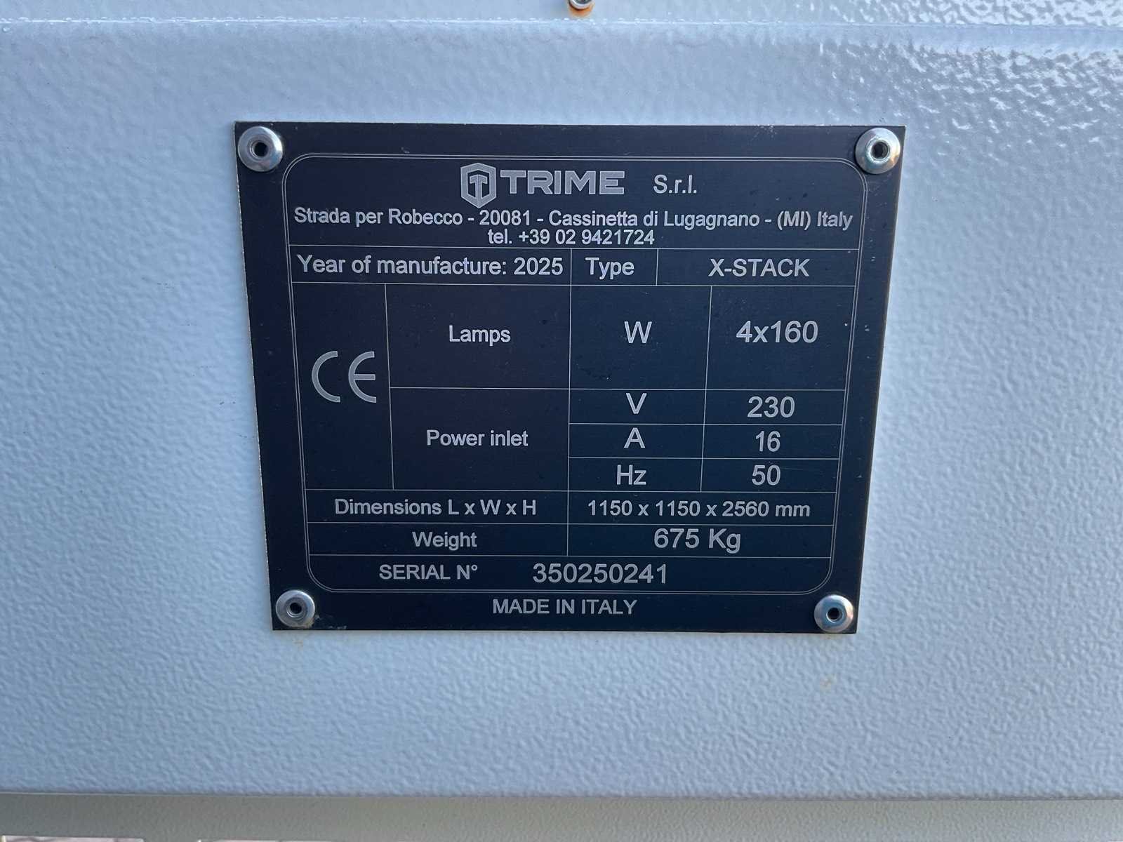 Voorzien van Lampen: 4 × 160 W; Totaal lampvermogen: 640 W; Spanning: 230 V; Stroom: 16 A; Frequentie: 50 Hz; Afmetingen (L × B × H): 1150 × 1150 × 2560 mm; Gewicht: 675 kg Merk: Trime Model: X-Stack Gewicht: 675 Lengte: 1150 Breedte: 1150 Hoogte: 2560