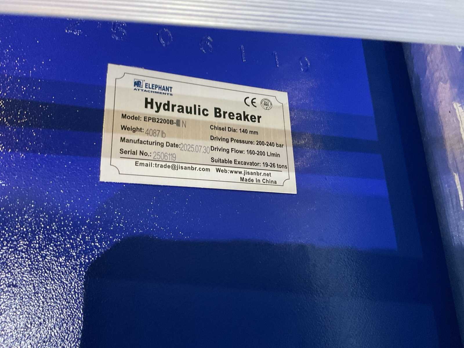 Voorzien van Beiteldiameter: 140 mm; Slangdiameter: 1 inch; Werkdruk: 200–240 bar; Oliestroom: 160–200 L/min; Gewicht breker: 1.875 kg; Slagfrequentie 320–650 bpm; Ongebruikt Merk: Elephant Type: EPB2200-N Bouwjaar: 2025