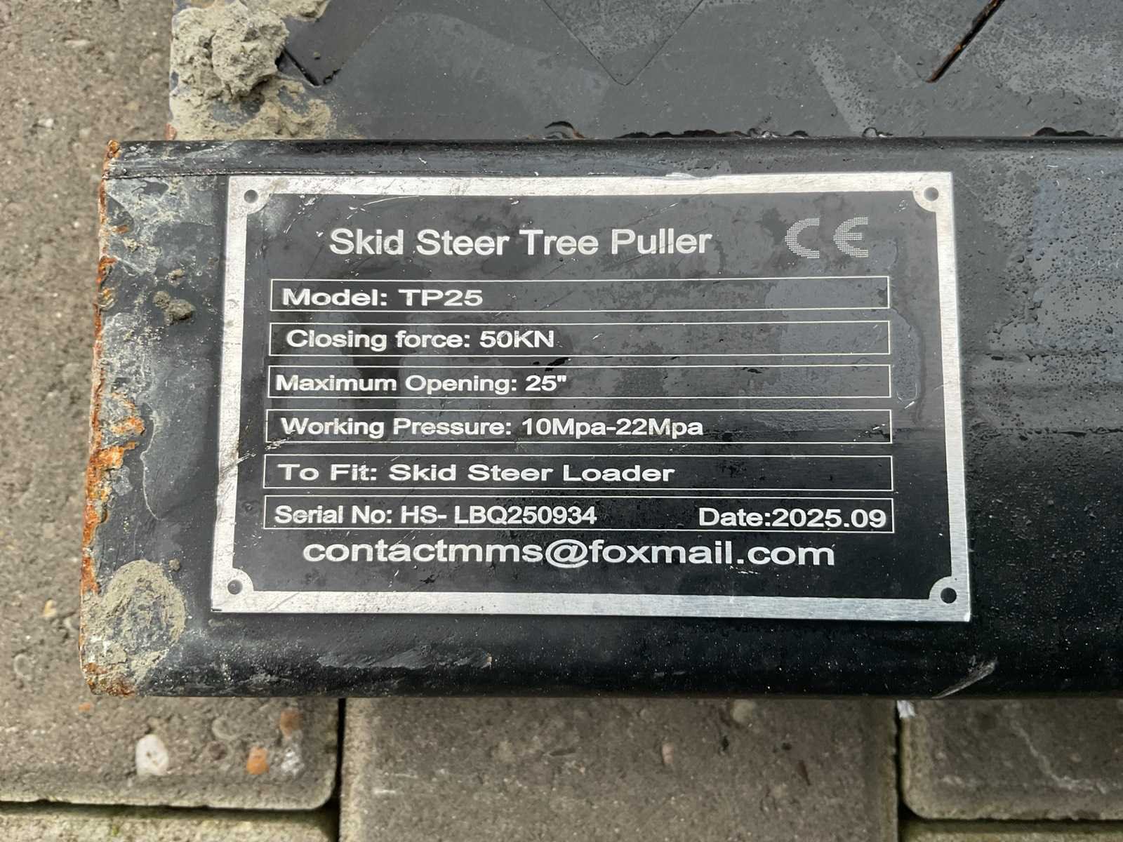 Voorzien van boomtrekker schranklader; Sluitkracht: 50 kN; Max. opening: 635 mm; Werkdruk: 10–22 MPa Merk: Giyi Type: TP25 skid steer tree puller