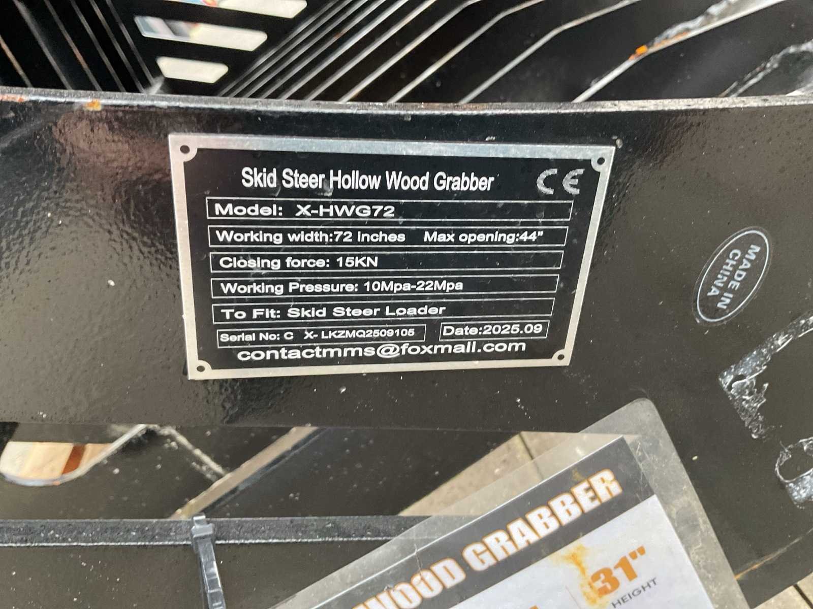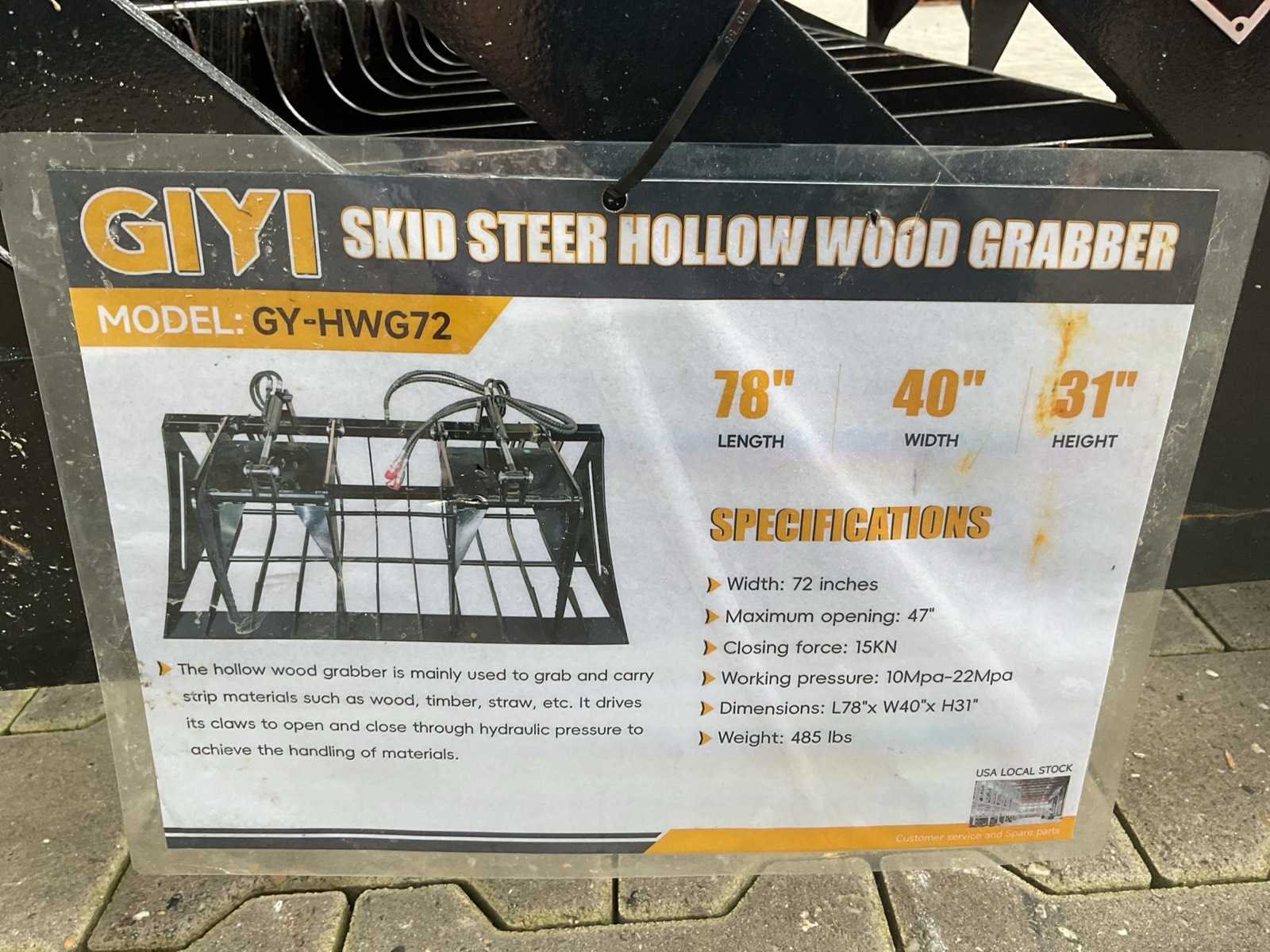 Voorzien van houtgrijper schranklader; werkbreedte: 1829 mm; maximum opening: 1194mm; sluitkracht: 15kN; werkdruk: 10-22 MPa; afmetingen: 1981 × 1016 × 787 mm; gewicht: 220 kg; ongebruikt Merk: Giyi Type: X-HWG72 Skid steer hollow wood grabber