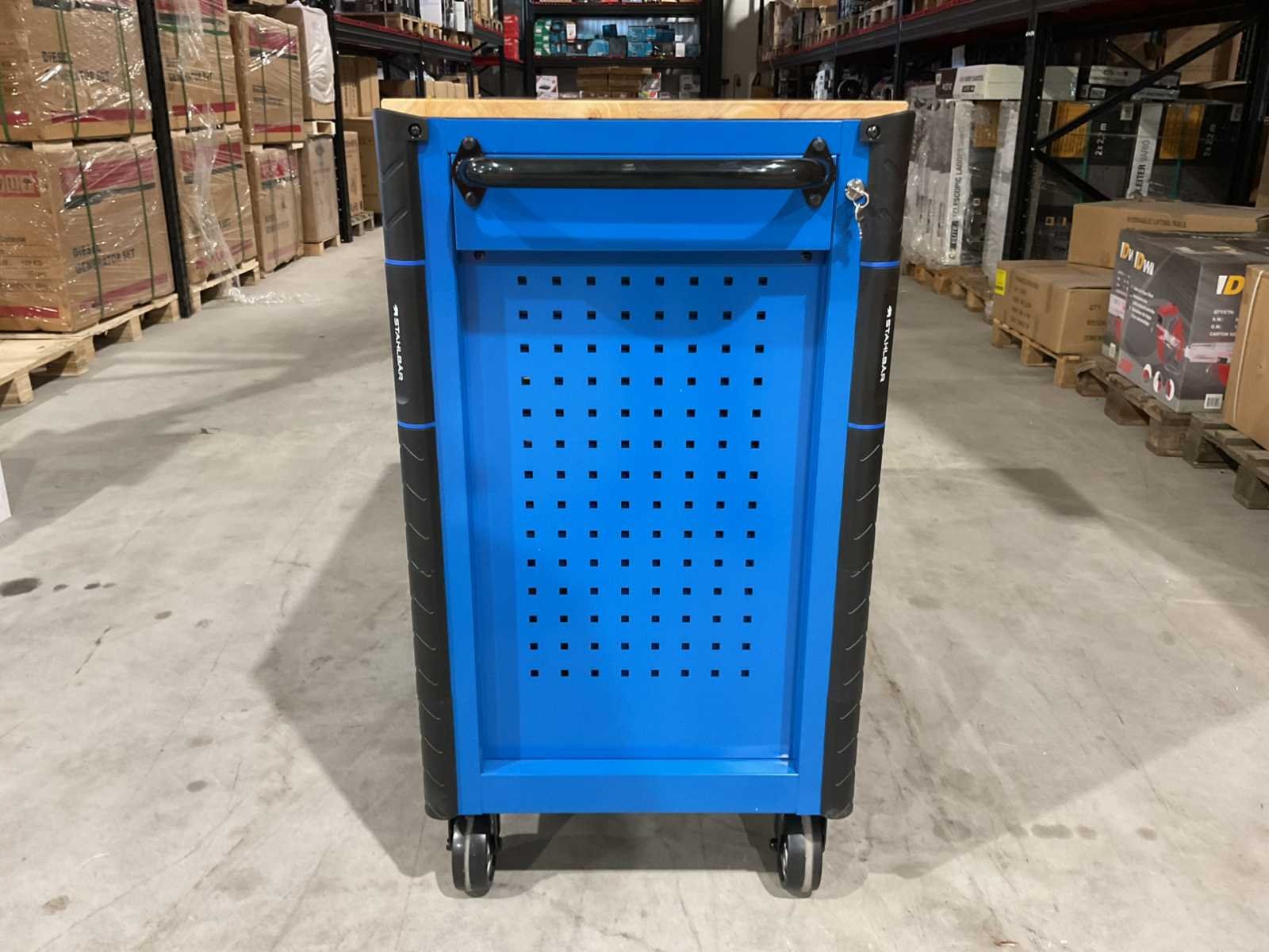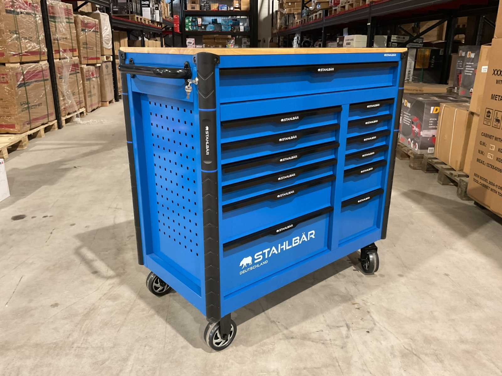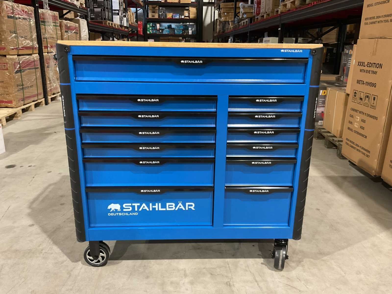 Voorzien van 13 lades waarvan 10 gevuld met gereedschap; professioneel chroom-vanadium gereedschap; heavy duty gereedschapswagen; houten werkblad; 4 wielen; stevig handvat; ongebruikt in doos (transport afmetingen 115x50x100 cm) Merk: Stahlbär Type: Deutschland XXXL PRO Bouwjaar: 2025 Aantal laden: 13 Met inhoud: true Eigen gewicht: 138kg Totale afmeting L: 1150mm Totale afmeting Breedte: 500mm Totale afmeting Hoogte: 1000mm