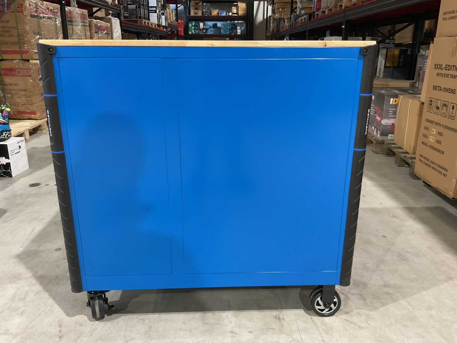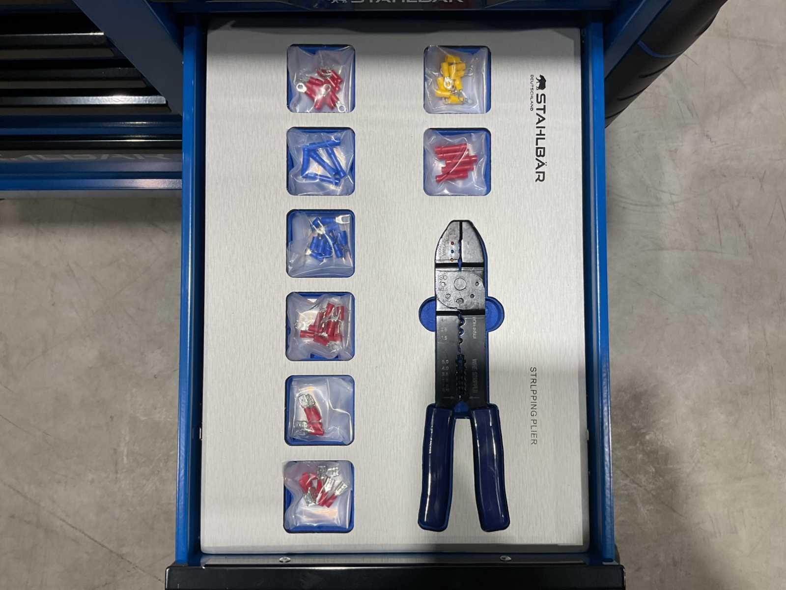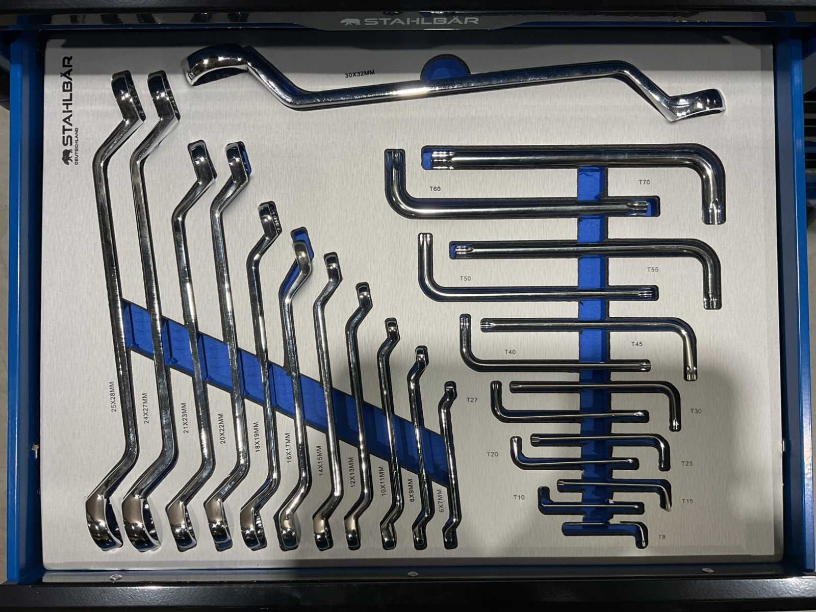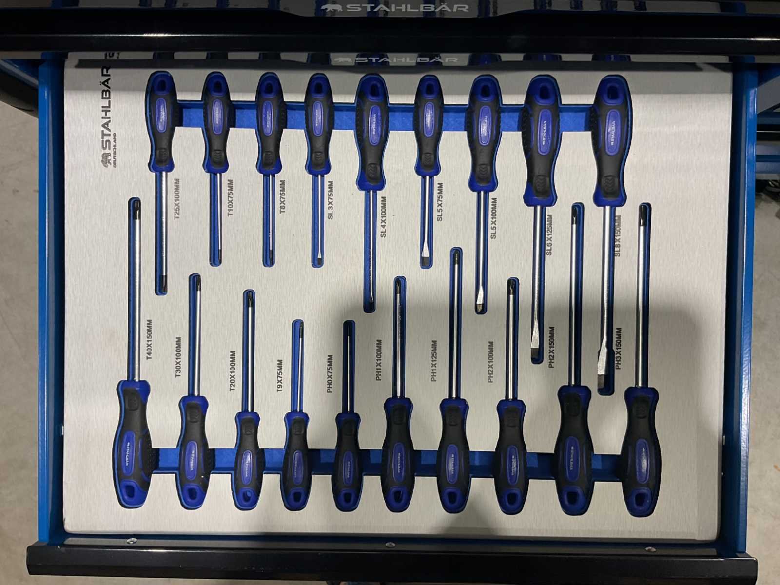 Voorzien van 13 lades waarvan 10 gevuld met gereedschap; professioneel chroom-vanadium gereedschap; heavy duty gereedschapswagen; houten werkblad; 4 wielen; stevig handvat; ongebruikt in doos (transport afmetingen 115x50x100 cm) Merk: Stahlbär Type: Deutschland XXXL PRO Bouwjaar: 2025 Aantal laden: 13 Met inhoud: true Eigen gewicht: 138kg Totale afmeting L: 1150mm Totale afmeting Breedte: 500mm Totale afmeting Hoogte: 1000mm
