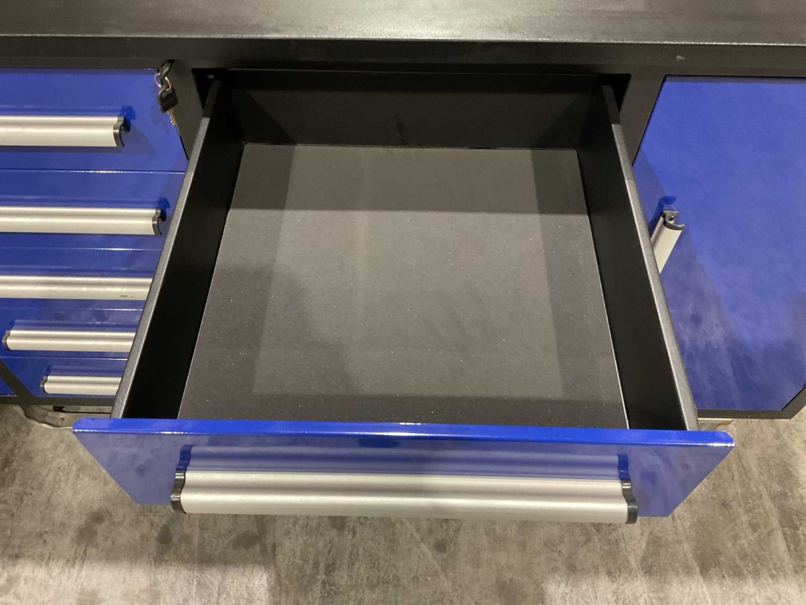Voorzien van Gepoedercoat staal; 10 lades; 2 staande kasten; Sleutels voor afsluiten; Ongebruikt met schade Merk: Stahlworks Type: 10 lades 2 deuren Blauw