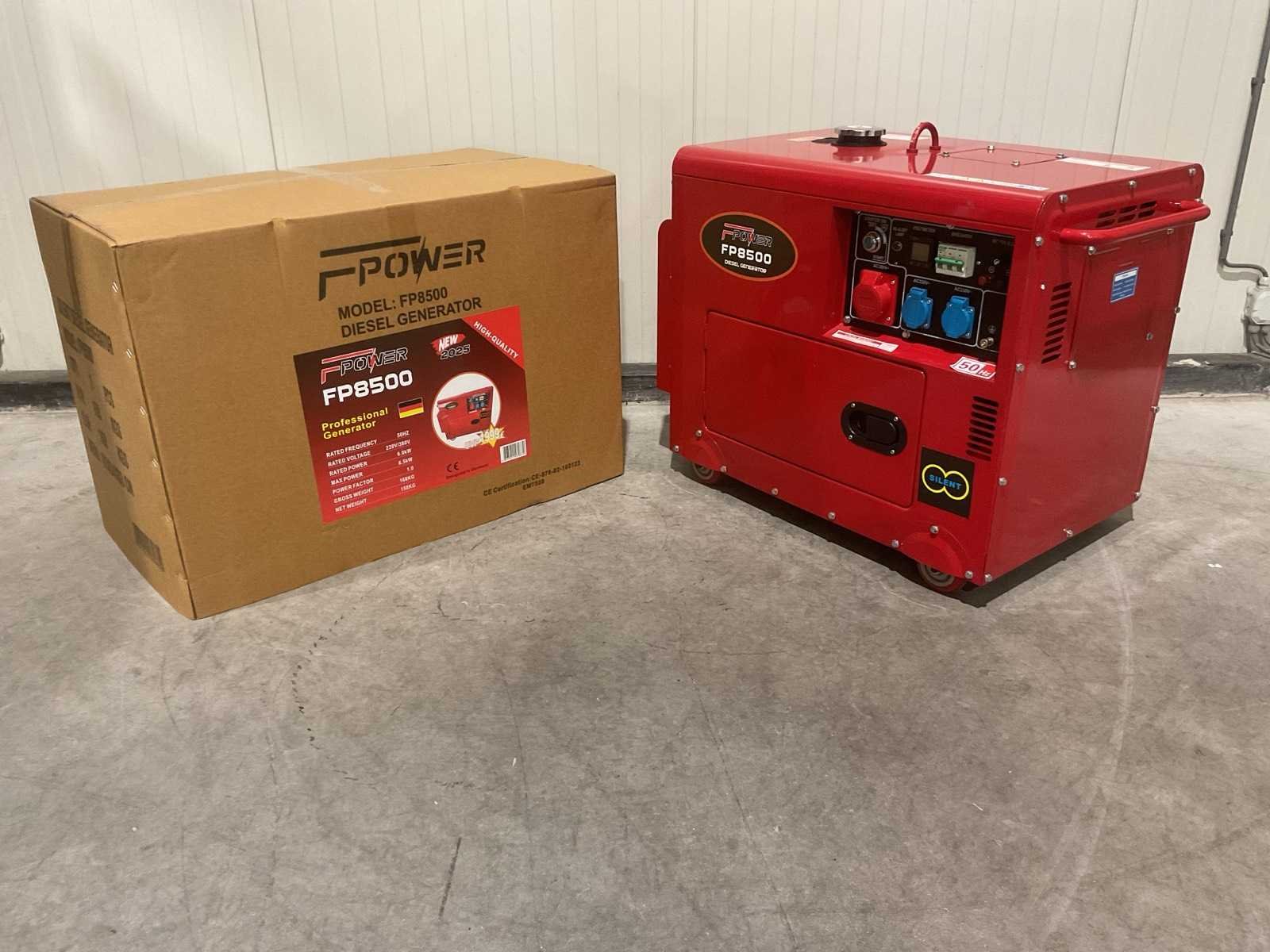 Voorzien van Frequentie: 50 Hz; Spanning: 220V / 380V (1-fase & 3-fase); Maximaal vermogen: 6,5 kW; Power factor: 1.0; Spanningsregeling: AVR (automatisch); Motortype: 4-takt dieselmotor; Koeling: Luchtgekoeld; Injectie: Directe diesel-injectie; Start: Elektrisch; Transport: 168 kg (91x54x63) cm; Ongebruikt Merk: Fpower Type: FP8500 Diesel: true