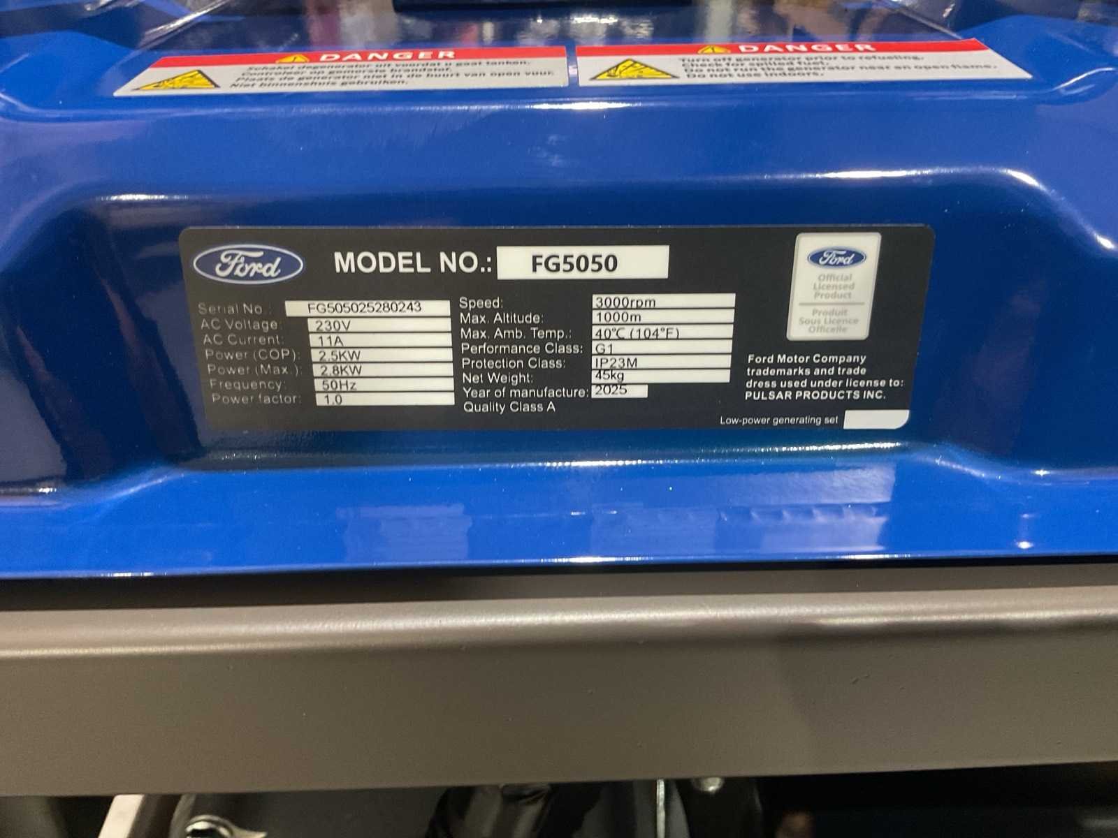 Voorzien van Brandstof Benzine motor; Brandstof consumptie 0.7 l/h; Frequentie 50 Hz; Geluidsniveau 90 dB; Tank inhoud 15 l; MPN (Manufacturer Part Number) FG5050; Vermogen 2800 W; Voltage 230 V; Vereidbaar met 2 wielen; Ongebruikt in doos Merk: Ford Type: FG5050 Bouwjaar: 2025 Benzine: true Type motor: 208cc OHV, 4-takt, luchtgekoeld Motorvermogen (kW): 2.5kW Luchtgekoeld: true Handboek aanwezig: true Machinegewicht: 50kg Totale afmeting L: 670mm Totale afmeting Breedte: 465mm Totale afmeting Hoogte: 510mm