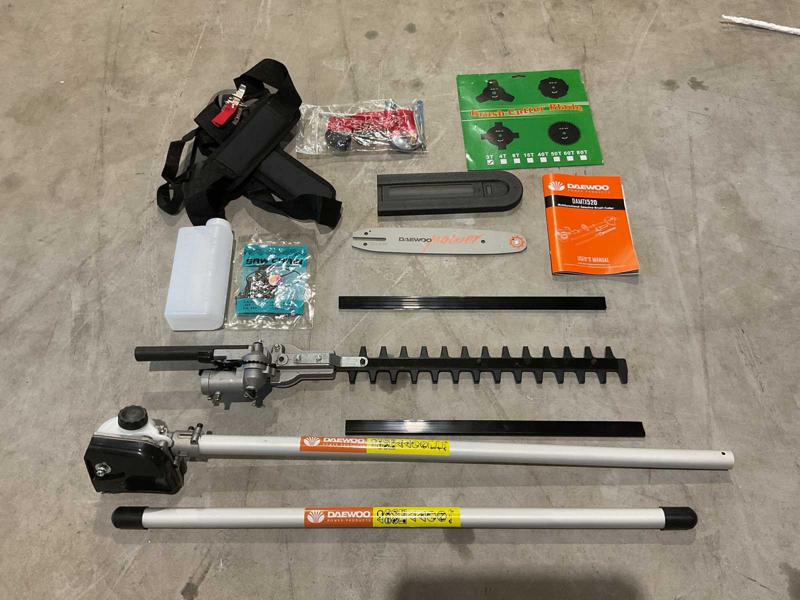 Voorzien van nylon lijn; heggen trimmer; ketting zaag; trim blad; Ongebruikt in doos (Afmeting transport verpakking 325x1095x305 mm lxbxh, gewicht 15 kg) Merk: Daewoo Type: DAMTX520 Bouwjaar: 2025 Brandstofmotor aangedreven: true Brandstof: Benzine Motorvermogen (kW): 1.45kW Eigen gewicht: 14.7kg Totale afmeting L: 325mm Totale afmeting Breedte: 1095mm Totale afmeting Hoogte: 305mm