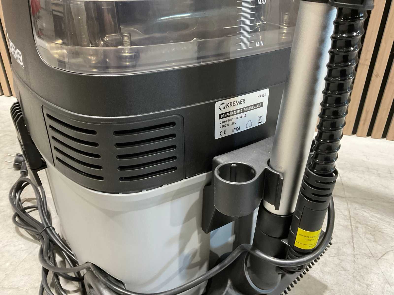 Voorzien van nat en droog functie; bescherming tegen oververhitting; Nat- en droog stofzuiger; Stoom functie; Sproei functie; Inhoud 30 Liter; Kunststof Ketel; 2100W; 2 Zwenkwielen; 2 Starre wielen spray en zuig functie; Ongebruikt in doos (Afmeting transport verpakking 615x435x545 mm lxbxh, gewicht 13.8 kg) Merk: Kremer Type: KR35S Bouwjaar: 2025 Capaciteit.: 30l/hr Mobiel: true Vermogen: 2100kW Aansluiting: 220V Eigen gewicht: 13.8kg Totale afmeting L: 615mm Totale afmeting Breedte: 435mm Totale afmeting Hoogte: 545mm