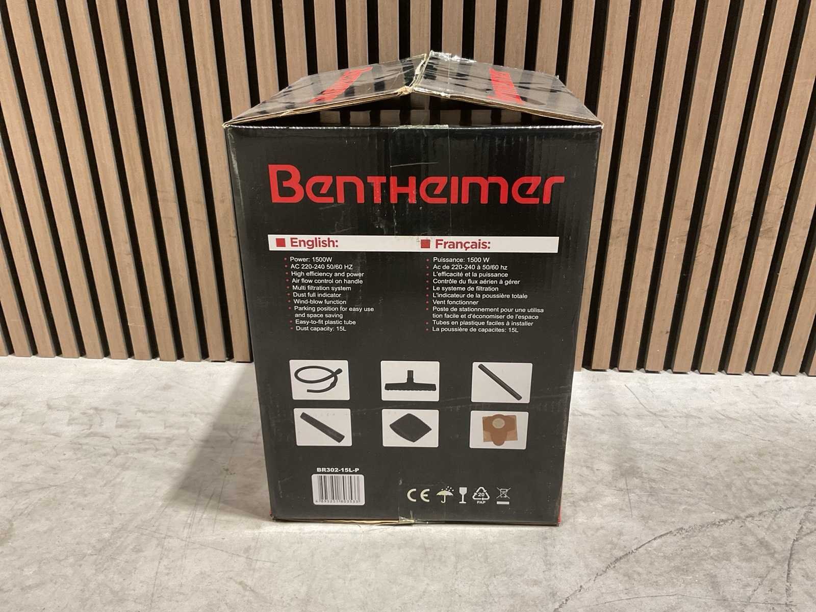 Voorzien van Vermogen: 1500 W; Aansluitspanning: AC 220–240 V / 50–60 Hz; Inhoud ketel: 15 liter; Type opvang Stof; Luchtstroomregeling: Via handgreep; Filtertype: Multifiltratiesysteem; Stofindicator; Kunststof slang; Vloerzuigmond; ongebruikt in doos Merk: Bentheimer Model: BR302-15L-P Product type: 15 liter Vermogen: 1500W Spanning: 220V