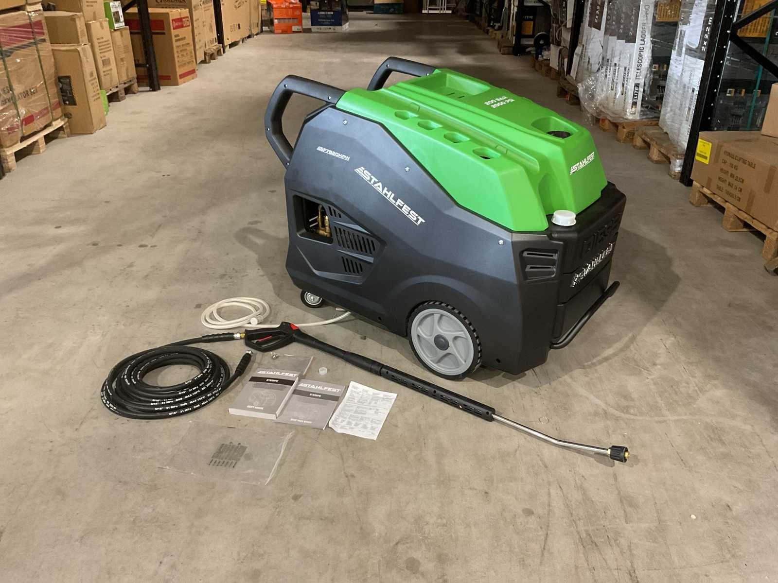 Voorzien van Spanning: 380 - 400V; Fase: 3 Hertz: 50 Hz; Thermisch vermogen: 58 kW; Ketelvoorziening: diesel; Maximale waterdruk: 210 bar; Werkdruk: 20 MPa; Maximale druk: 21 MPa; Pomp: 1450 tpm; Debiet: 15 l/min; Maximale temperatuurinvoer: 140°C; 10mtr slang; Ongebruikt in kist (Afmeting transport verpakking 730x545x620 mm lxbxh, gewicht 165 kg) Merk: Stahlfest Type: SF7820HPW Bouwjaar: 2025 Maximale werkdruk: 210bar Temperatuurbereik max.: 140°c Capaciteit.: 900l/hr Mobiel: true Vermogen: 7300kW Aansluiting: 400V Eigen gewicht: 165kg Totale afmeting L: 730mm Totale afmeting Breedte: 545mm Totale afmeting Hoogte: 620mm