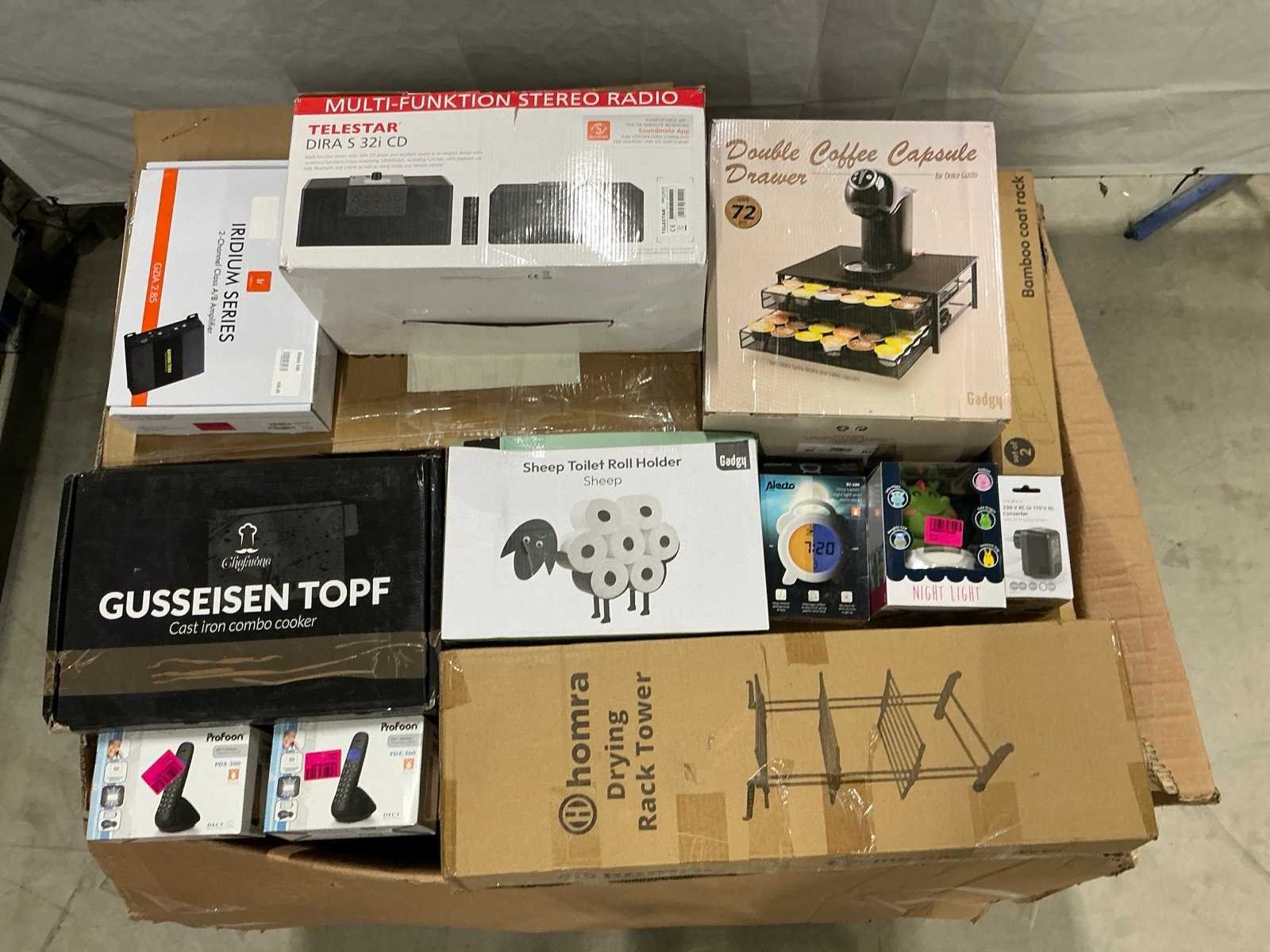 Dit betreft een partij retourgoederen van een grote online retailer. De goederen bestaan uit diverse productcategorieën. Ongecontroleerd: werking onbekend (mix van werkend, incompleet, beschadigd, te gebruiken voor onderdelen). Kom op de kijkdag om te om zo een goed beeld te krijgen van de reden van retour. Merk: Pallet
