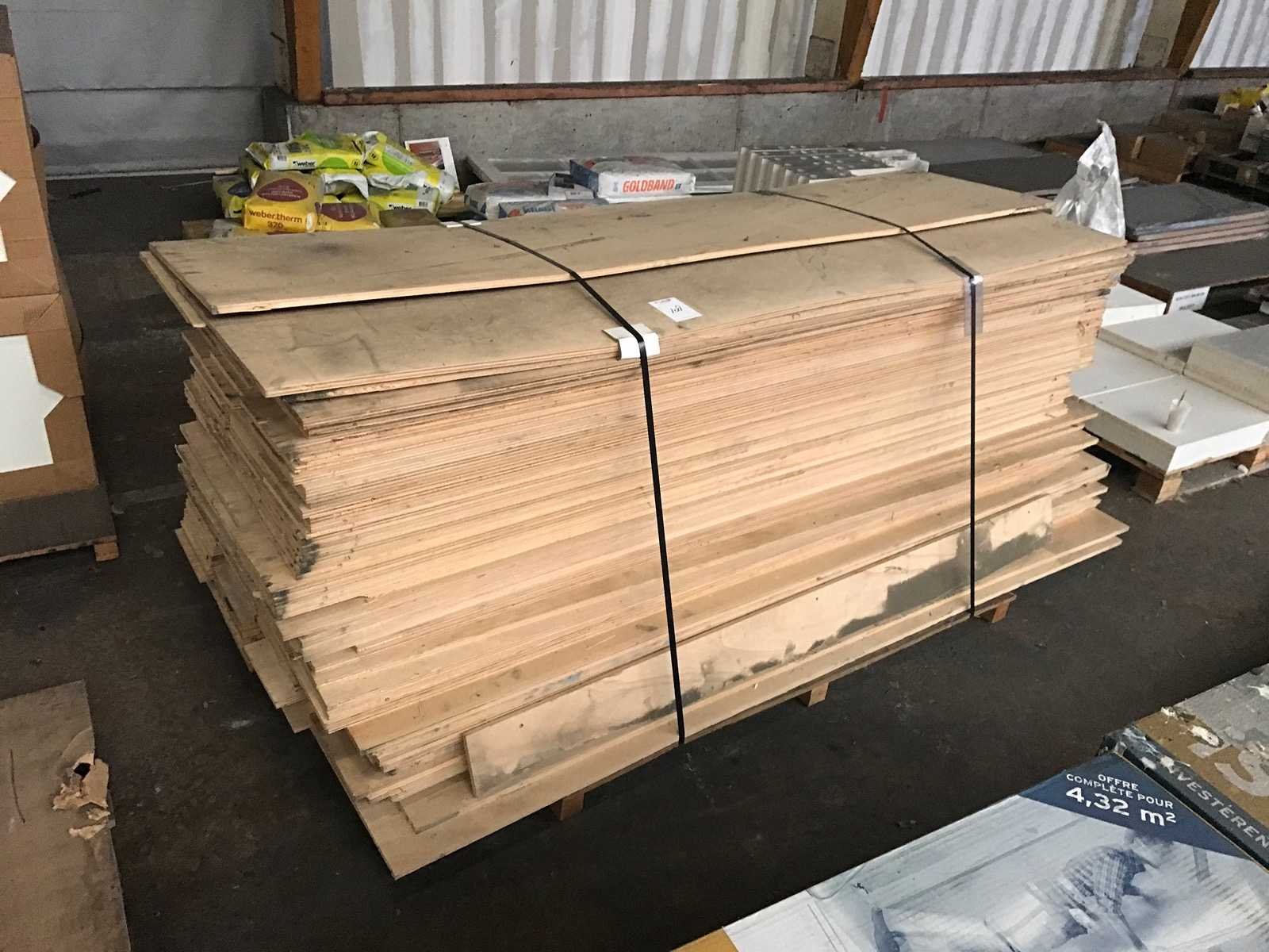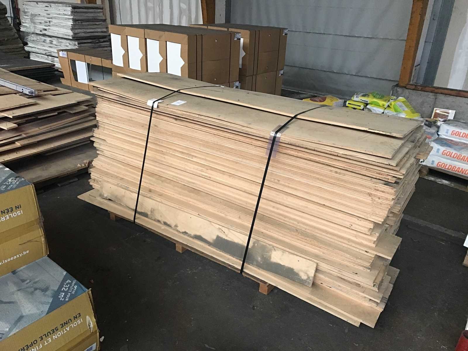 Pallet met multiplex stroken; dikte 15mm; meeste 244cm lang; diverse breedtes; waaronder 25,5cm en 61,5cm