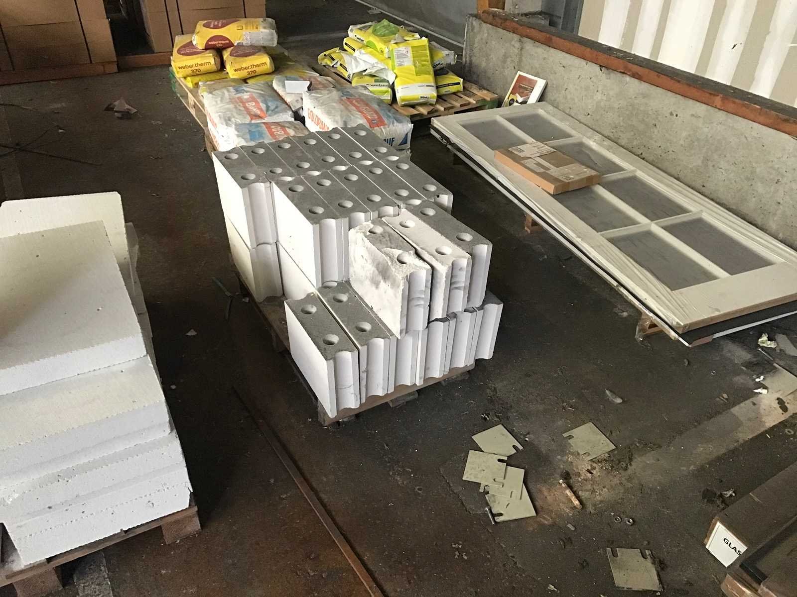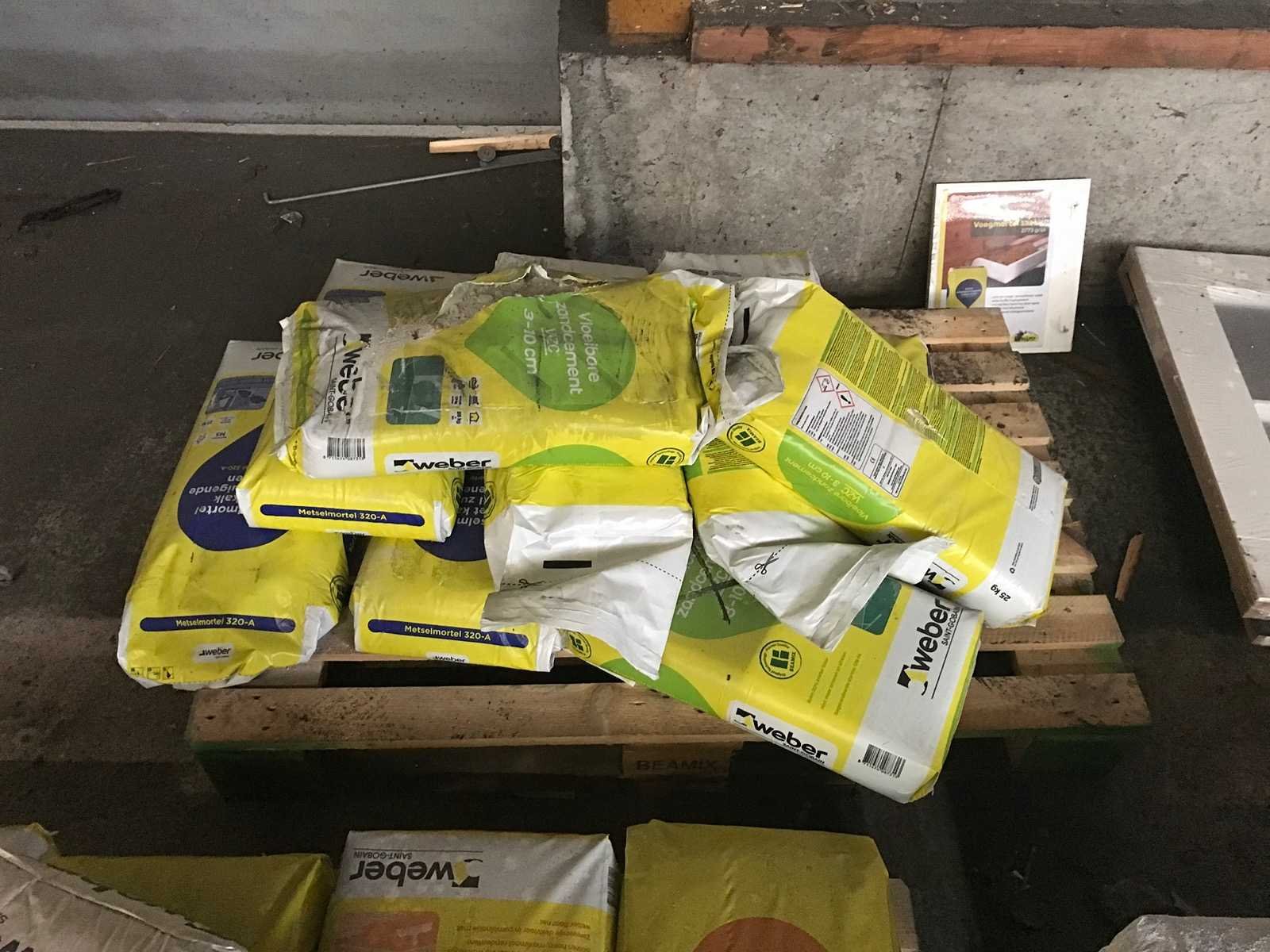 6 pallets bouwmateriaal; waaronder 3 pallets gipsblokken; 1 pallet Knauf goldband pleistergips; 2 pallets Weber diverse zakken