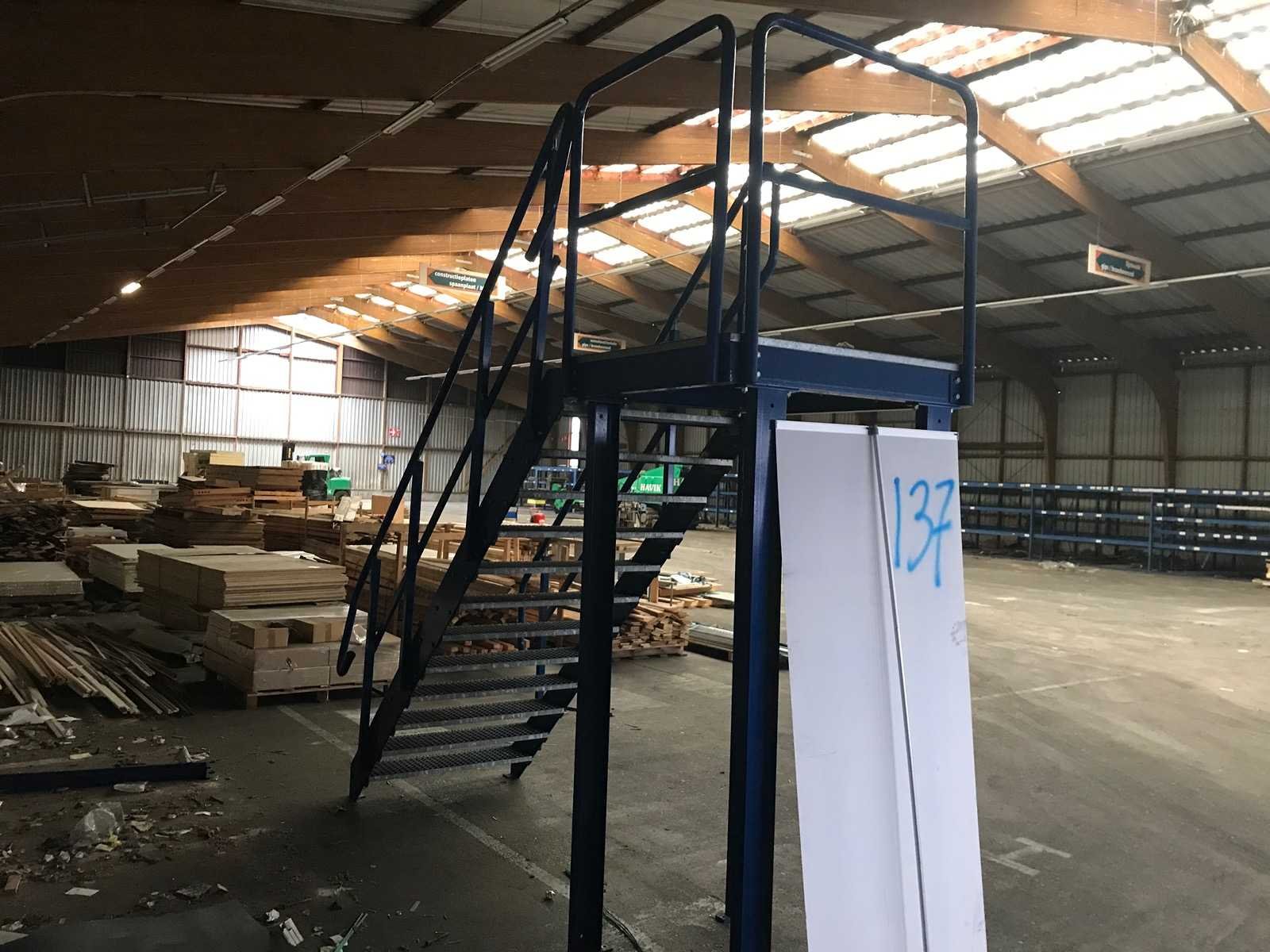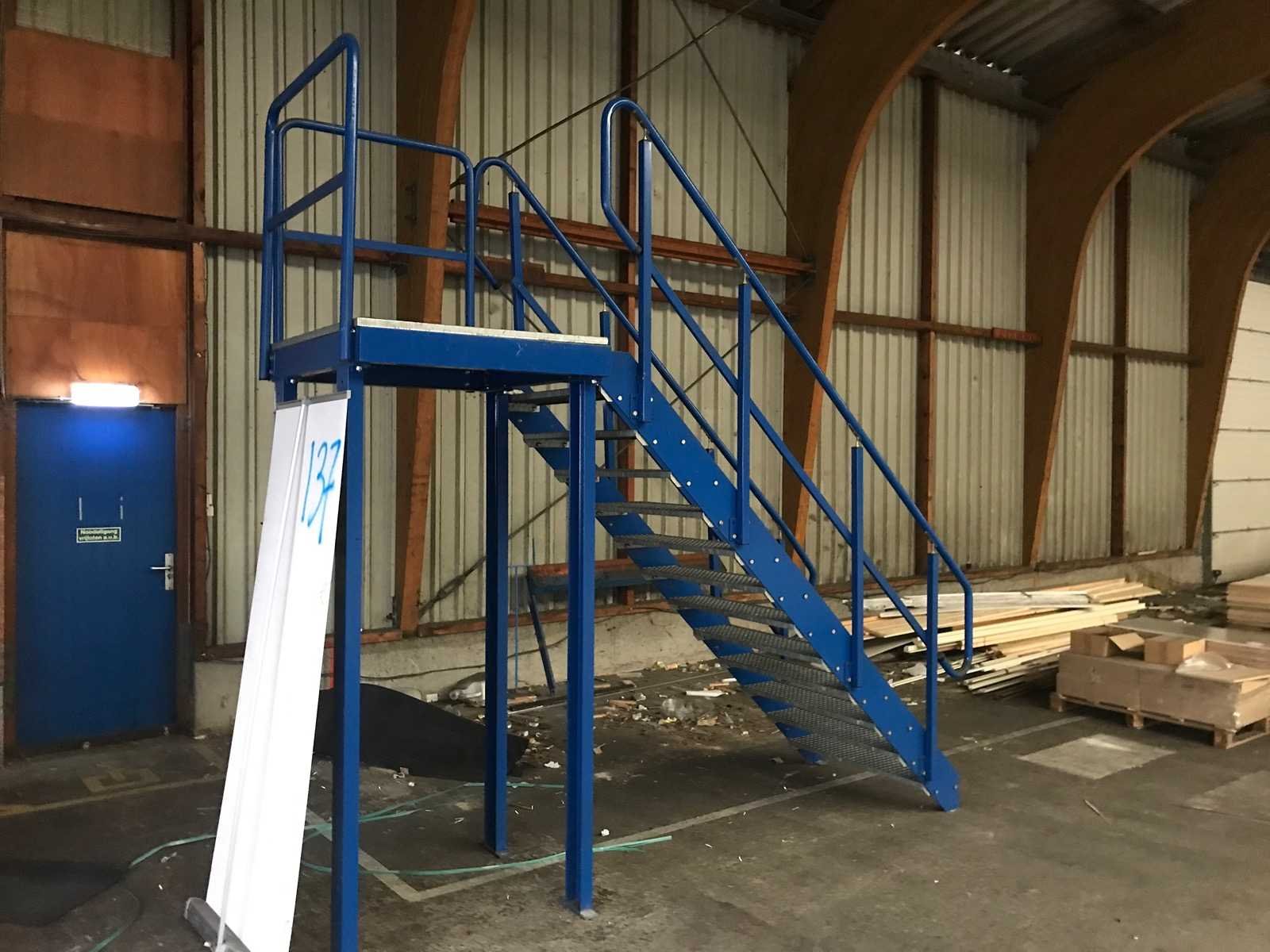 Mooie stalen trap met bordes; optrede 18,5cm; tredes 27cm diepen 100cm breed; 45 graden; inclusief leuning; bordes 100x110cm Kleur: blauw Lengte: 330cm Breedte: 111cm Hoogte: 330cm