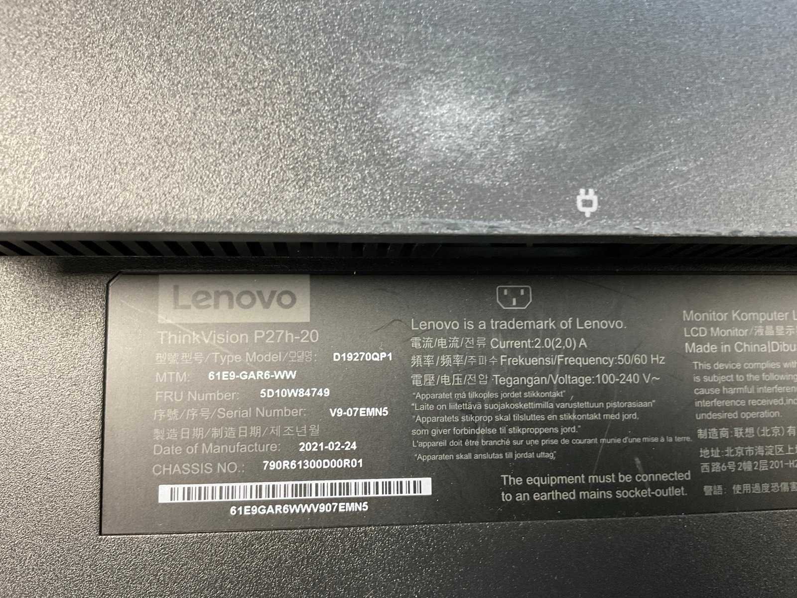 Lenovo (p27h-20) 27”, 2560x1440 (qhd) ips monitor