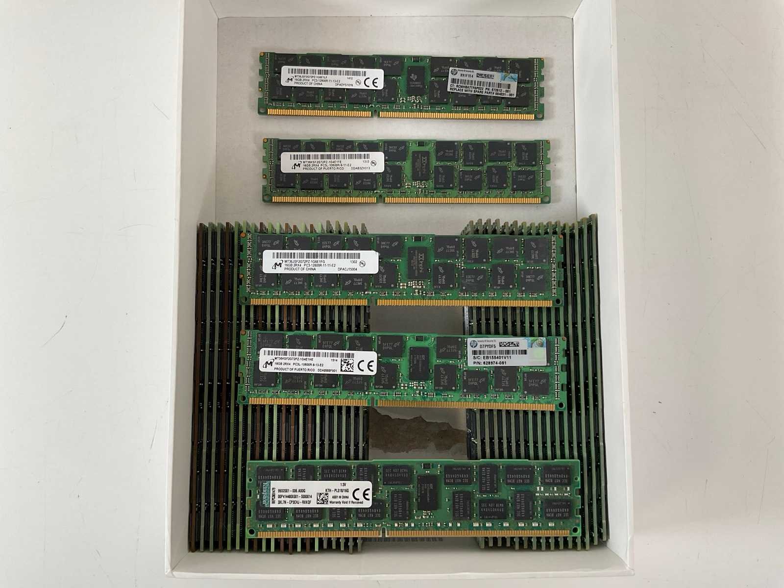 Mix Model 16 GB RAMs - Check Description; - 16x Kingston (KTH-PL318/16G) 16 GB RAMs, - 12x Micron (MT36JSF2G72PZ-1G6E1FG) 16 GB 2Rx4 PC3-12800R RAMs, - 6x Micron (MT36KSF2G72PZ-1G4E1HE) 16 GB 2Rx4 PC3L-10600R RAMs, - 4x Micron (MT36KSF2G72PZ-1G4E1FE) 16 GB 2Rx4 PC3L-10600R RAMs, - 2x Micron (MT36JSF2G72PZ-1G6E1LF) 16 GB 2Rx4 PC3-12800R RAMs, - Pulled from working assets. Merk: Micron/Kingston