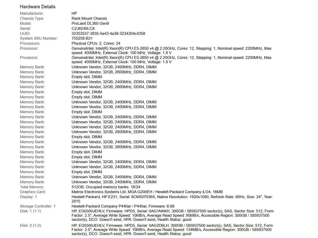 (ProLiant DL360 Gen9) - 2x Xeon(R) E5-2650 v4, 512 GB RAM (16x32GB), 300 GB SAS Rack Mount Chassis; - Pulled, - 2x 500W Power Supply Unit, - 1x HP (EG0300JEHLV) 300 GB SAS, - Excl. power and connection cables. Merk: HP