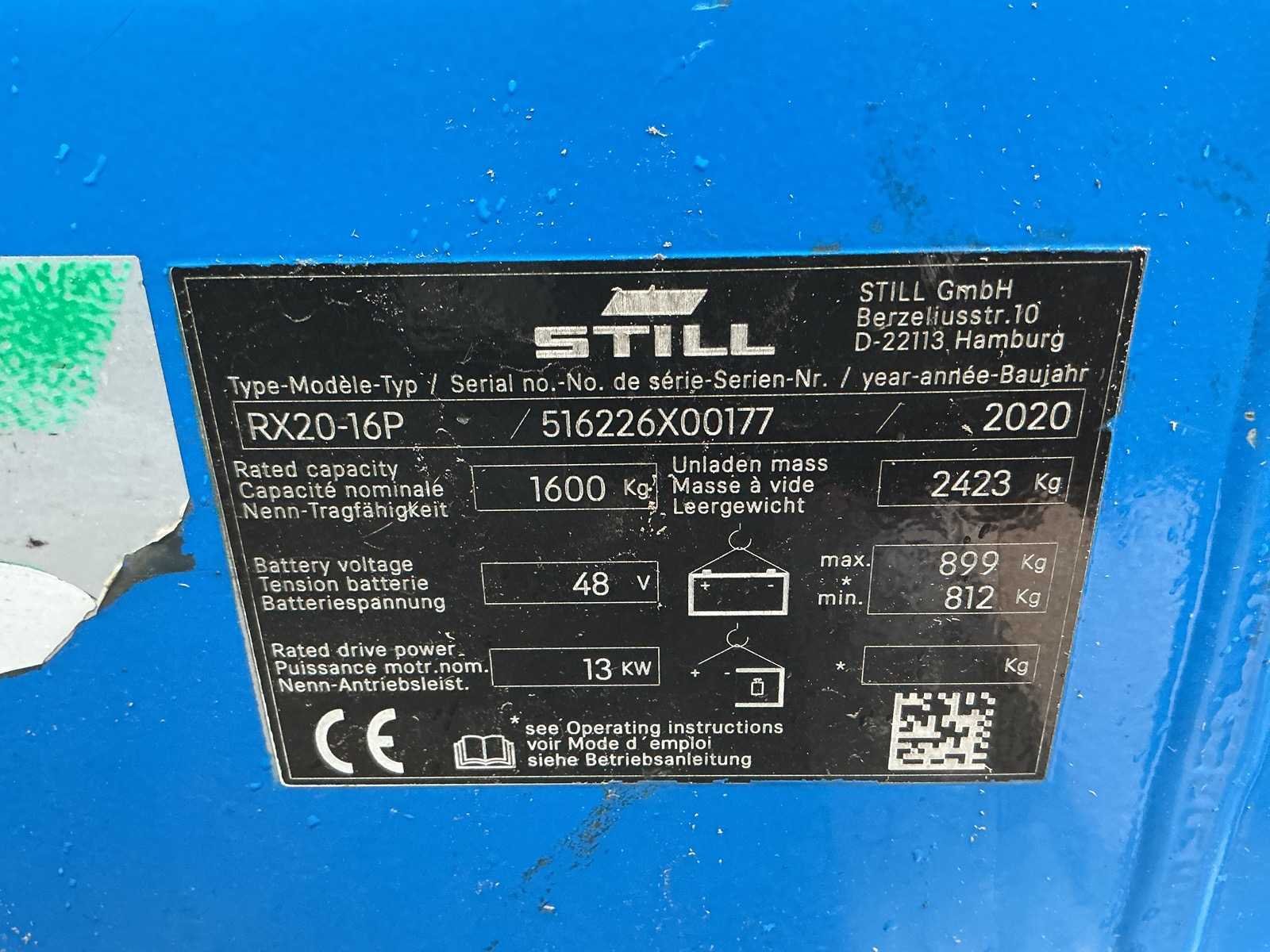 Merk: STILL Type: RX20-16/P Bouwjaar: 2020 Serienummer: 51622600177 Mast: Triplex Afgelezen urenstand: 8657 Free-lift: true Side-shift: true Triple mast: true Hefvermogen: 1600kg Lepellengte: 800mm Hefhoogte: 5220mm Minimale doorrijhoogte: 2260mm
