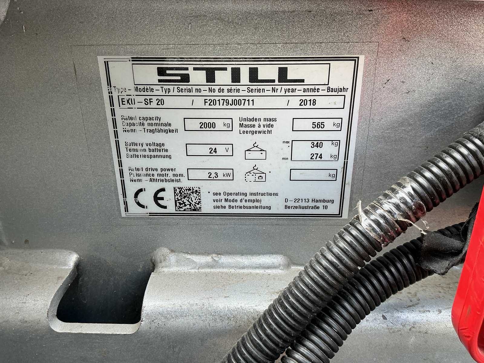 Merk: STILL Type: EXU-SF20 Bouwjaar: 2018 Serienummer: F20179J00711 Hefvermogen: 2000kg Lepellengte: 1190mm Meerij palletwagen: true Afgelezen urenstand: 1145