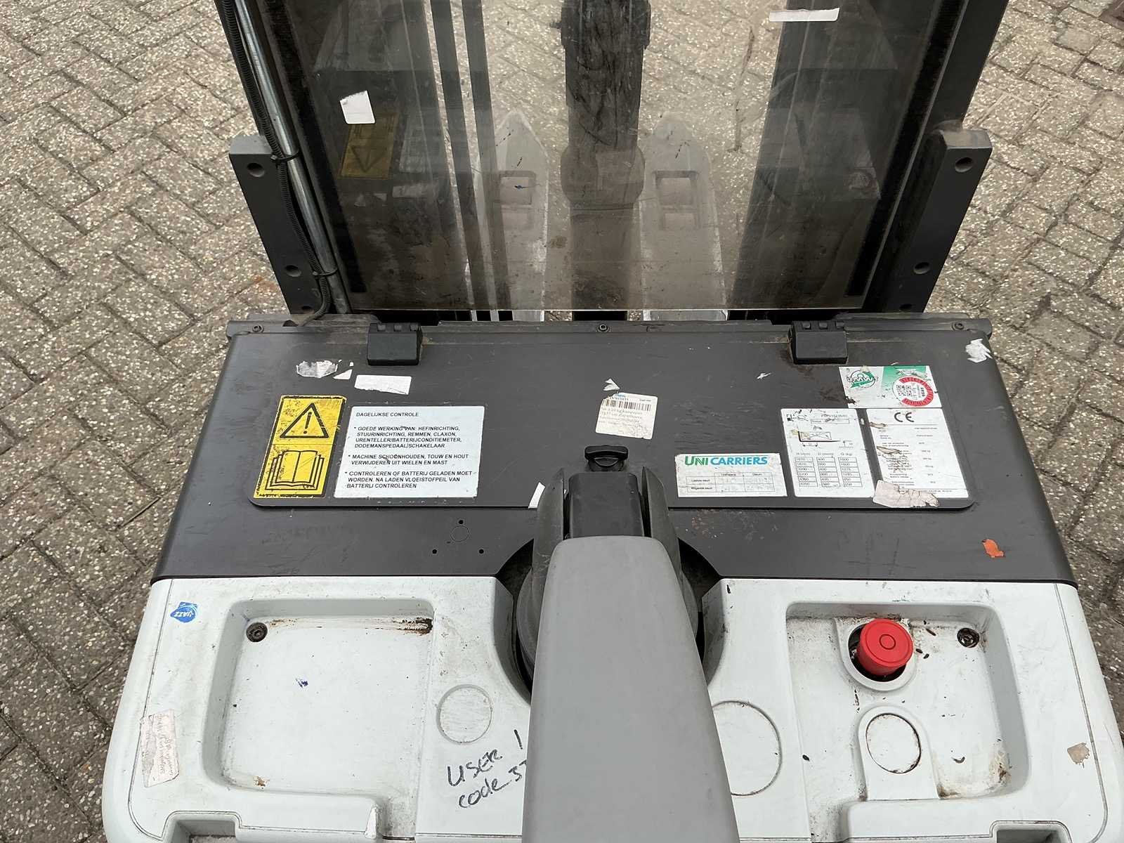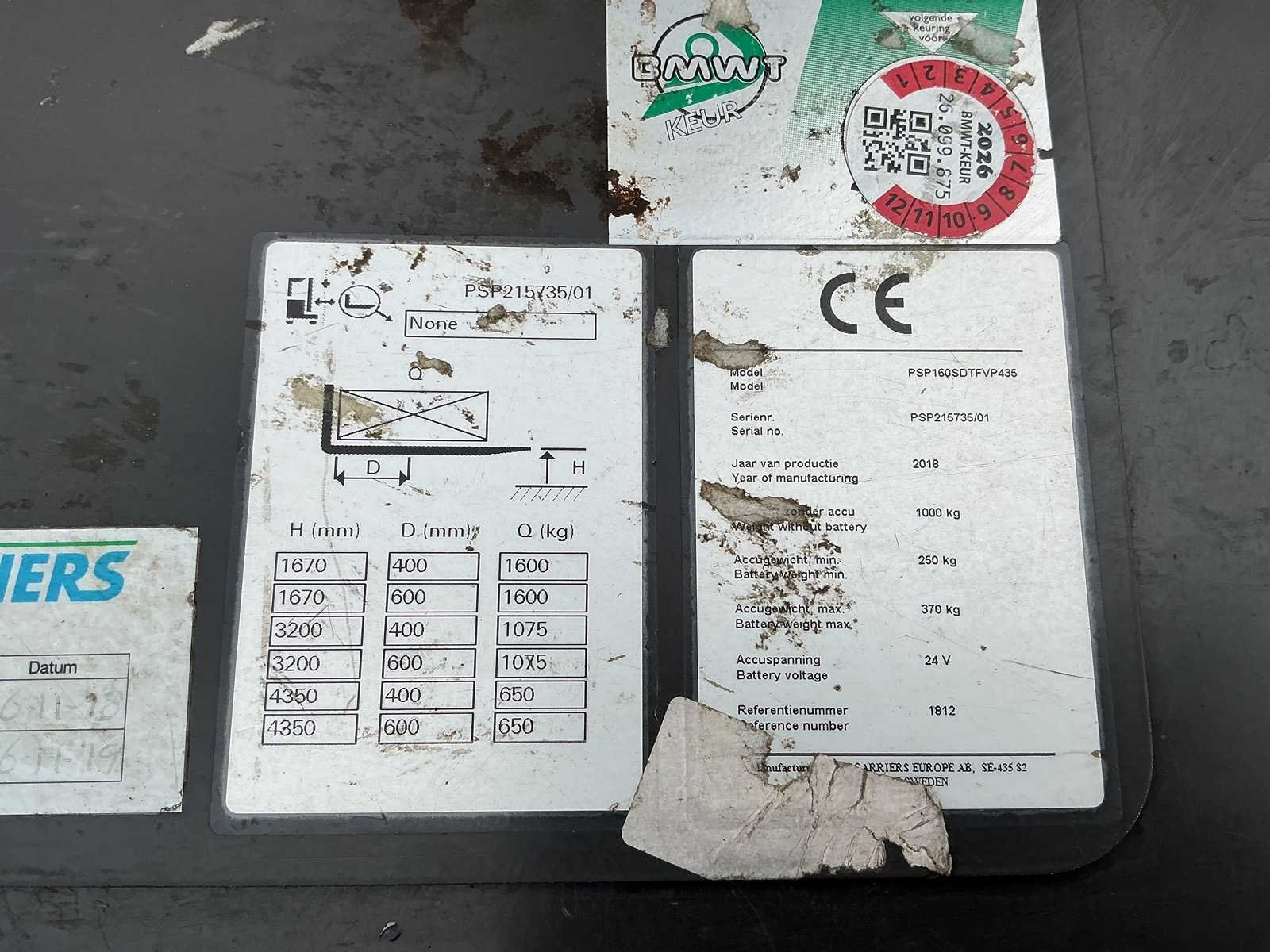 Merk: Uni Carriers Type: PSP 160 SDTFVP435 Bouwjaar: 2018 Serienummer: PSP215735/01 Hefvermogen: 1600kg Hefhoogte: 4350mm Lepellengte: 1150mm Afgelezen urenstand: 2527 Minimale doorrijhoogte: 2000mm Meerij stapelaar: true