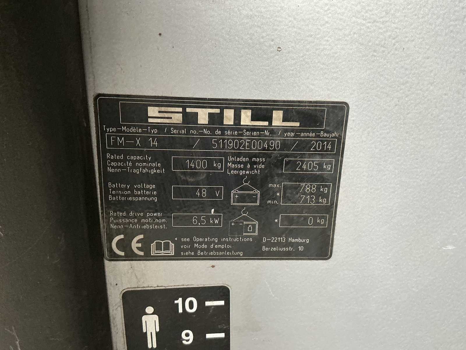 Merk: STILL Type: FMX-14 Bouwjaar: 2014 Serienummer: 511902E00490 Mast: Triplex Free-lift: true Side-shift: true Triple mast: true Hefvermogen: 1400kg Lepellengte: 1200mm Hefhoogte: 5150mm Minimale doorrijhoogte: 2240mm