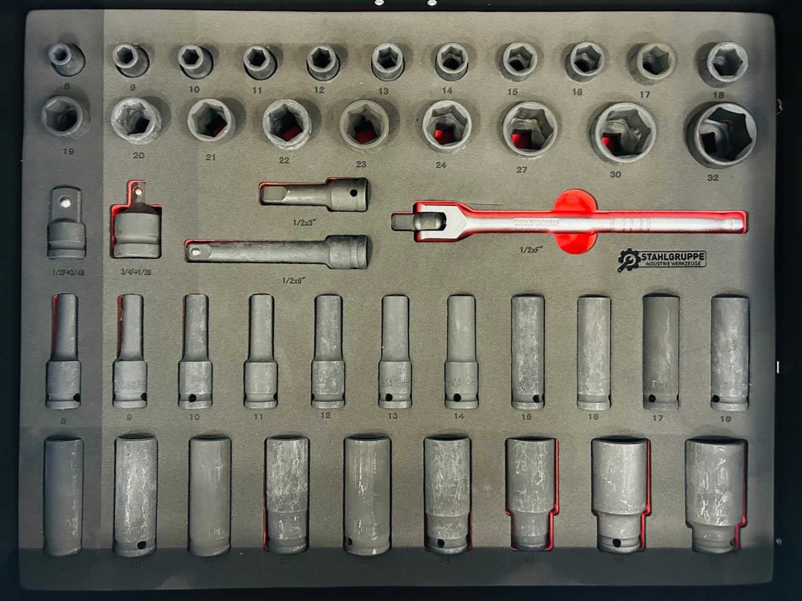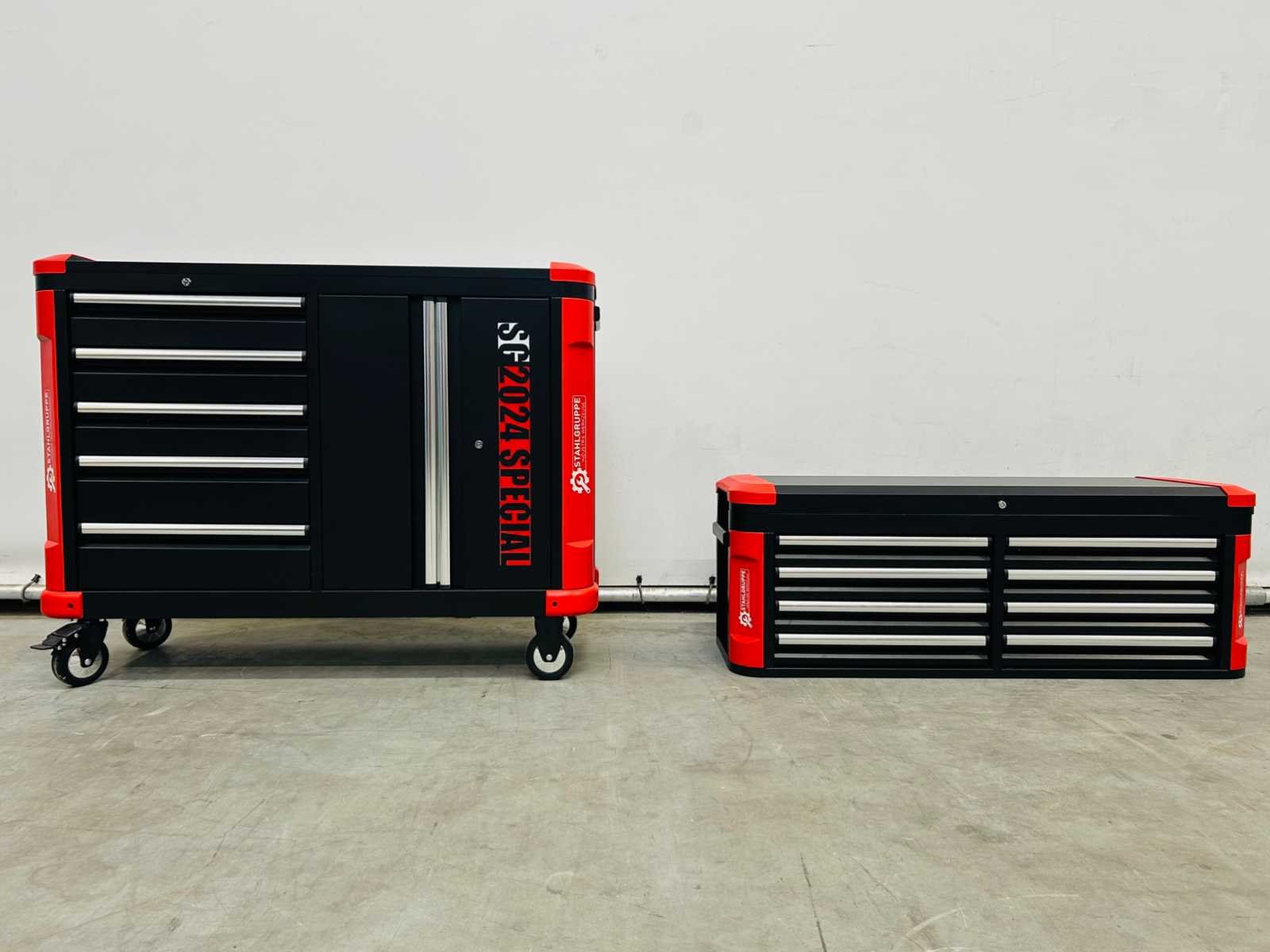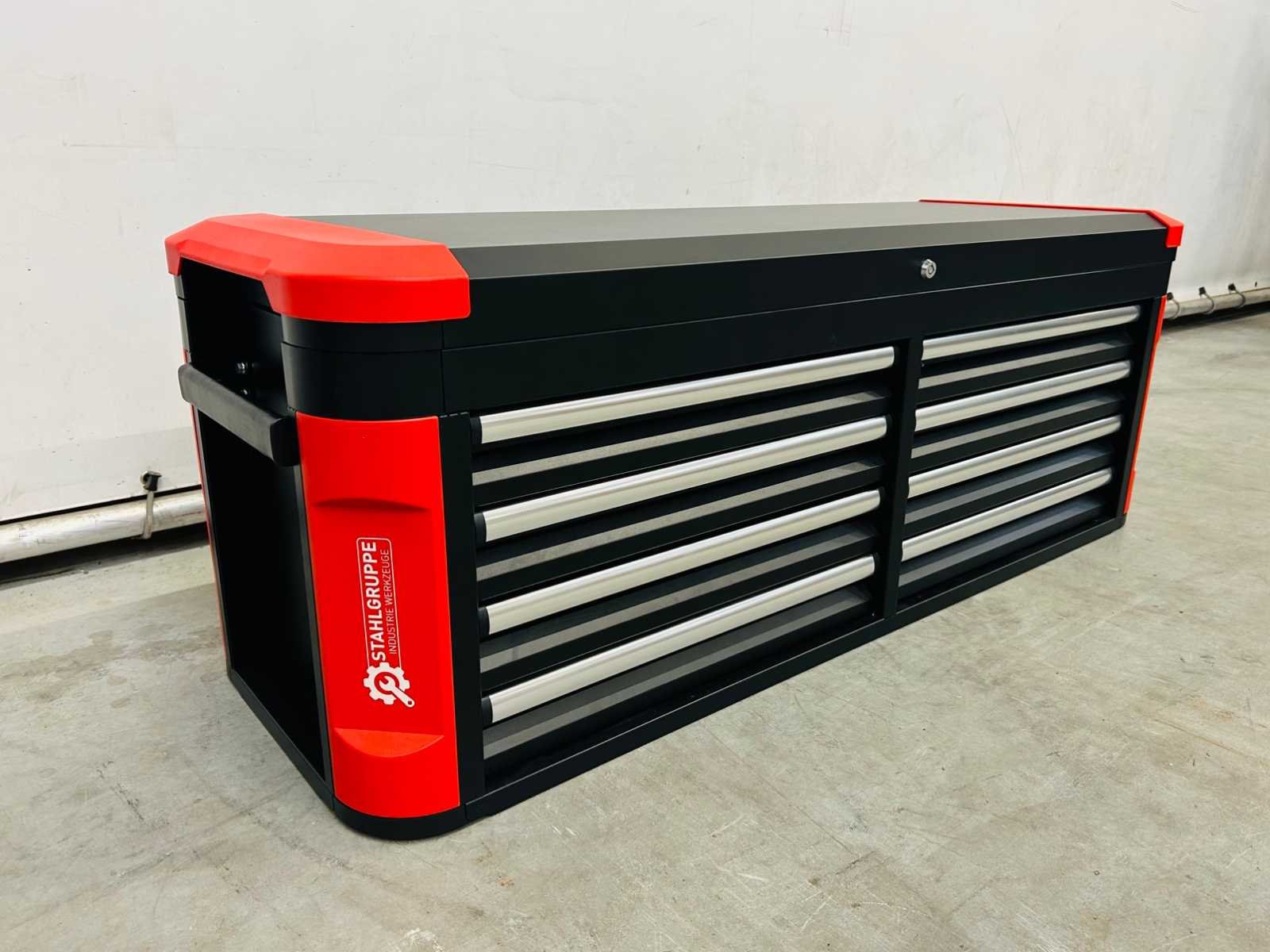 Kar met afneembare topbox; topbox met 8 laden en boven klep; Kar met 5 laden en kast met dubbele openslaande deuren; 13laden - 9 gevuld; 2 zwenkwielen waarvan 2 geremd; 7212 Merk: Stahlgruppe Model: SG2024 Type: 327-delige Kleur: rood - zwart Gewicht: 215kg Lengte: 144cm Breedte: 54cm Hoogte: 154cm