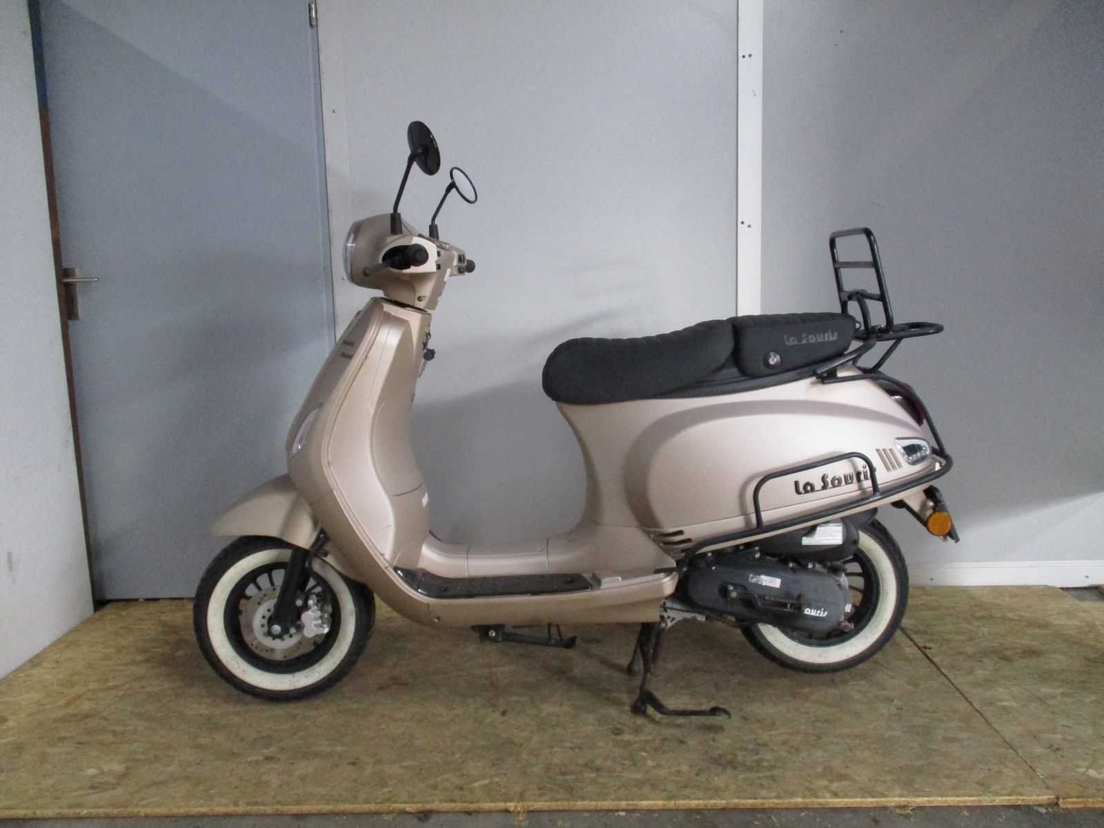 Bromscooter met 2 sleutels inclusief White Wall banden, achter klaprek, achter zijbeugelset, dagrijverlichting en gescheiden zadel. Motor loopt, voorvork ontzet. Staat van onderhoud onbekend, Merk: La Souris Sourini R Limited Model: Bromscooter Snelheid: 45km/h Kenteken: FPK-18-R Datum eerste toelating: 07-09-2023 Bouwjaar: 07-09-2023 Transmissie: automaat Brandstof: benzine Kleur: n.v.t. Afgelezen kilometerstand: 2805km