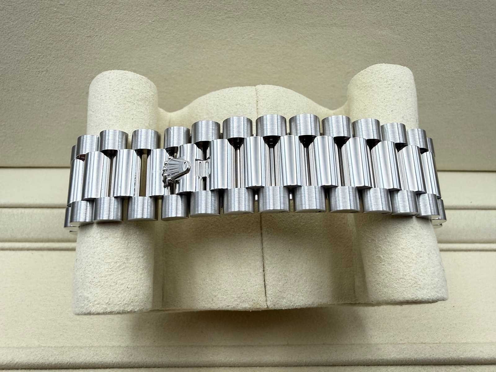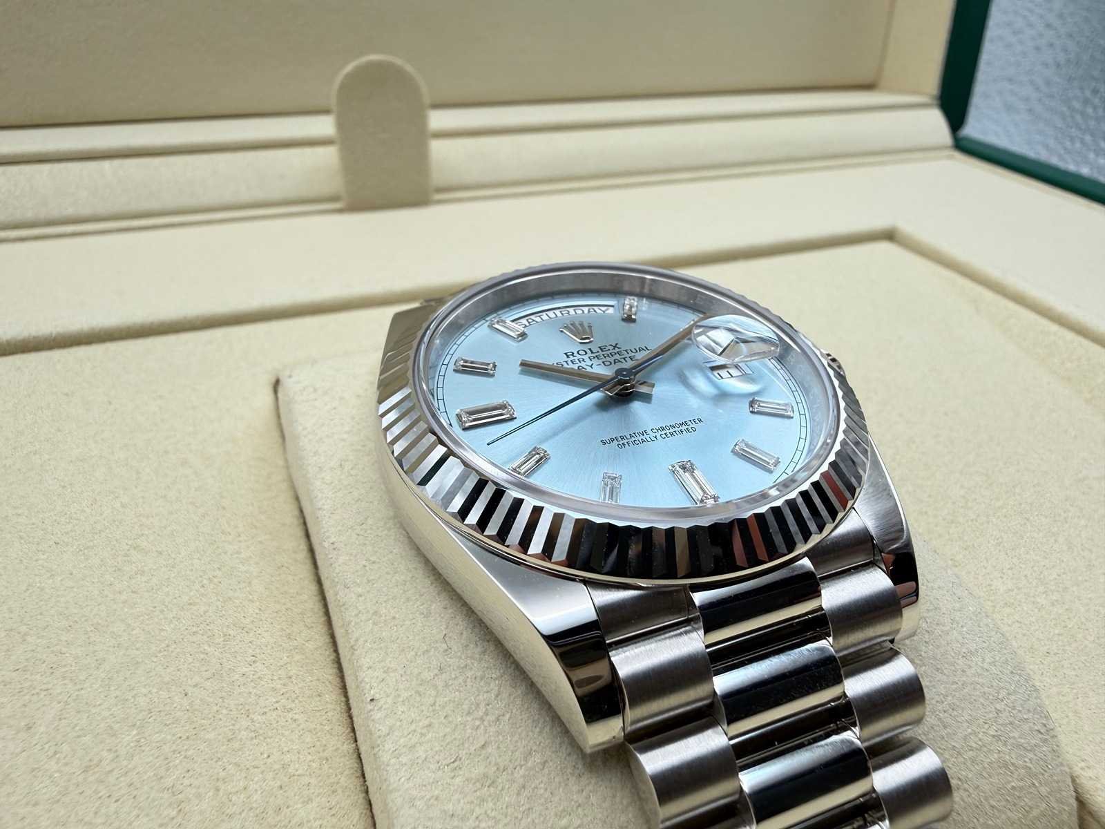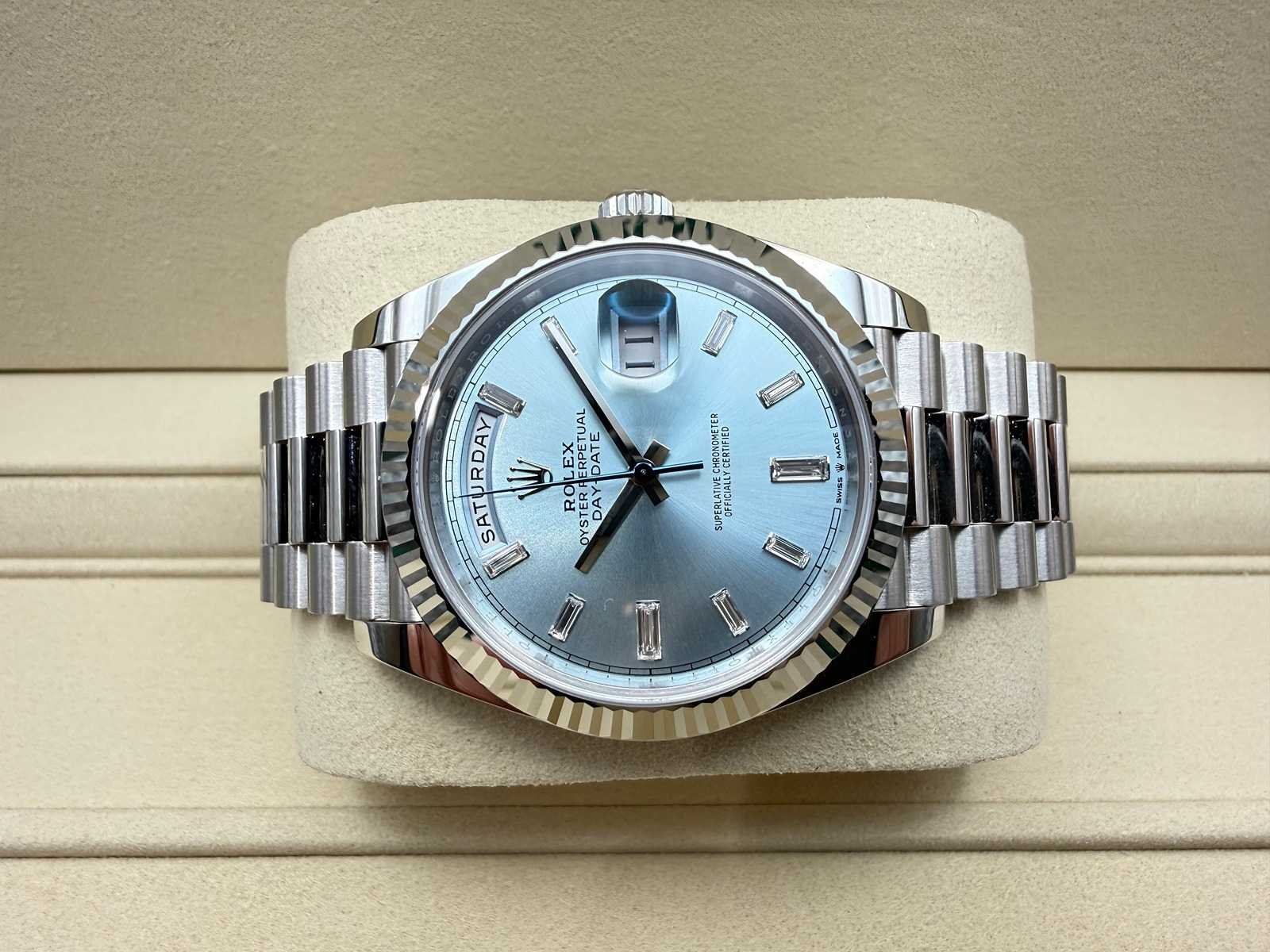 Key Features: Model: Rolex Day-Date 40 Reference: 228236 Case Material: Solid Platinum Dial: Ice Blue with baguette diamond hour markers Condition: Brand new, unworn Year: 02/2026 Bracelet: Platinum President bracelet Movement: Automatic Rolex manufacture movement Warranty: 5-year international Rolex warranty Set: Full set – box, papers, warranty card, green & white ta Merk: Rolex Model: Day-Date Bouwjaar: 2026 Referentienummer: 228236 Materiaal kast: Platina Materiaal horlogeband: Presidential Platina Materiaal sluiting: Platina Wijzerplaat: ICE Blue Baguettes Kastmaat: 40 mm