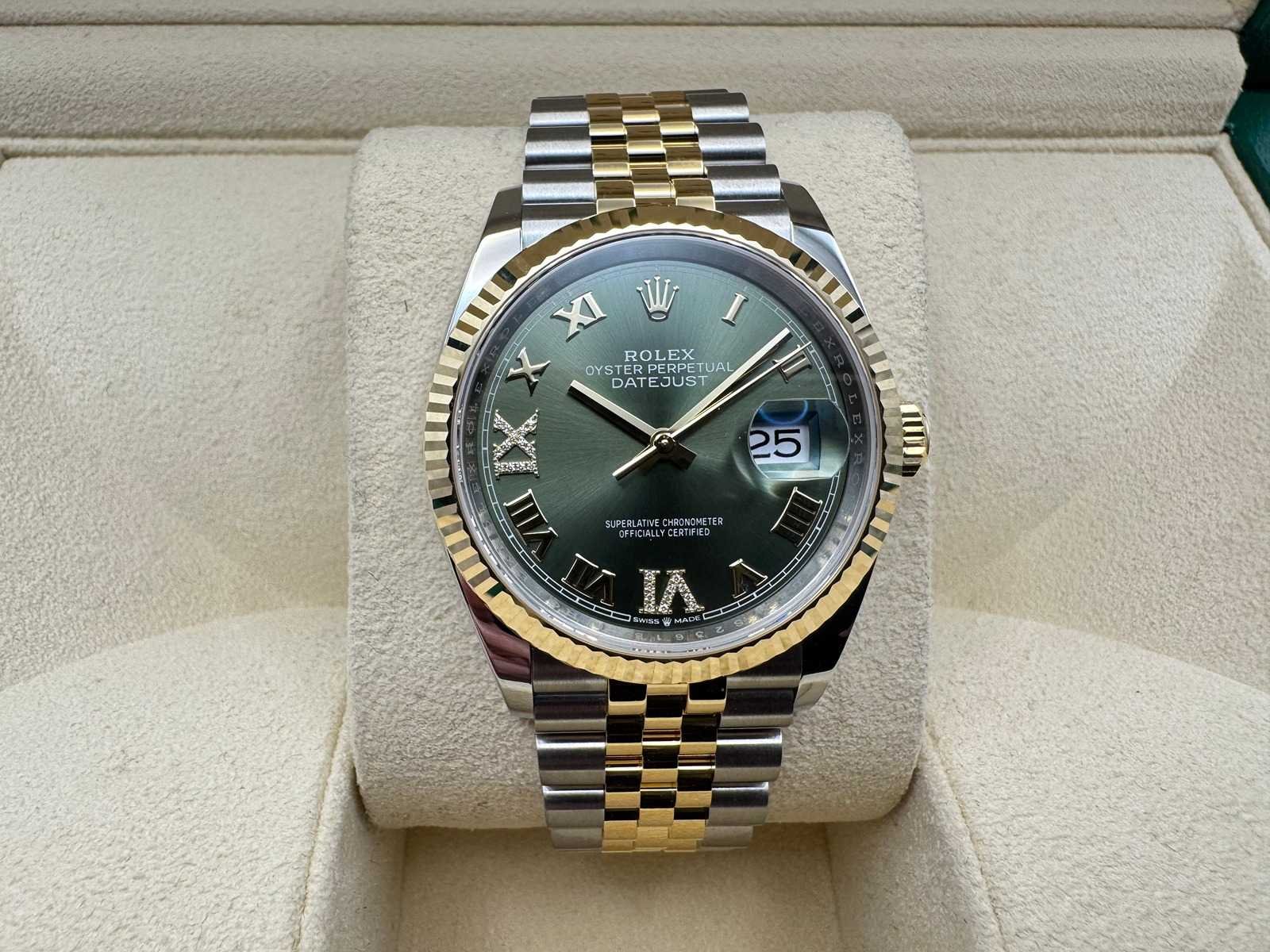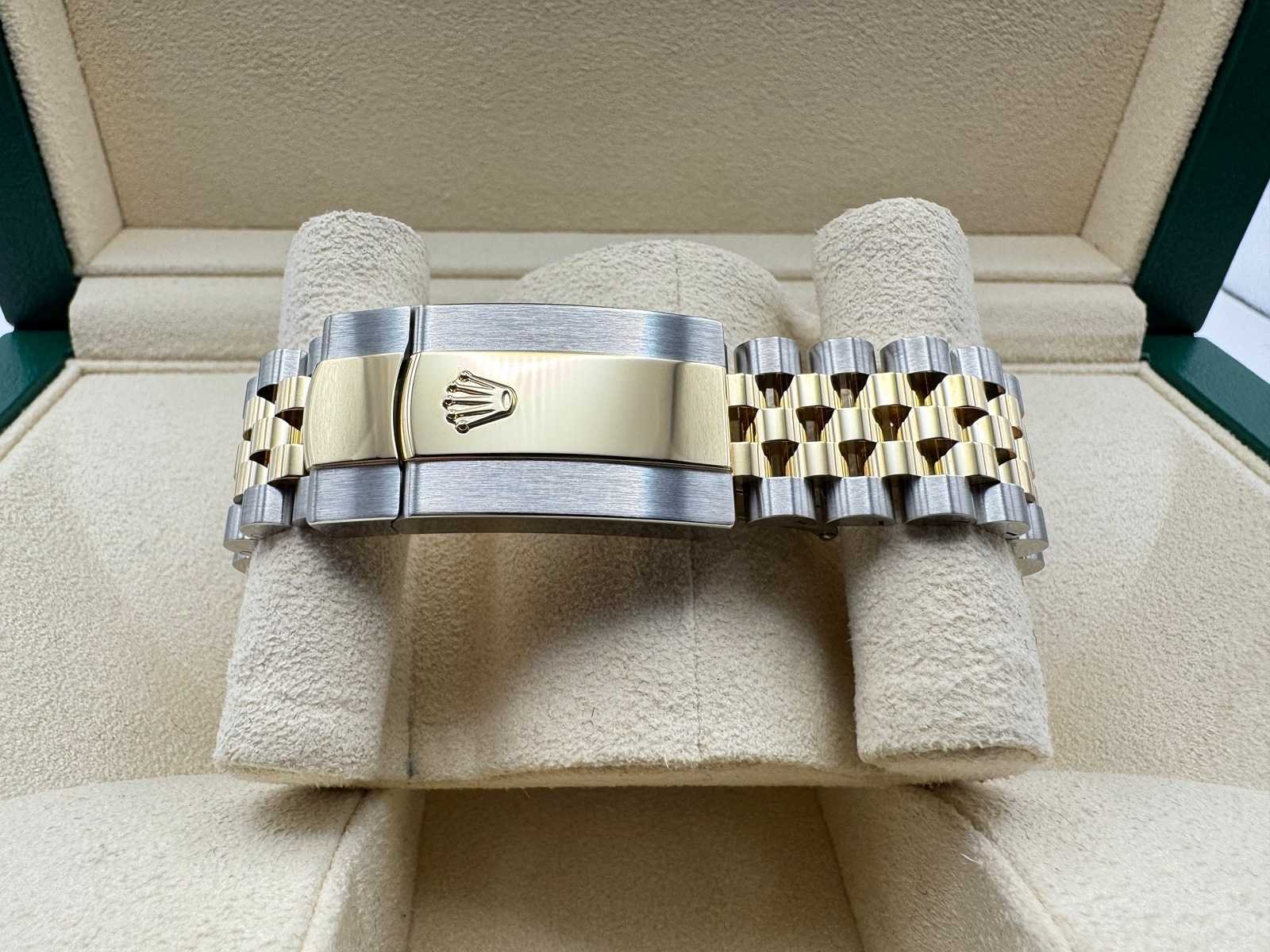 The watch comes as a full set, including the original Rolex box, booklets, warranty card holder, and Rolex guarantee card. 5-year international warranty Key Features: Model: Rolex Datejust 36 Ref. 126233 Condition: Unworn Material: Stainless steel & 18k yellow gold Bracelet: Jubilee Dial: diamonds at 6 and 9 o’clock Bezel: Fluted 18k yellow gold International warranty: 5 years remaining Full set: Includes box, papers, warranty card, and Rolex tag Merk: Rolex Model: Datejust 36 Bouwjaar: 2026 Referentienummer: 126233 Materiaal kast: Steel / yellow gold Materiaal horlogeband: Steel / yellow gold Materiaal sluiting: Steel / yellow gold Wijzerplaat: Olive green with diamonds on the 6&9 Kastmaat: 36 mm