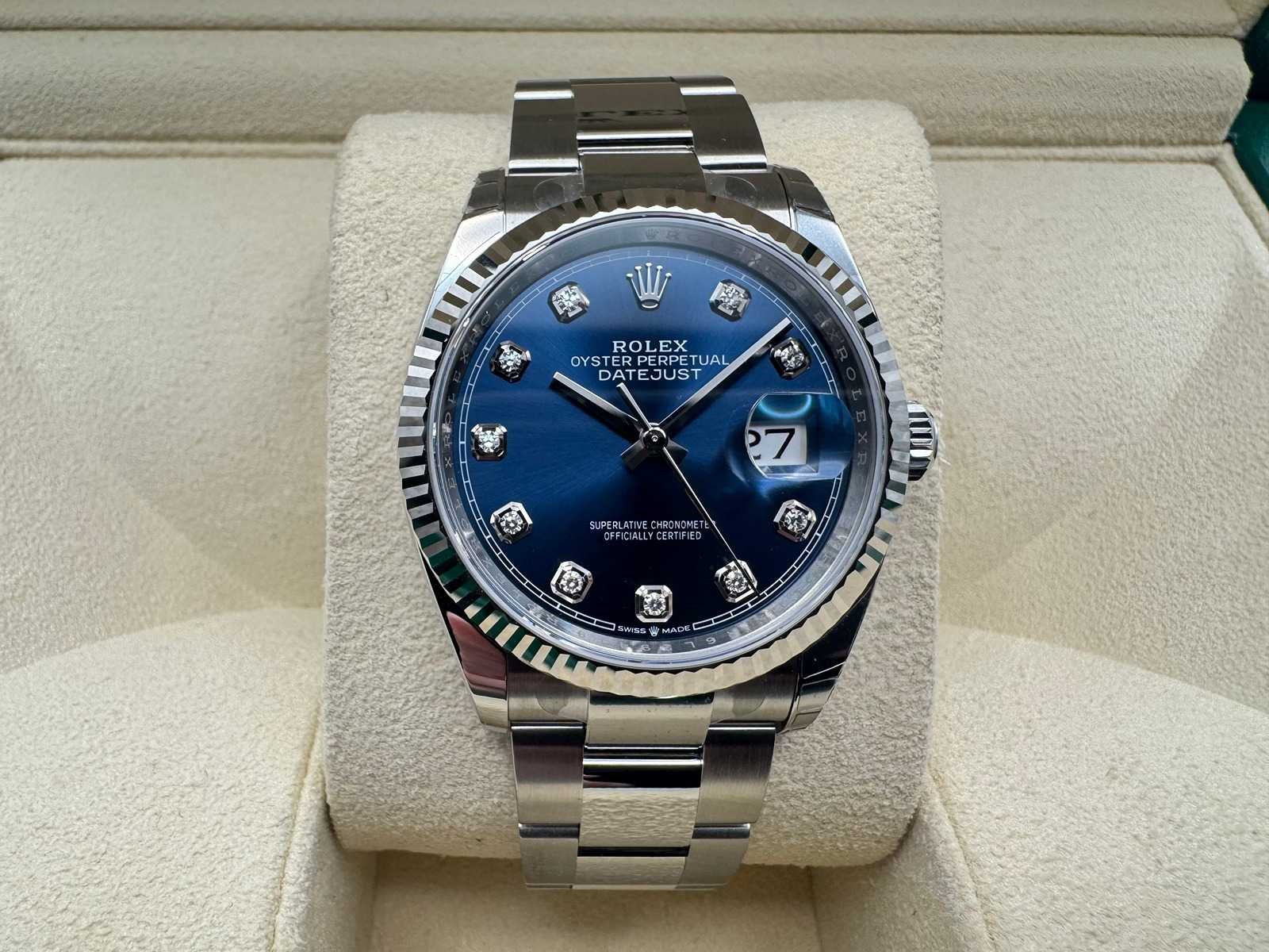 Key Features Reference: 126234 Year: 2026 Condition: Unworn Case: 36 mm Oyster case in Oystersteel Bezel: 18 ct white gold fluted bezel Dial: Blue dial with diamond dot hour markers Bracelet: Oyster bracelet A bold yet timeless configuration of the Datejust 36, pairing the vibrant blue diamond dial with the sporty Oyster bracelet and the signature white gold fluted bezel. Merk: Rolex Model: Datejust 36 Bouwjaar: 2026 Referentienummer: 126234 Materiaal kast: Steel Materiaal horlogeband: Steel Oyster Fluted Materiaal sluiting: Steel Wijzerplaat: Blue Diamond Dot Kastmaat: 36 mm
