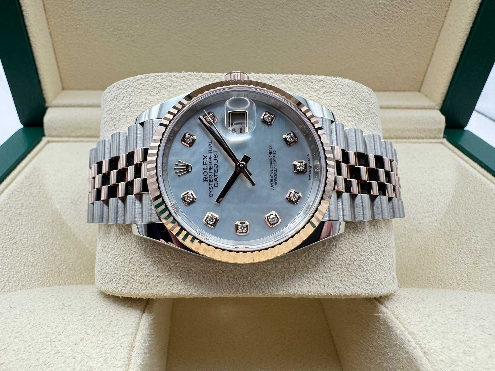 Brand new & unworn Rolex guarantee card Original box Booklets & wallet Rolex tag Full 5-year international Rolex warranty Specifications: Model: Rolex Datejust 36 Reference: 126231 Material: Stainless steel & 18k rose gold Dial: White Mother of Pearl with diamond hour markers Bracelet: Jubilee Bezel: Fluted Condition: Brand new, full set Merk: Rolex Model: Datejust 36 Bouwjaar: 2026 Referentienummer: 126231 Materiaal kast: Steel Materiaal horlogeband: Steel/Rose Gold Jubilee Materiaal sluiting: Steel/Rose Gold Wijzerplaat: Mother Of Pearl Diamonds Kastmaat: 36 mm