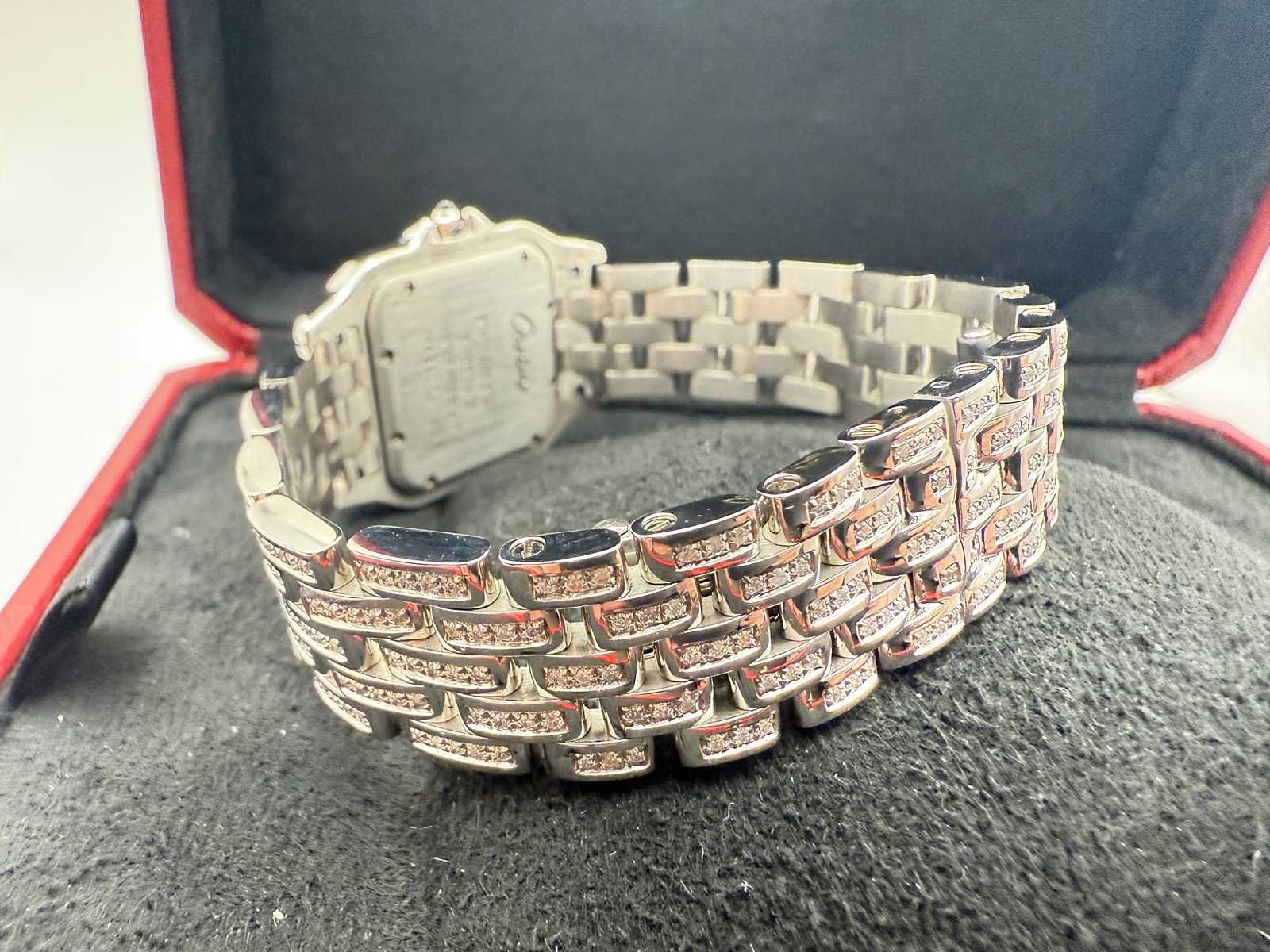 Key Features: Model: Cartier Panthère de Cartier Reference: WSPN0007 Year: 2025 Condition: Brand new, unworn Documents: No Material: Stainless steel, fully set with natural diamonds Dial: White with Roman numerals Bracelet: Fully set with natural diamonds Movement: Quartz Set: Cartier box Please note: this is a customised watch, meaning it may include components that differ from the original factory specifications. Customisation can vary widely, so we highlight the following possibilities for full transparency: Aftermarket parts The watch may include third-party components (such as bezels, dials, hands, crystals or gem settings) that are not produced by the brand owner. These parts are often added for aesthetic reasons, but are not considered original by the manufacturer. Original parts from other models Some components (e.g. dials or bracelets) may have been sourced from other genuine watches by the same brand. While these parts are authentic, they were not originally fitted to this particular model or reference, which may affect collectability or eligibility for manufacturer service. Non-original parts In some cases, customised watches may include parts that are neither original nor manufactured by the brand. These components can affect the watch’s value. We encourage all bidders to carefully review the photos and description before placing a bid. Keep in mind: customised watches may not be eligible for official service or warranty from the brand. All bids should be placed with full awareness of the customisation status described above. Merk: Cartier Model: Panthere Bouwjaar: 2024 Referentienummer: WSPN0007 Materiaal kast: Steel / Diamonds Materiaal horlogeband: Steel / Diamonds Wijzerplaat: White Roman Kastmaat: 27 mm
