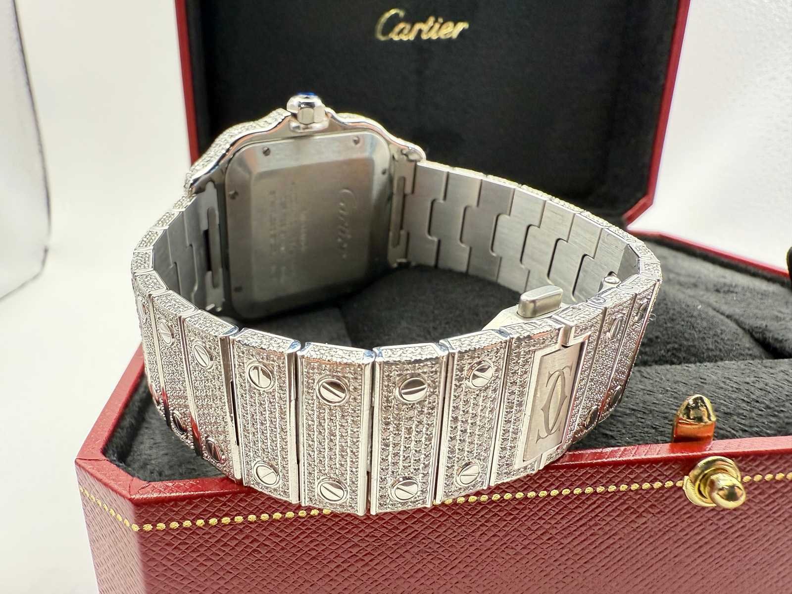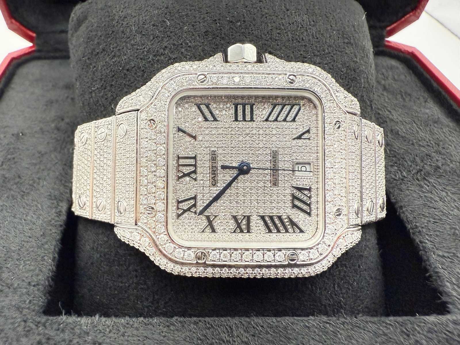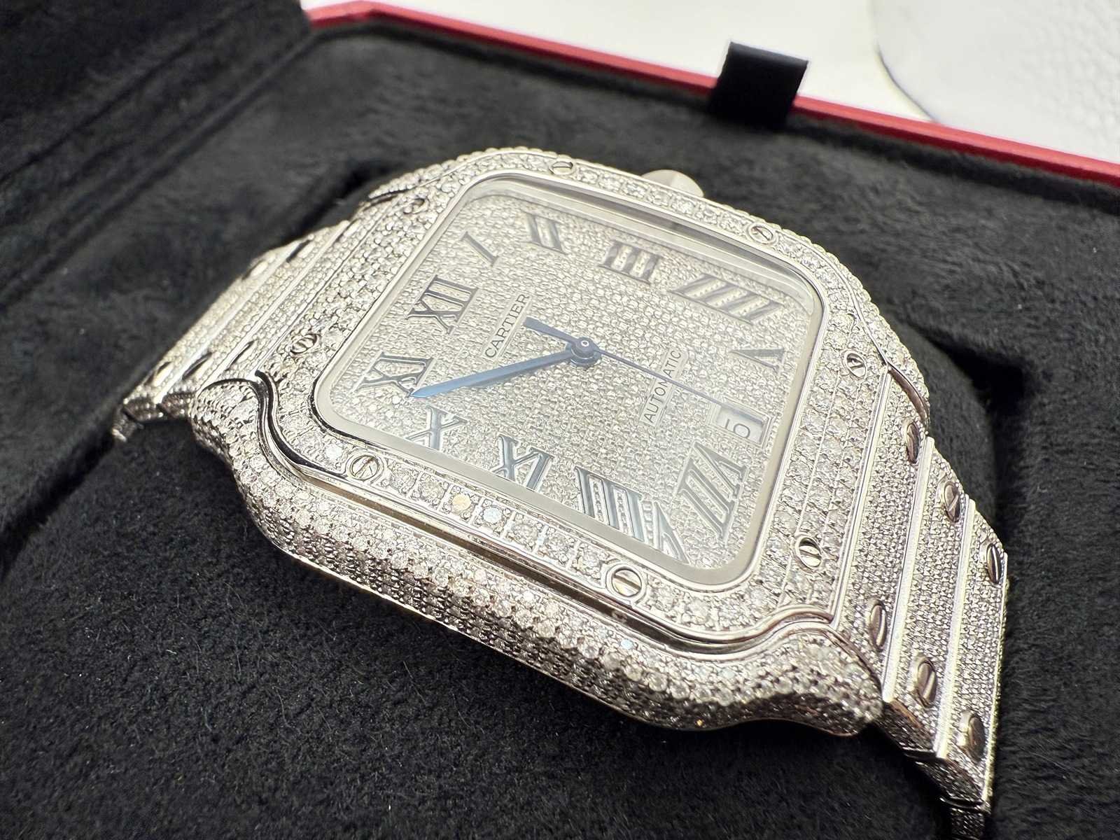 Conditie: Gloednieuw en ongedragen van 2020 • Diamantzetting: Volledig bezet met echte naturel VS diamanten, ook wel "iced out" genoemd • Complete Set: Inclusief originele Cartier doos, papieren en Cartier authenticatiepas • Referentienummer: WSSA0018 • Wijzerplaat: Iconische Cartier wijzerplaat met Romeinse cijfers volledig bezet met natural diamanten • Kast: Grote roestvrijstalen kast, perfect in harmonie met de fonkelende diamantzetting • Armband: Bijpassende roestvrijstalen armband, eveneens bezet met diamanten. Aanvullende Informatie: • Verpakking: Dit horloge wordt geleverd als een volledige set met de originele Cartier doos, officiële papieren en de Cartier authenticatiepas. Merk: Cartier Model: Santos Bouwjaar: 2020 Referentienummer: WSSA0018 Materiaal kast: Steel / Diamonds Materiaal horlogeband: Steel / Diamonds Materiaal sluiting: Steel / Diamonds Wijzerplaat: Diamonds Kastmaat: 39 mm
