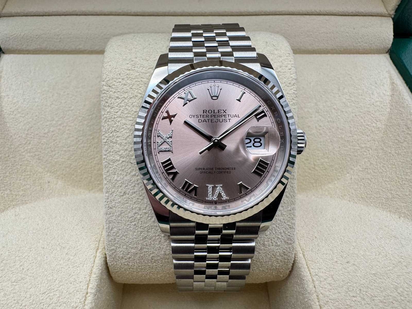 Key Features Reference: 126234 Year: 2026 Condition: Unworn Case: 36 mm Oyster case in Oystersteel Bezel: 18 ct white gold fluted bezel Dial: Pink dial with diamond hour markers, featuring diamond-set 6 & 9 Movement: Rolex Calibre 3235, automatic Power Reserve: Approx. 70 hours Bracelet: Jubilee bracelet Merk: Rolex Model: Datejust 36 Bouwjaar: 2026 Referentienummer: 126234 Materiaal kast: Steel Materiaal horlogeband: Steel Jubilee Fluted Materiaal sluiting: Steel Wijzerplaat: Pink With Diamonds On 6&9