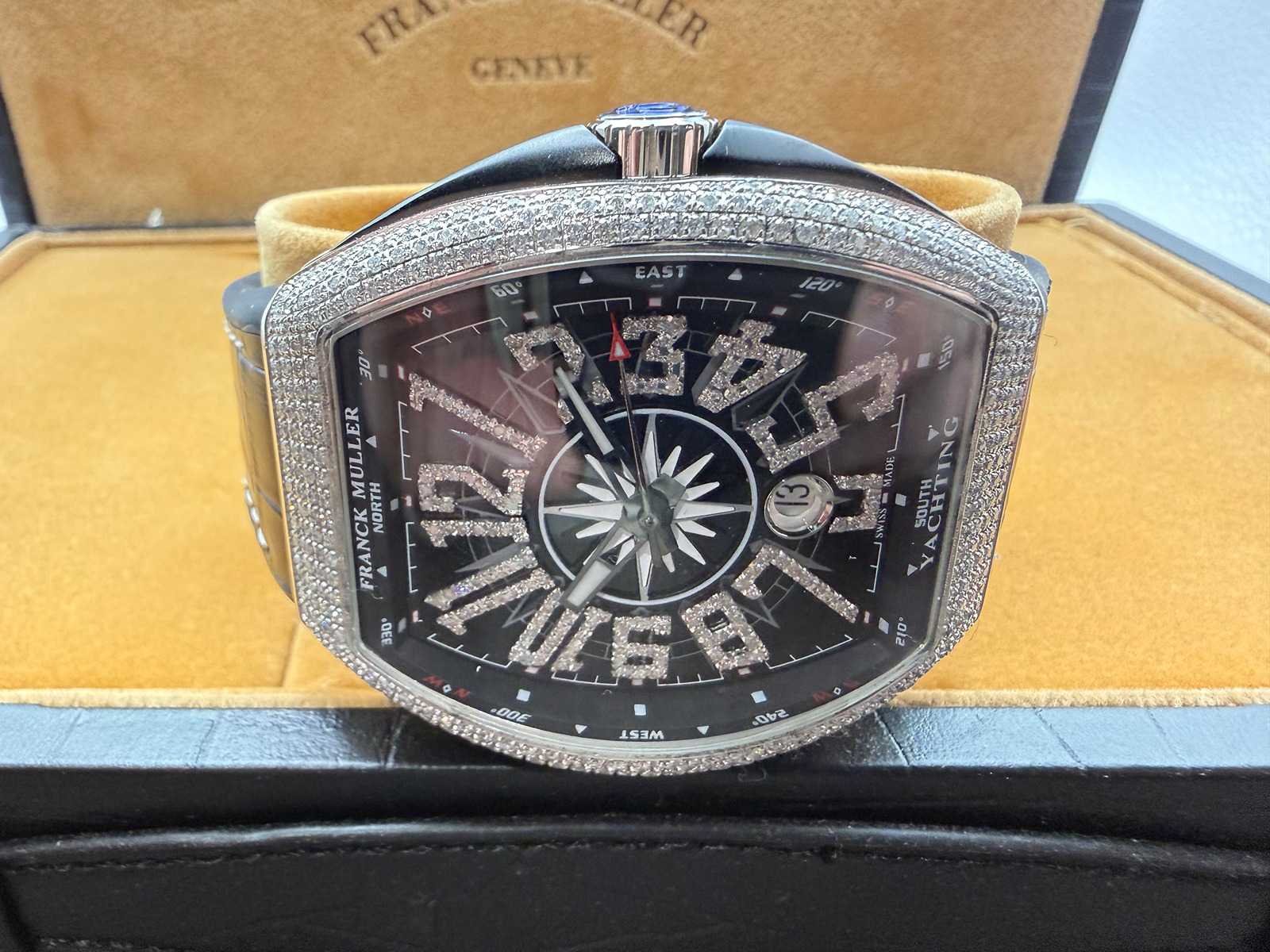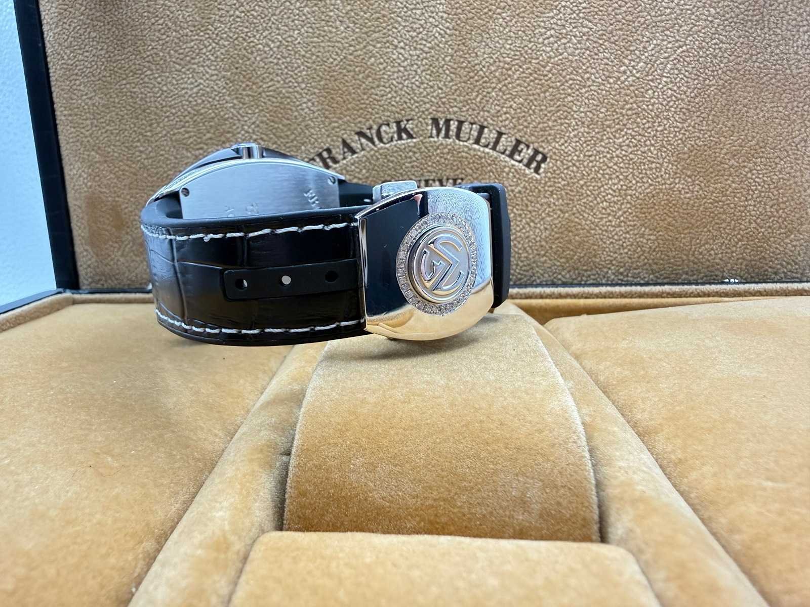 Model: Franck Muller Vanguard Condition: Excellent Case: Fully set with diamonds (iced out) Documents: No Design: Iconic Vanguard tonneau-shaped case Movement: Automatic Set: Comes with original box Please note: this is a customised watch, meaning it may include components that differ from the original factory specifications. Customisation can vary widely, so we highlight the following possibilities for full transparency: Aftermarket parts The watch may include third-party components (such as bezels, dials, hands, crystals or gem settings) that are not produced by the brand owner. These parts are often added for aesthetic reasons, but are not considered original by the manufacturer. Original parts from other models Some components (e.g. dials or bracelets) may have been sourced from other genuine watches by the same brand. While these parts are authentic, they were not originally fitted to this particular model or reference, which may affect collectability or eligibility for manufacturer service. Non-original parts In some cases, customised watches may include parts that are neither original nor manufactured by the brand. These components can affect the watch’s value. We encourage all bidders to carefully review the photos and description before placing a bid. Keep in mind: customised watches may not be eligible for official service or warranty from the brand. All bids should be placed with full awareness of the customisation status described above. Merk: Franck Muller Model: Vanguard Bouwjaar: 2024 Materiaal kast: Diamonds Materiaal horlogeband: Black Wijzerplaat: Black Uurwerk: Automatisch Kastmaat: 44 mm