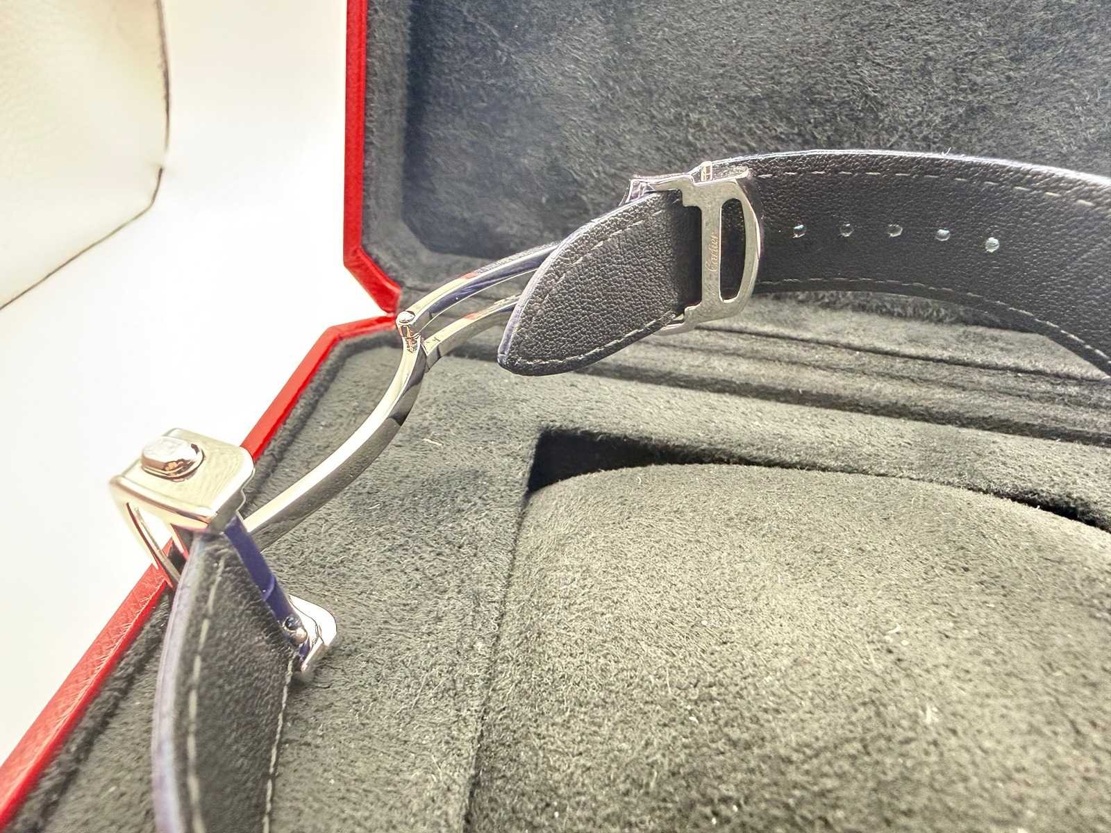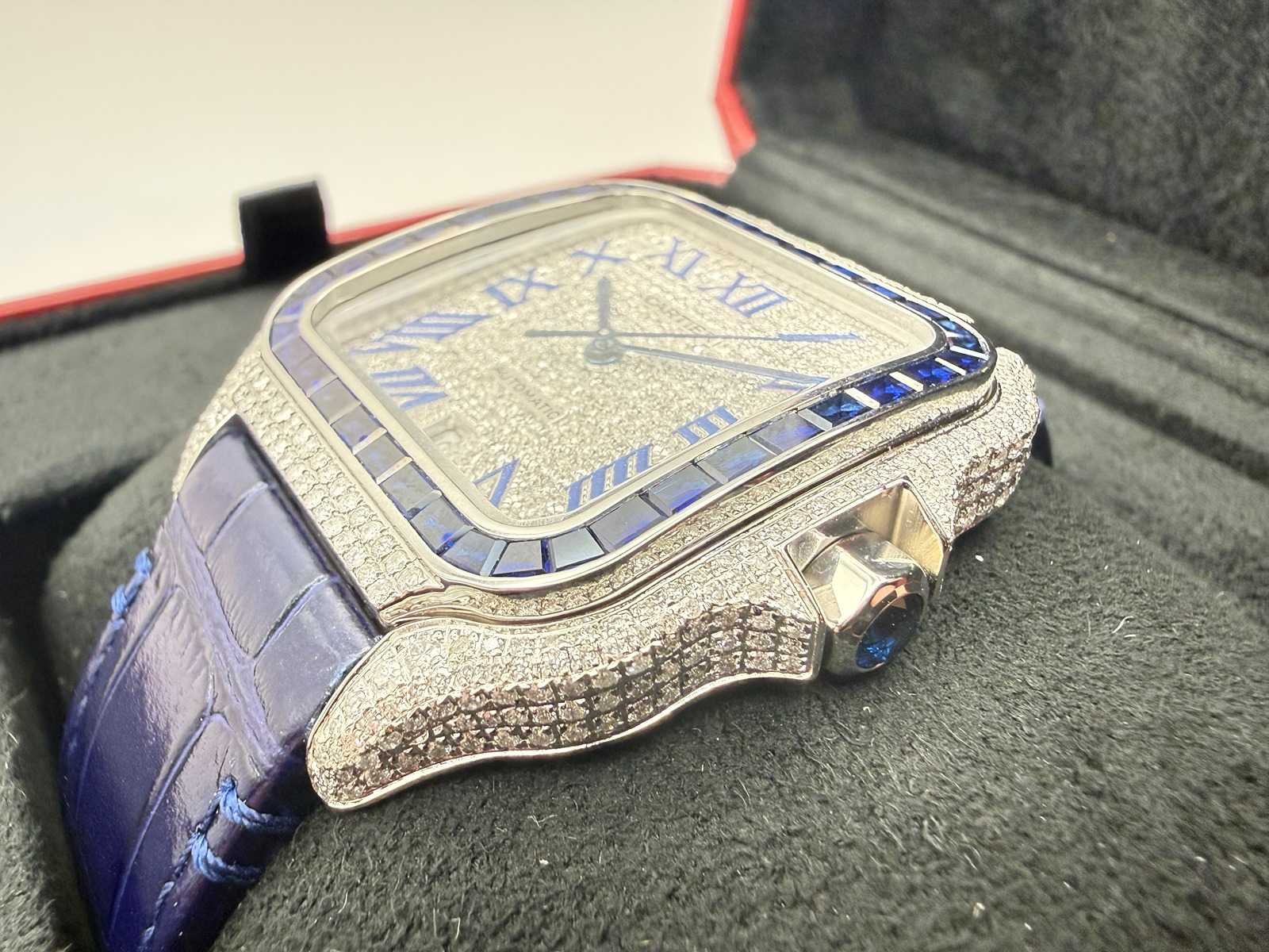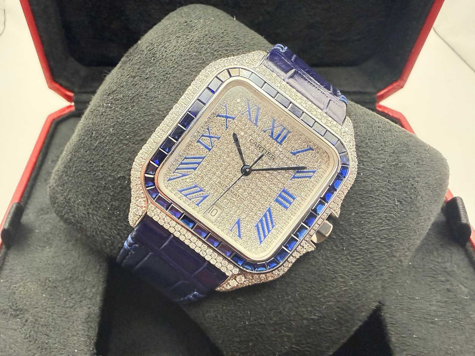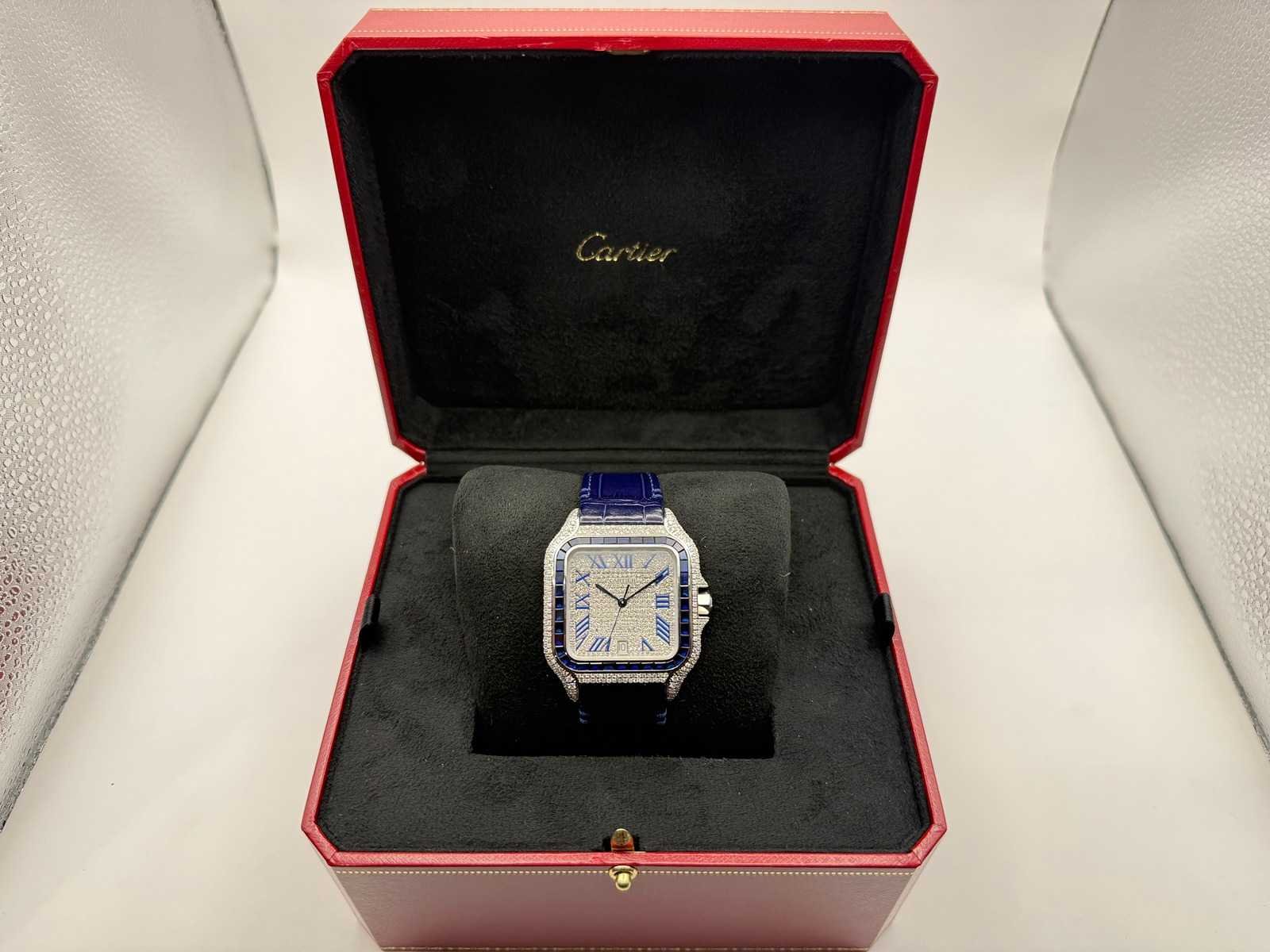 Key Features: Model: Cartier Santos "Large" Condition: Unworn Documents: No Diamonds: Natural Case & dial: Fully iced out Strap: Blue Set: Comes with Cartier box Please note: this is a customised watch, meaning it may include components that differ from the original factory specifications. Customisation can vary widely, so we highlight the following possibilities for full transparency: Aftermarket parts The watch may include third-party components (such as bezels, dials, hands, crystals or gem settings) that are not produced by the brand owner. These parts are often added for aesthetic reasons, but are not considered original by the manufacturer. Original parts from other models Some components (e.g. dials or bracelets) may have been sourced from other genuine watches by the same brand. While these parts are authentic, they were not originally fitted to this particular model or reference, which may affect collectability or eligibility for manufacturer service. Non-original parts In some cases, customised watches may include parts that are neither original nor manufactured by the brand. These components can affect the watch’s value. We encourage all bidders to carefully review the photos and description before placing a bid. Keep in mind: customised watches may not be eligible for official service or warranty from the brand. All bids should be placed with full awareness of the customisation status described above. Merk: Cartier Model: Santos "Large" Bouwjaar: 2024 Referentienummer: WSSA0018 Materiaal kast: Steel / Diamonds Materiaal horlogeband: Blue Leather Strap Materiaal sluiting: Steel / Diamonds Wijzerplaat: Diamonds Kastmaat: 39 mm