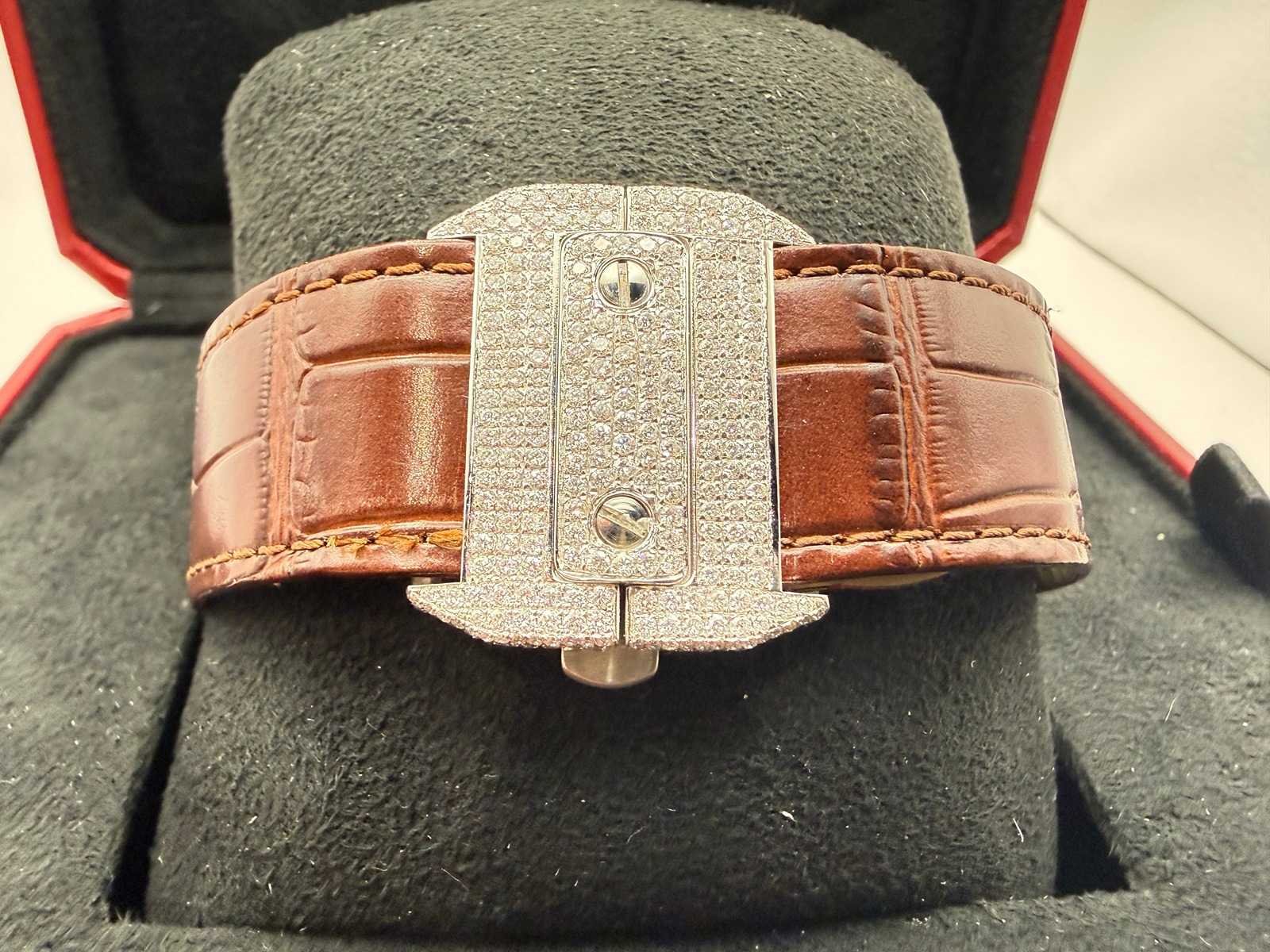 Model: Cartier Santos 100 XL Case: Fully iced out Diamonds: 12.5 carats lab-grown VVS diamonds Documents: No Strap: Brown leather strap Style: Bold luxury statement watch Condition: Excellent / unworn Comes with a Box Please note: this is a customised watch, meaning it may include components that differ from the original factory specifications. Customisation can vary widely, so we highlight the following possibilities for full transparency: Aftermarket parts The watch may include third-party components (such as bezels, dials, hands, crystals or gem settings) that are not produced by the brand owner. These parts are often added for aesthetic reasons, but are not considered original by the manufacturer. Original parts from other models Some components (e.g. dials or bracelets) may have been sourced from other genuine watches by the same brand. While these parts are authentic, they were not originally fitted to this particular model or reference, which may affect collectability or eligibility for manufacturer service. Non-original parts In some cases, customised watches may include parts that are neither original nor manufactured by the brand. These components can affect the watch’s value. We encourage all bidders to carefully review the photos and description before placing a bid. Keep in mind: customised watches may not be eligible for official service or warranty from the brand. All bids should be placed with full awareness of the customisation status described above. Merk: Cartier Model: Santos 100 XL Bouwjaar: 2022 Materiaal kast: Steel / Diamonds Materiaal horlogeband: Brown Leather Strap Materiaal sluiting: Steel / Diamonds Wijzerplaat: Diamonds Kastmaat: 38 mm