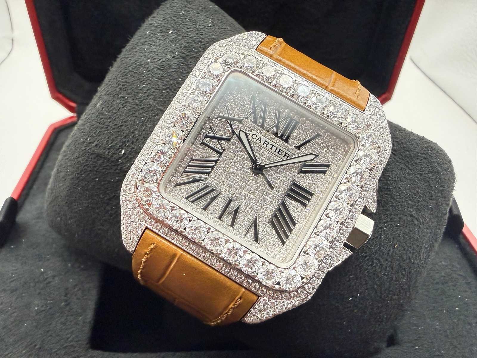 Model: Cartier Santos 100 XL Case: Fully iced out Diamonds: 12.5 carats lab-grown VVS diamonds Documents: No Strap: Light Brown leather strap Style: Bold luxury statement watch Condition: Excellent / unworn Comes with a Box Please note: this is a customised watch, meaning it may include components that differ from the original factory specifications. Customisation can vary widely, so we highlight the following possibilities for full transparency: Aftermarket parts The watch may include third-party components (such as bezels, dials, hands, crystals or gem settings) that are not produced by the brand owner. These parts are often added for aesthetic reasons, but are not considered original by the manufacturer. Original parts from other models Some components (e.g. dials or bracelets) may have been sourced from other genuine watches by the same brand. While these parts are authentic, they were not originally fitted to this particular model or reference, which may affect collectability or eligibility for manufacturer service. Non-original parts In some cases, customised watches may include parts that are neither original nor manufactured by the brand. These components can affect the watch’s value. We encourage all bidders to carefully review the photos and description before placing a bid. Keep in mind: customised watches may not be eligible for official service or warranty from the brand. All bids should be placed with full awareness of the customisation status described above. Merk: Cartier Model: Santos 100 XL Bouwjaar: 2022 Materiaal kast: Steel / Diamonds Materiaal horlogeband: Light Brown Leather Strap Materiaal sluiting: Steel / Diamonds Wijzerplaat: Diamonds Kastmaat: 38 mm