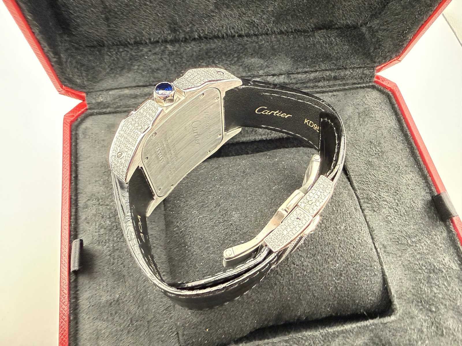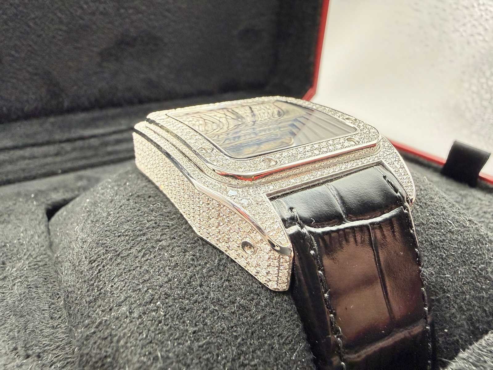 Model: Cartier Santos 100 Medium Case & Dial: Fully iced out with real genuine natural VS diamonds Bezel: Moissanite baguette stones Documents: No Strap: High-quality leather strap Condition: Custom luxury piece Style: Exclusive, bold, and elegant Please note: this is a customised watch, meaning it may include components that differ from the original factory specifications. Customisation can vary widely, so we highlight the following possibilities for full transparency: Aftermarket parts The watch may include third-party components (such as bezels, dials, hands, crystals or gem settings) that are not produced by the brand owner. These parts are often added for aesthetic reasons, but are not considered original by the manufacturer. Original parts from other models Some components (e.g. dials or bracelets) may have been sourced from other genuine watches by the same brand. While these parts are authentic, they were not originally fitted to this particular model or reference, which may affect collectability or eligibility for manufacturer service. Non-original parts In some cases, customised watches may include parts that are neither original nor manufactured by the brand. These components can affect the watch’s value. We encourage all bidders to carefully review the photos and description before placing a bid. Keep in mind: customised watches may not be eligible for official service or warranty from the brand. All bids should be placed with full awareness of the customisation status described above. Merk: Cartier Model: Santos 100 XL Bouwjaar: 2022 Referentienummer: 2656 Materiaal kast: Diamonds Materiaal horlogeband: Leer Materiaal sluiting: Diamonds Wijzerplaat: Diamonds Kastmaat: 38 mm