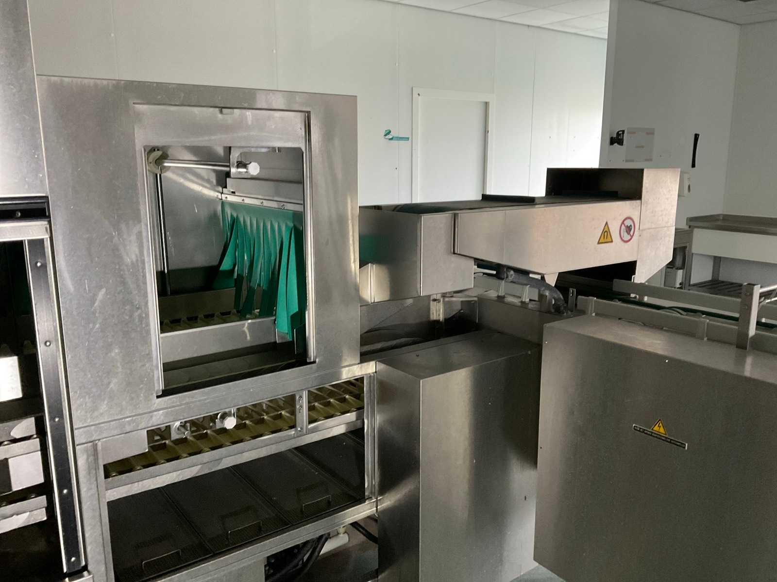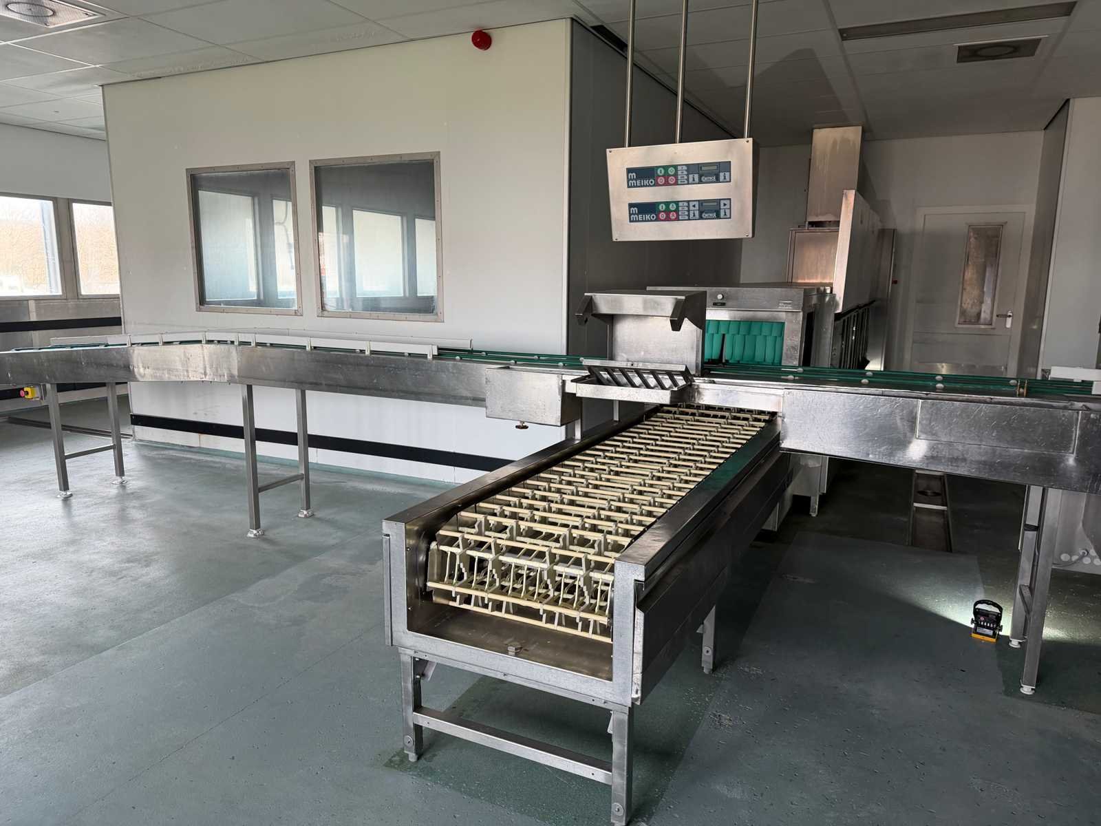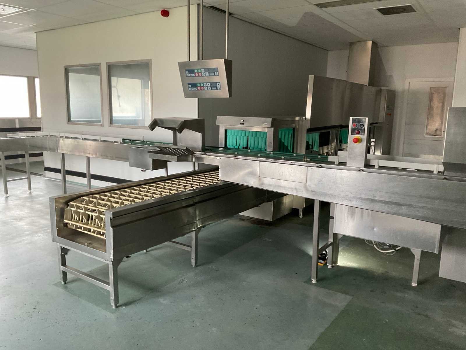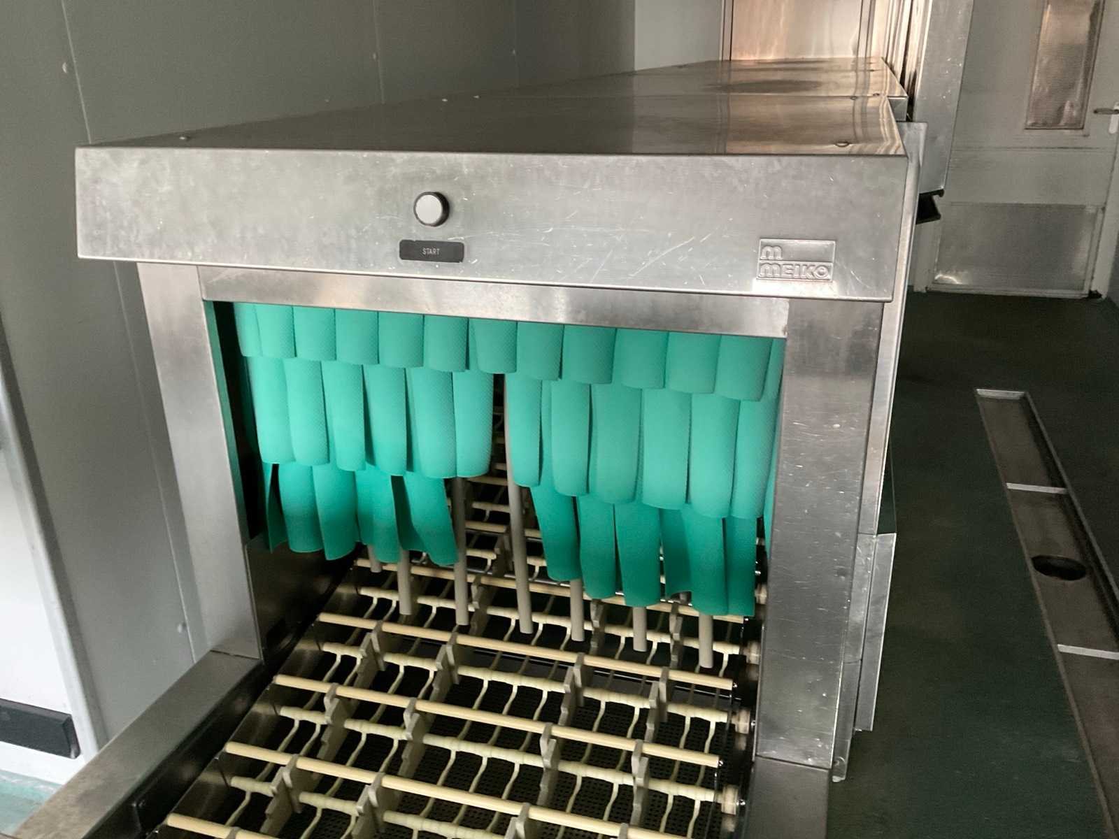 De installatie is opgebouwd uit meerdere functionele zones: Invoerzone met CSS-Top voorspoelsysteem, Voorwaszone, 1e hoofdwaszone, 2e hoofdwaszone, CSS-Plus zone, Naspoelzone, Afblaas-/droogzone, Uitvoerzone; Voorzien van: Uitgerust met Meiko Clean-Control diagnosesysteem voor procesbewaking, temperatuur controle, storingsmelding en bedrijfs urenregistratie; de installatie beschikt over energie-terugwinning via condensorblok, geïntegreerde naspoelboiler en droogzone met ventilatorunit. Transportsnelheid instelbaar in 3 snelheden (ca. 1,8 meter per minuut); Technische gegevens volgens documentatie: Totale lengte installatie ca. 9.100 mm, Nuttige bandbreedte ca. 620 mm, Tankvulling ca. 410 liter (60°C), Naspoelwaterverbruik ca. 380 liter per uur, Watertoevoer DN 20 (2,5 – 5 bar), Waterafvoer DN 100, Bouwkundige afzuigcapaciteit ca. 1.500 m³ per uur, Totale aansluitwaarde ca. 65 kW (125 Ampère), Uitvoering volledig in RVS 304; De installatie verkeert in gebruikte staat met normale gebruikssporen passend bij professionele inzet. Installatie is niet draaiend getest; kavel dient volledig gedemonteerd te worden; demontage en transport volledig voor rekening en risico van koper; Merk: Meiko Model: BA 521 PHA-2S / CSS Top (AZP 80 lijn) Vermogen: 56000W Spanning: 400V