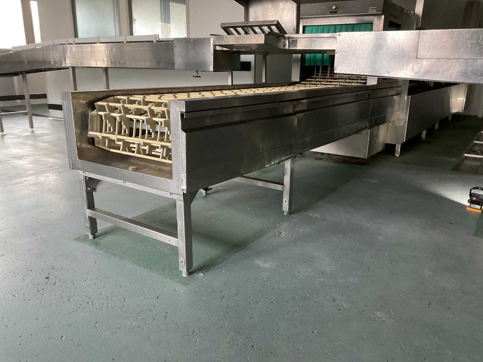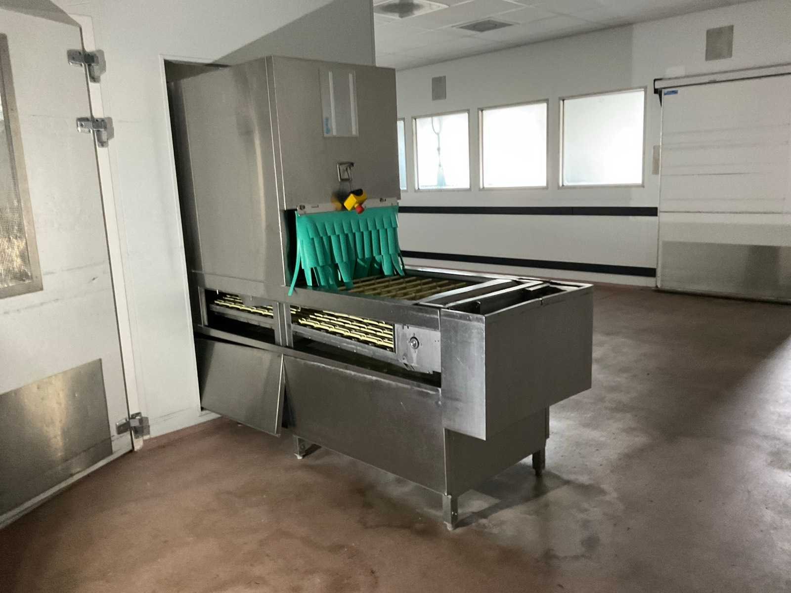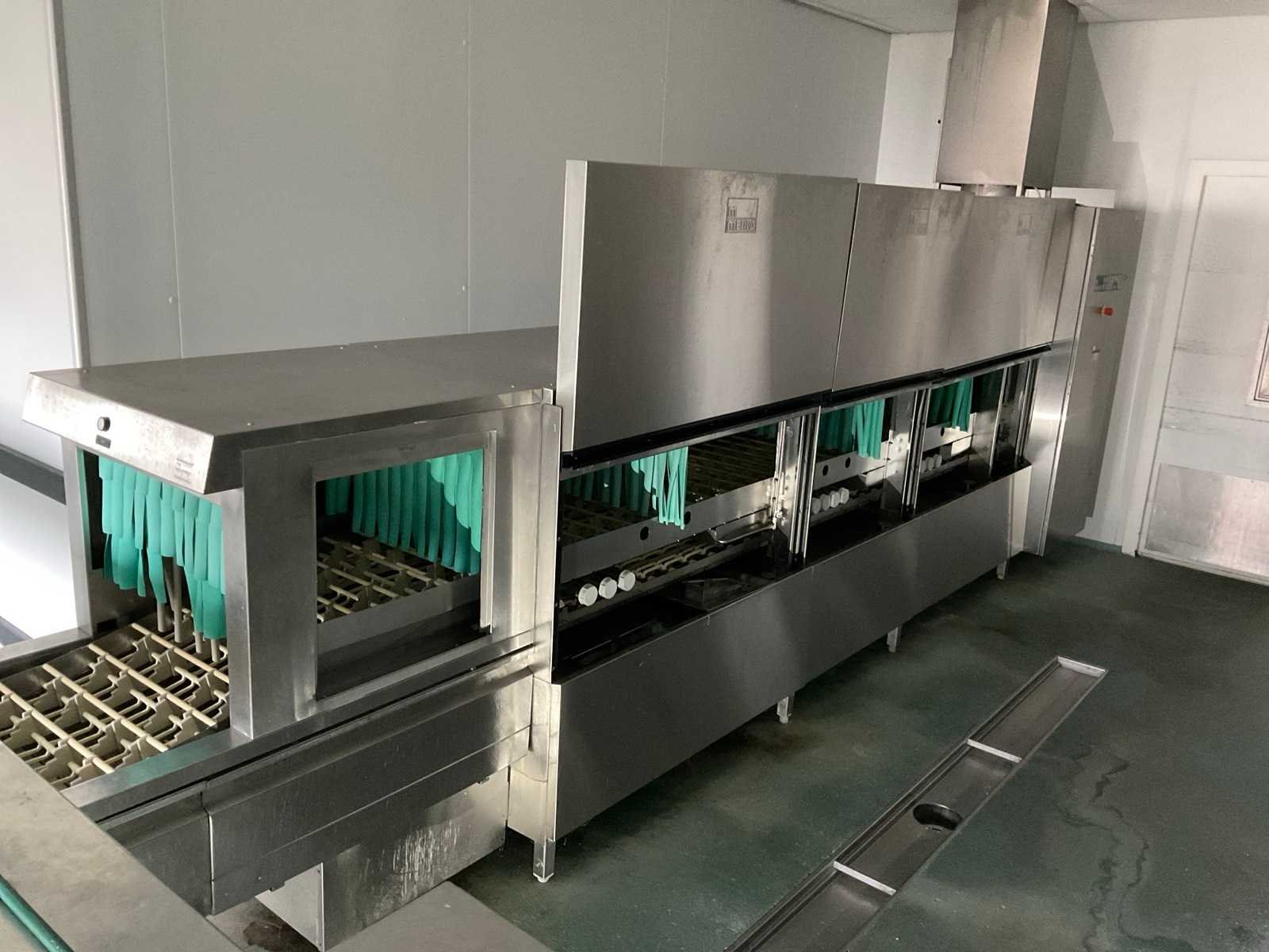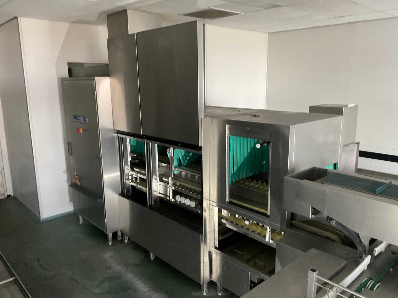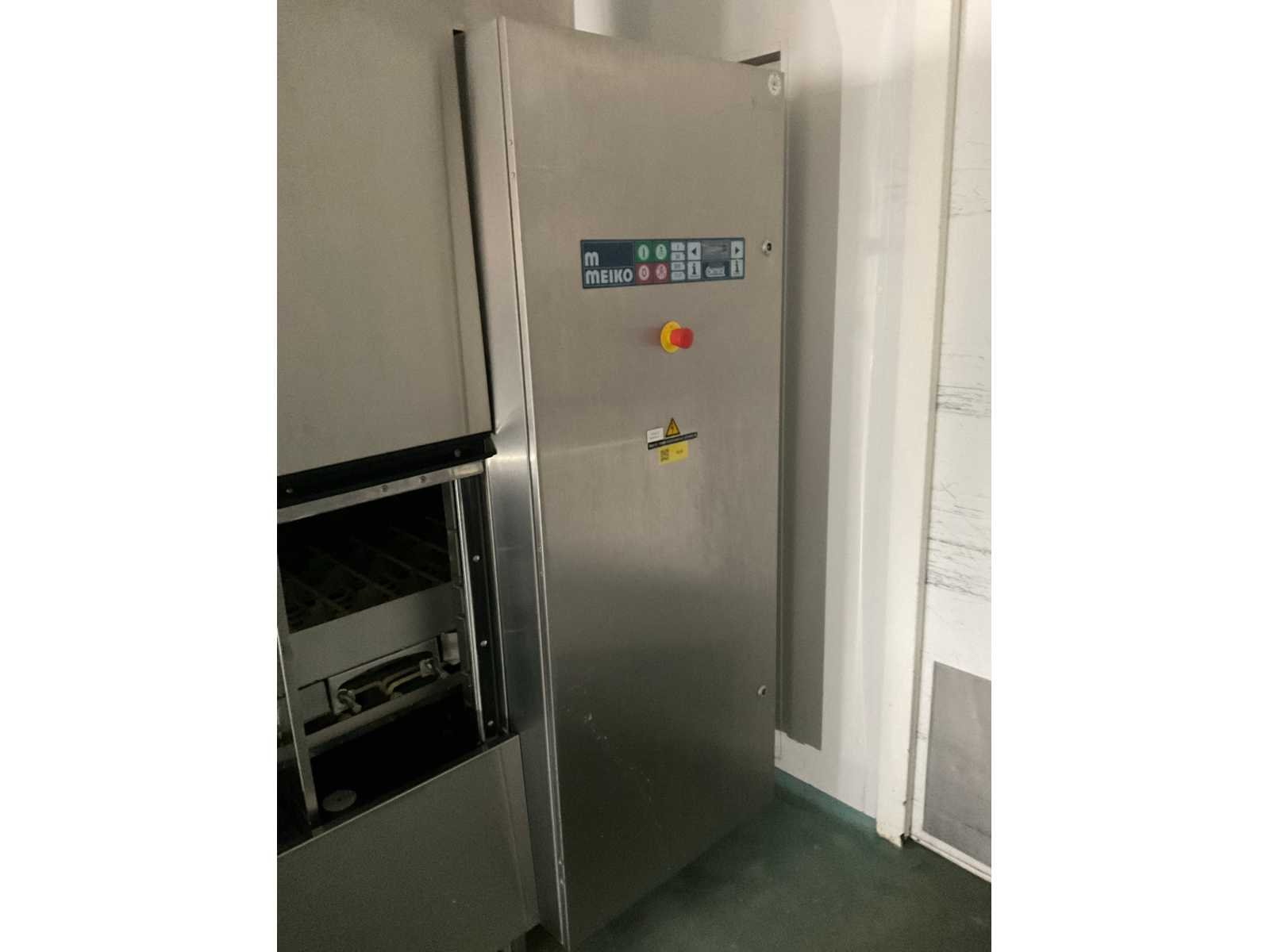 De installatie is opgebouwd uit meerdere functionele zones: Invoerzone met CSS-Top voorspoelsysteem, Voorwaszone, 1e hoofdwaszone, 2e hoofdwaszone, CSS-Plus zone, Naspoelzone, Afblaas-/droogzone, Uitvoerzone; Voorzien van: Uitgerust met Meiko Clean-Control diagnosesysteem voor procesbewaking, temperatuur controle, storingsmelding en bedrijfs urenregistratie; de installatie beschikt over energie-terugwinning via condensorblok, geïntegreerde naspoelboiler en droogzone met ventilatorunit. Transportsnelheid instelbaar in 3 snelheden (ca. 1,8 meter per minuut); Technische gegevens volgens documentatie: Totale lengte installatie ca. 9.100 mm, Nuttige bandbreedte ca. 620 mm, Tankvulling ca. 410 liter (60°C), Naspoelwaterverbruik ca. 380 liter per uur, Watertoevoer DN 20 (2,5 – 5 bar), Waterafvoer DN 100, Bouwkundige afzuigcapaciteit ca. 1.500 m³ per uur, Totale aansluitwaarde ca. 65 kW (125 Ampère), Uitvoering volledig in RVS 304; De installatie verkeert in gebruikte staat met normale gebruikssporen passend bij professionele inzet. Installatie is niet draaiend getest; kavel dient volledig gedemonteerd te worden; demontage en transport volledig voor rekening en risico van koper; Merk: Meiko Model: BA 521 PHA-2S / CSS Top (AZP 80 lijn) Vermogen: 56000W Spanning: 400V