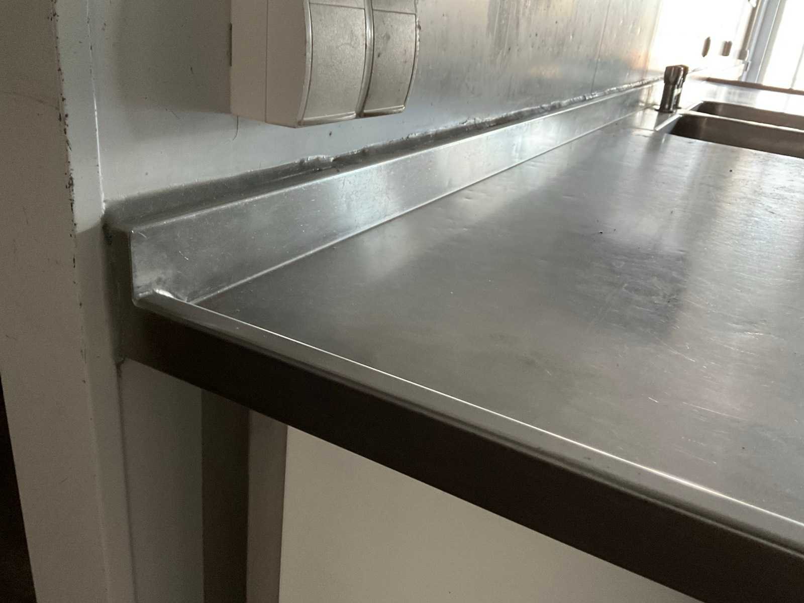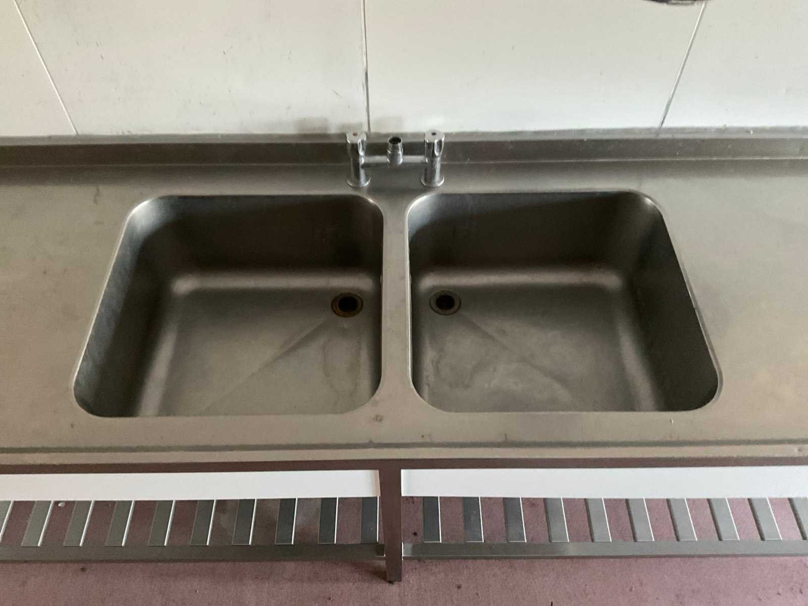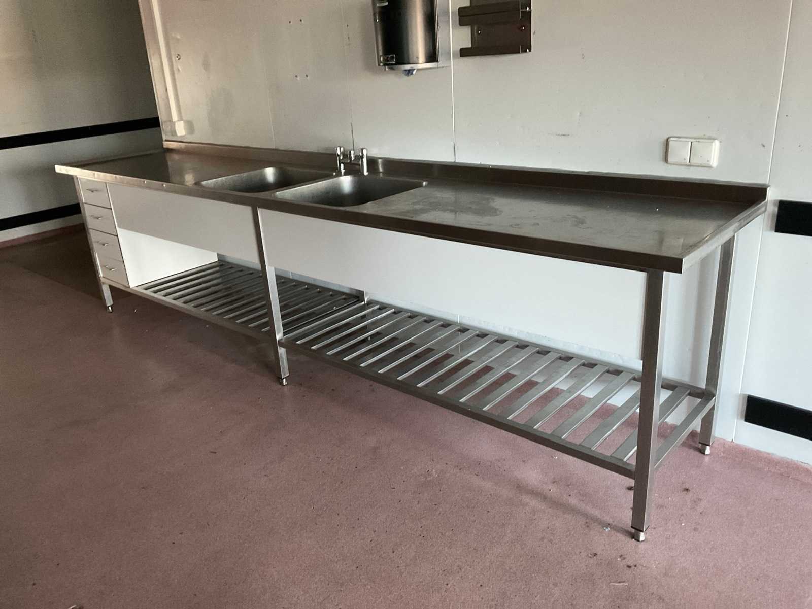 Voorzien van: dubbele wasbak 500x500x250mm; Demontage en transport volledig voor rekening en risico van koper; Totale afmeting L: 3500mm Totale afmeting Breedte: 700mm Totale afmeting Hoogte: 910mm