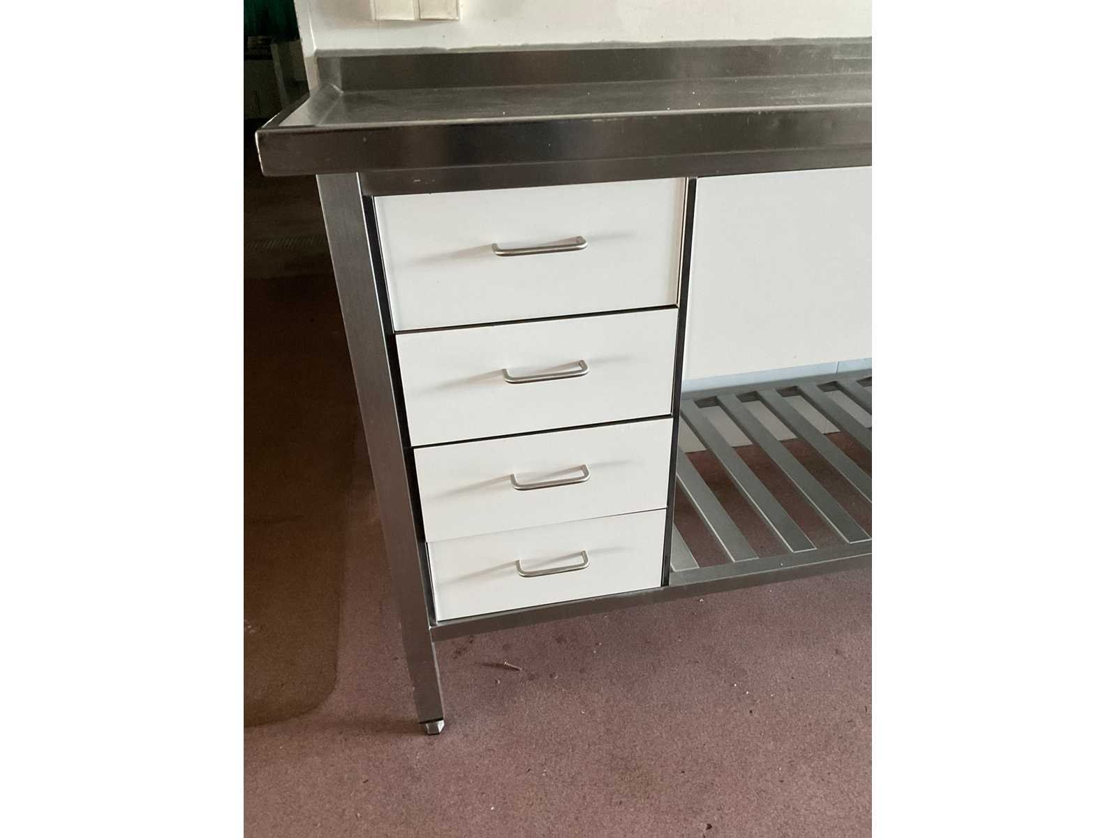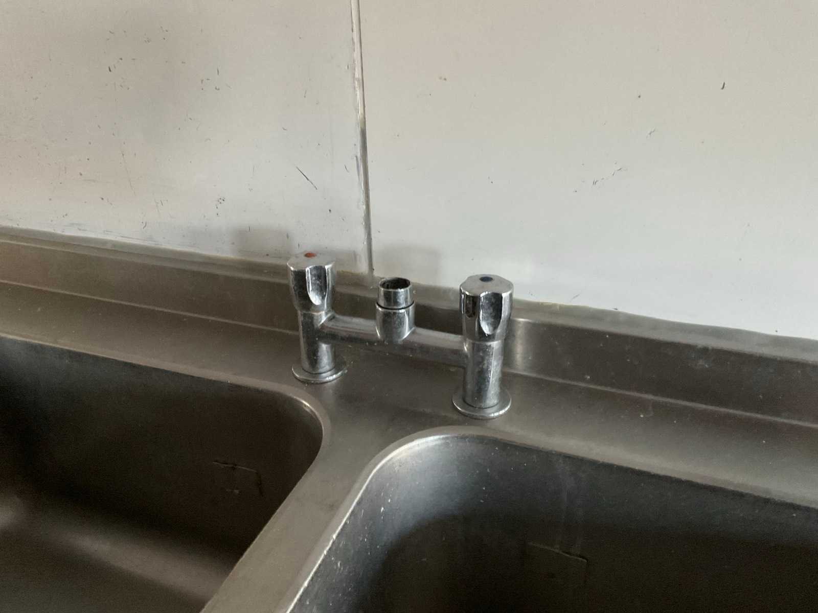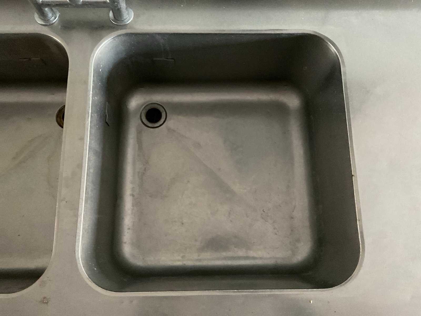 Voorzien van: dubbele wasbak 500x500x250mm; Demontage en transport volledig voor rekening en risico van koper; Totale afmeting L: 3500mm Totale afmeting Breedte: 700mm Totale afmeting Hoogte: 910mm